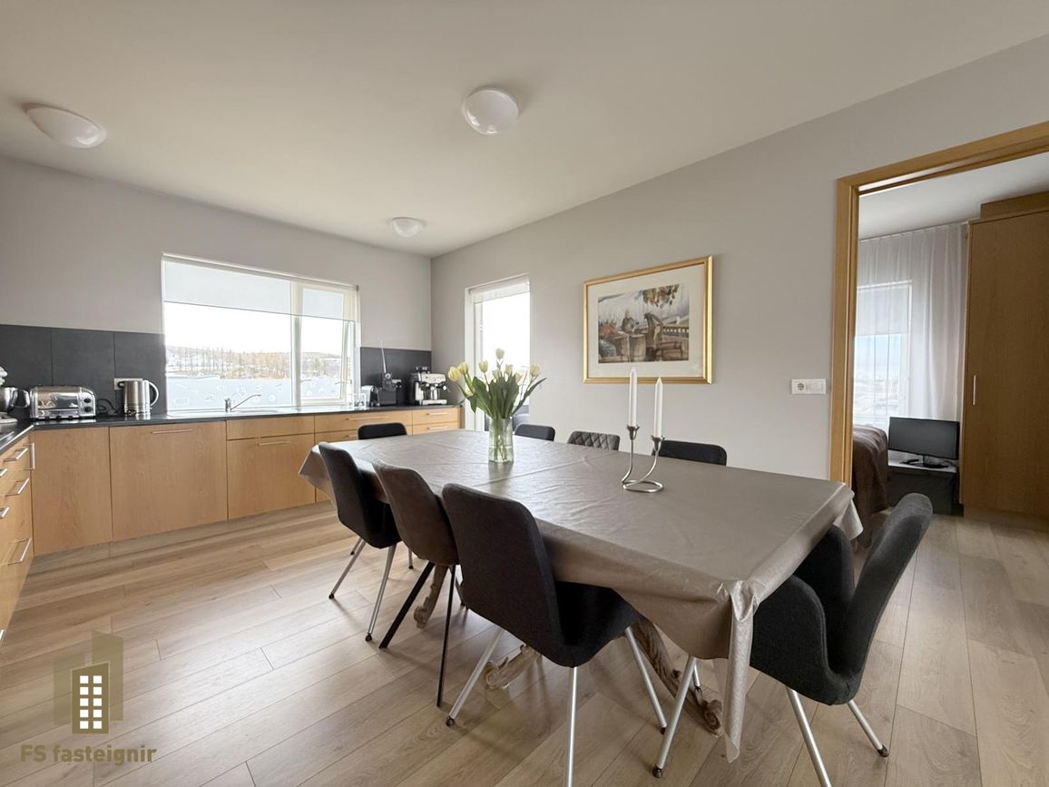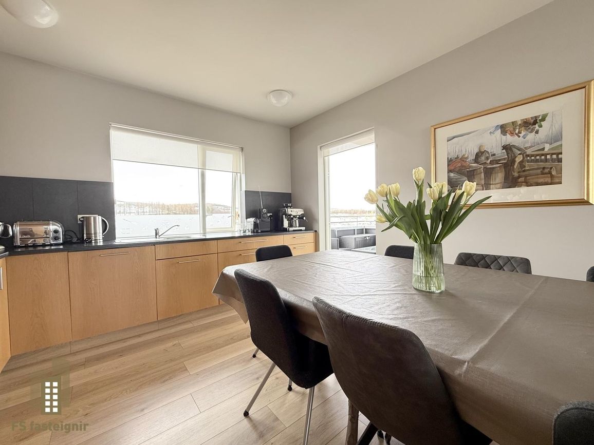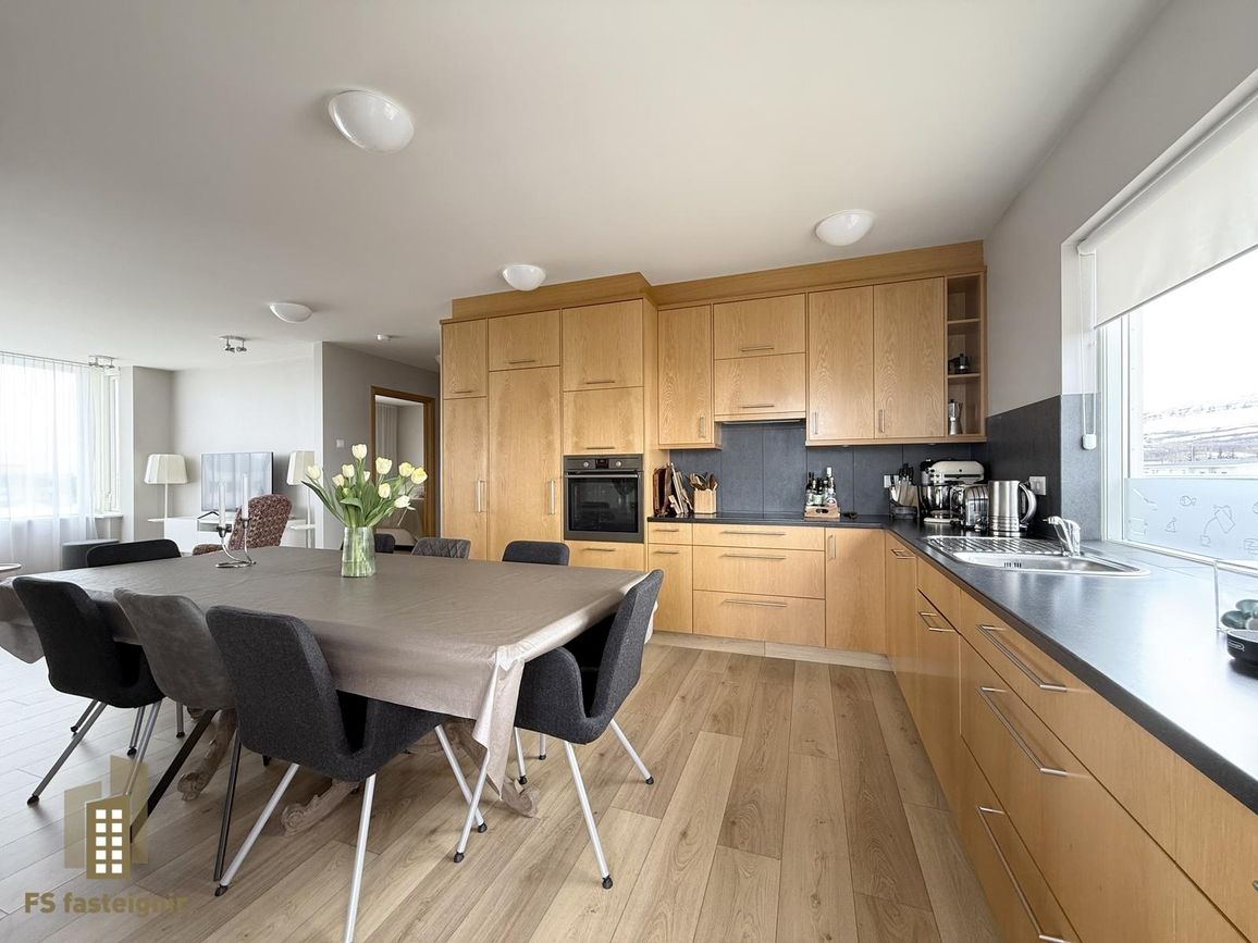 Eldhús/borðstofa er í opnu og björtu rými þaðan sem er mjög gott útsýni. Harðparket á gólfum eikarinnrétting sem er mjög rúmgóð með dökkum borðplötum og flísum milli efri og neðri skápa, innbyggð uppþvottavél, innbyggður ísskápur og bakaraofn í vinnuhæð. Úr eldhúsi er útgengt á rúmgóðar svalir sem snúa til vesturs með útsýni.