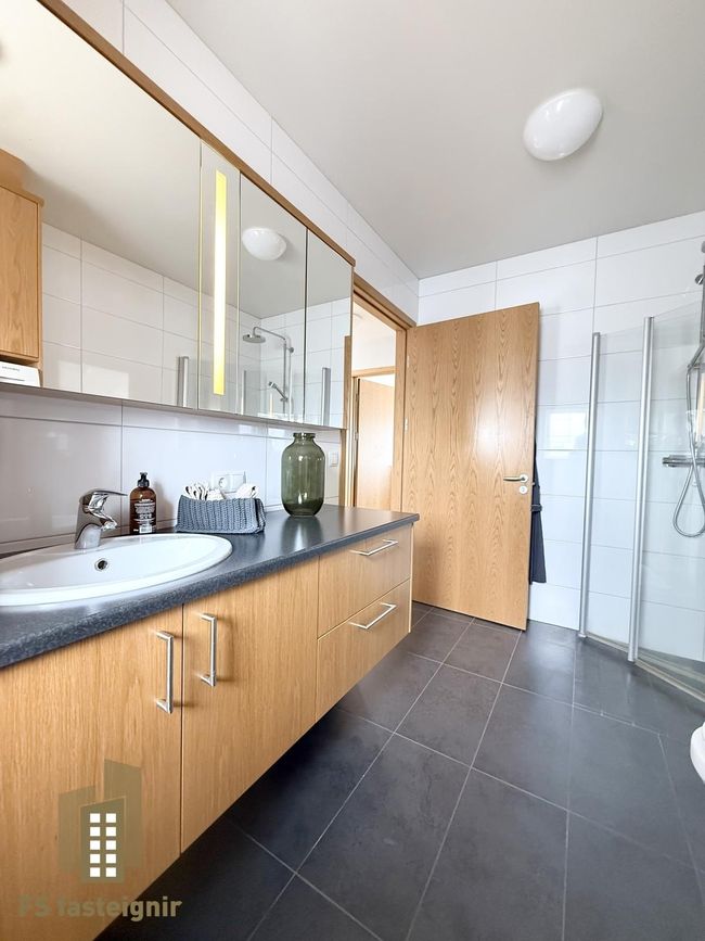 Baðherbergi er mjög rúmgott með ljósum flísum á veggjum og dökkum á gólfi. Rúmgóð eikarinnrétting, einnig er innrétting fyrir þvottavél og þurrkara. Upphengt salerni, sturta með glerhurð, opnanlegur gluggi.