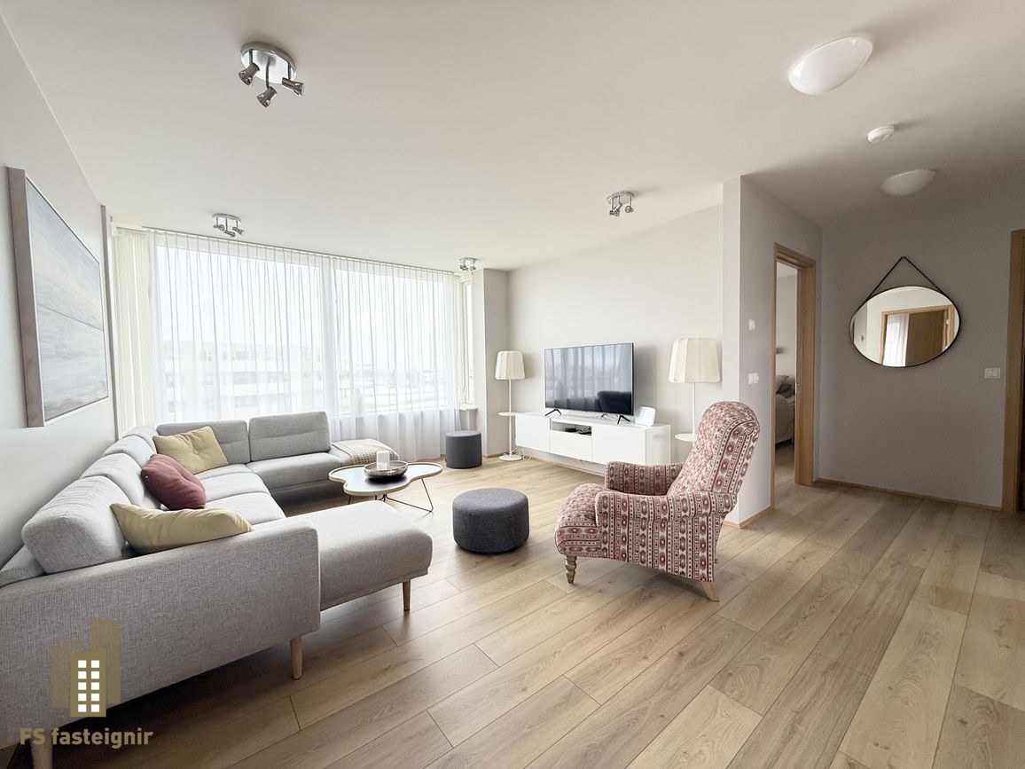 Stofa mjög björt, harðparketi á gólfi, stór gluggi með útsýni.