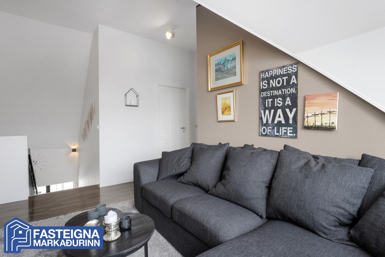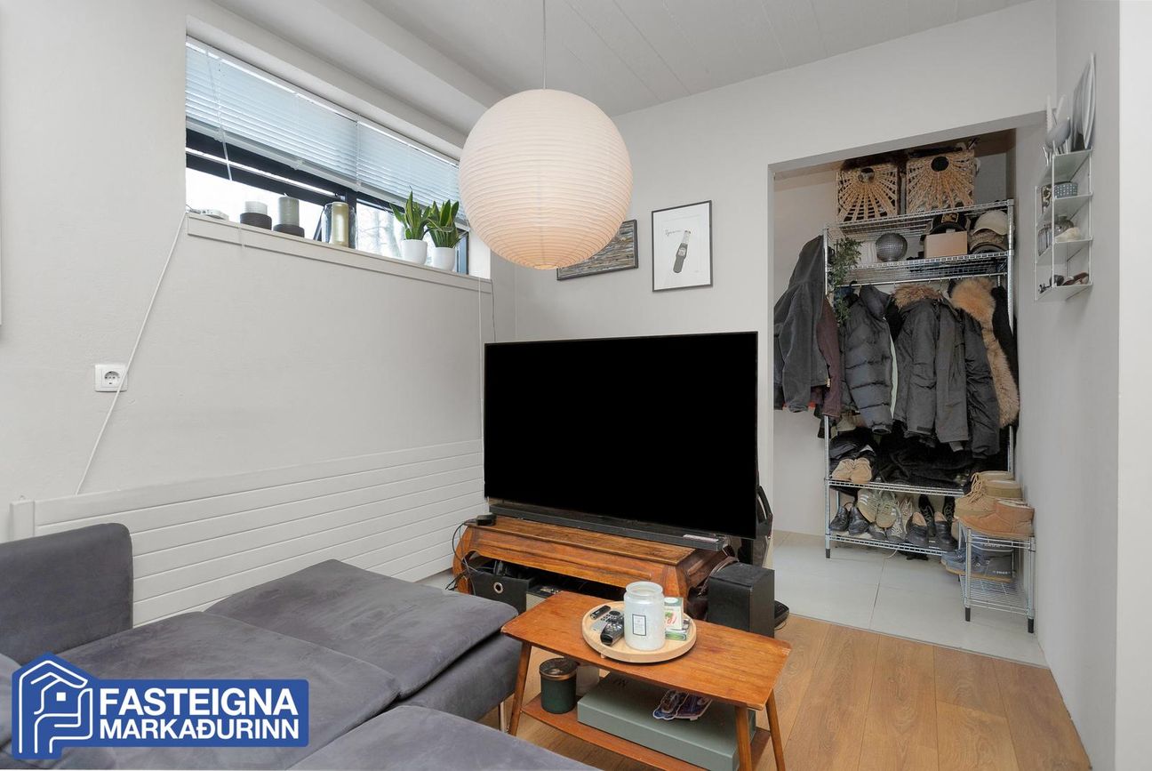 Stofa, parketlögð, björt og rúmgóð.