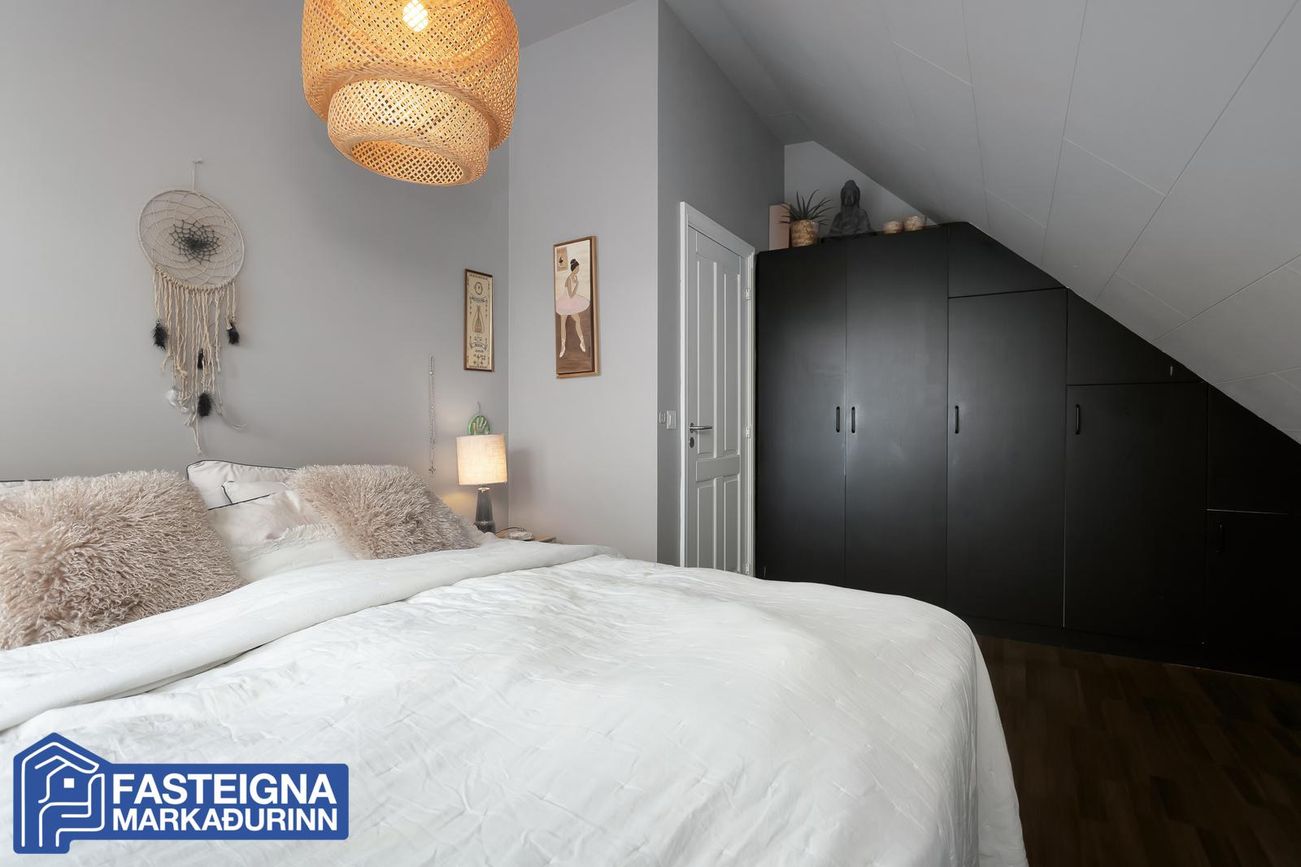Gengið er upp á efri hæð hússins um fallegan teppalagðan stiga. Aukin lofthæð er á hluta efri hæð hússins og einnig er hluti undir súð þannig að gólfflötur er stærri en uppgefið er í fermetrafjölda.Efri hæð,Gangur, parketlagður.