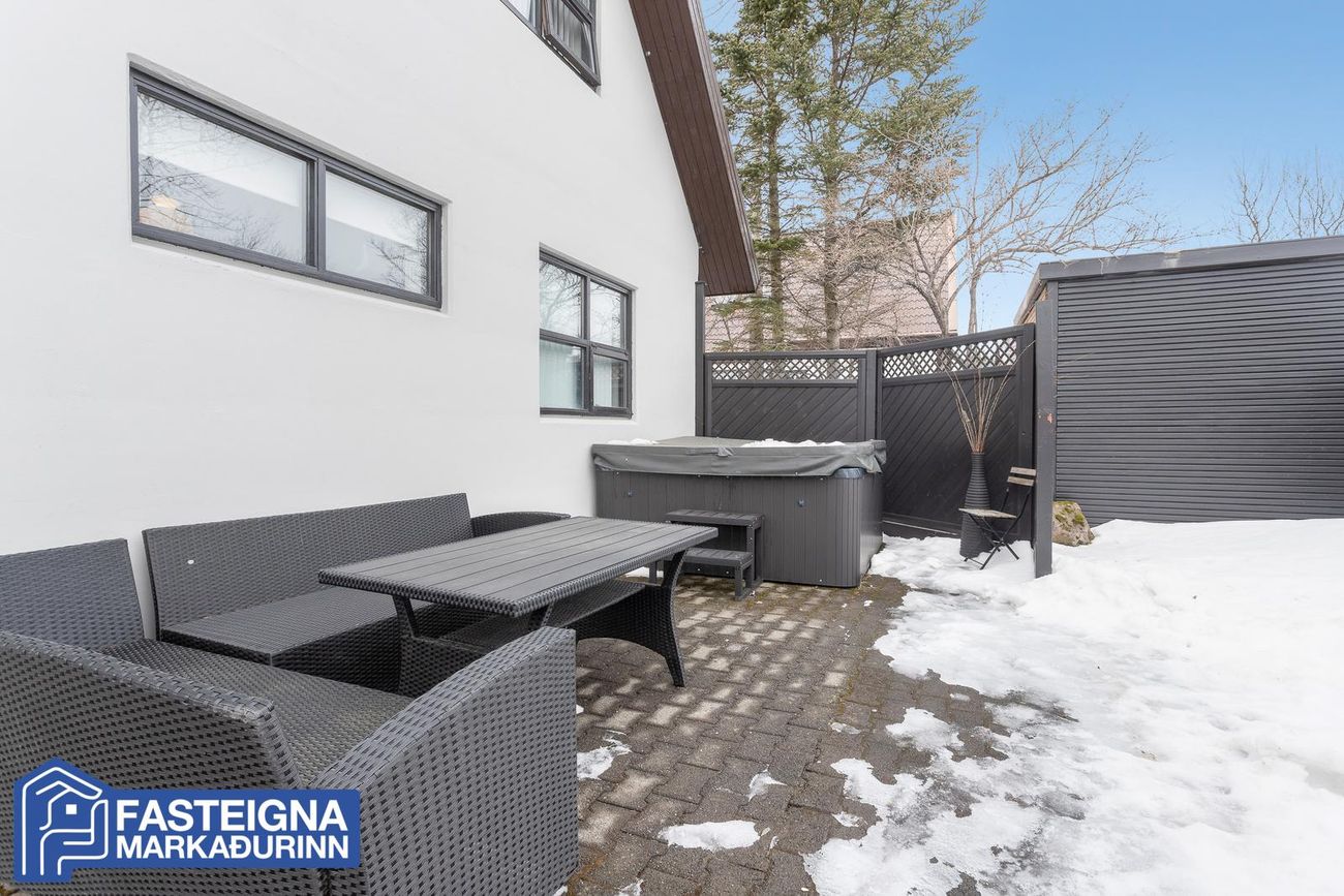Eignin stendur á 680,0 fermetra lóð sem er með hellulögnum að framan með heitum potti, hellulögðu bílaplani og upphituðu bílaplani fyrir framan bílskúr, tveimur viðarveröndum, tyrfðum flötum og trjágróðri.