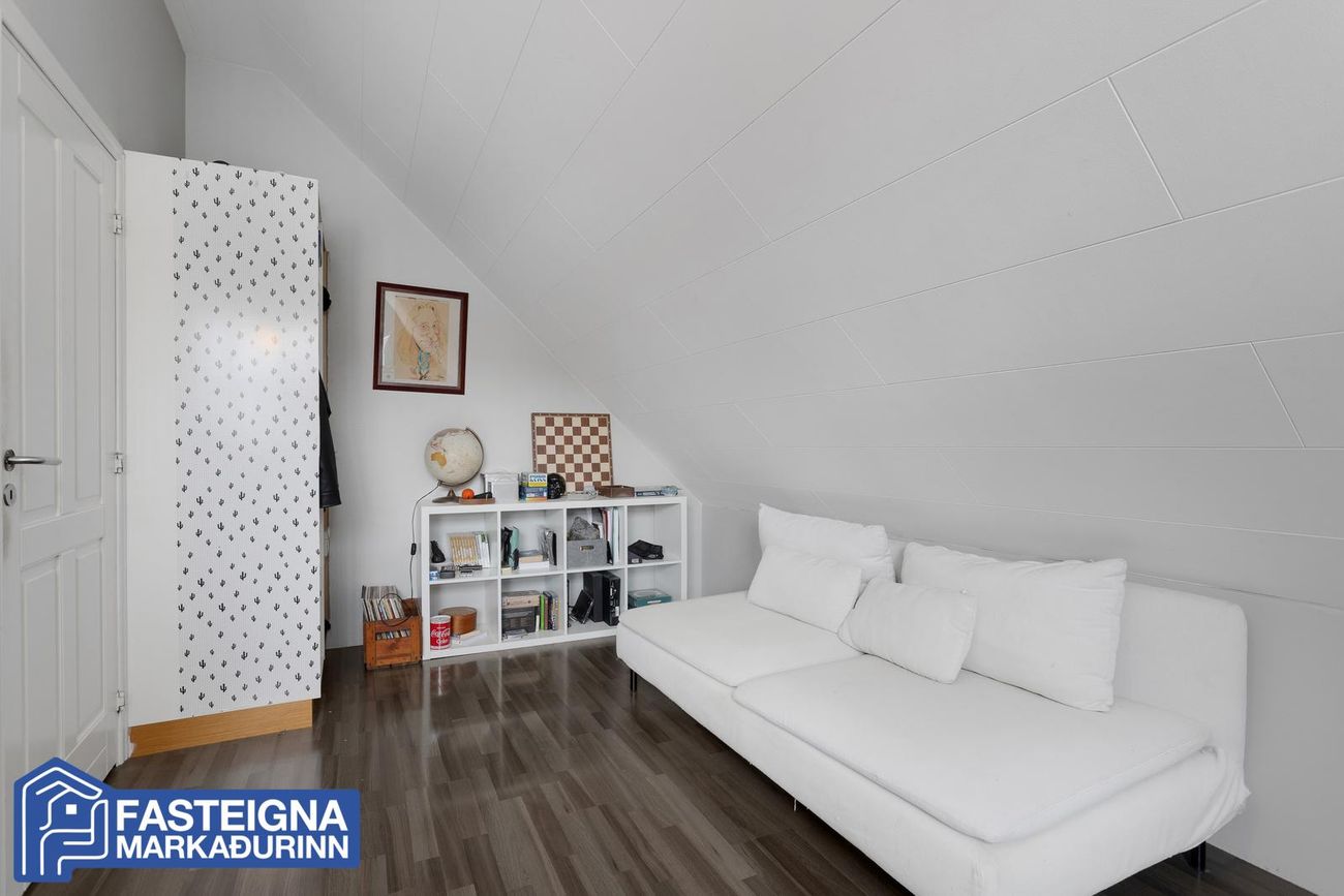 Gengið er upp á efri hæð hússins um fallegan teppalagðan stiga. Aukin lofthæð er á hluta efri hæð hússins og einnig er hluti undir súð þannig að gólfflötur er stærri en uppgefið er í fermetrafjölda.Efri hæð,Gangur, parketlagður.