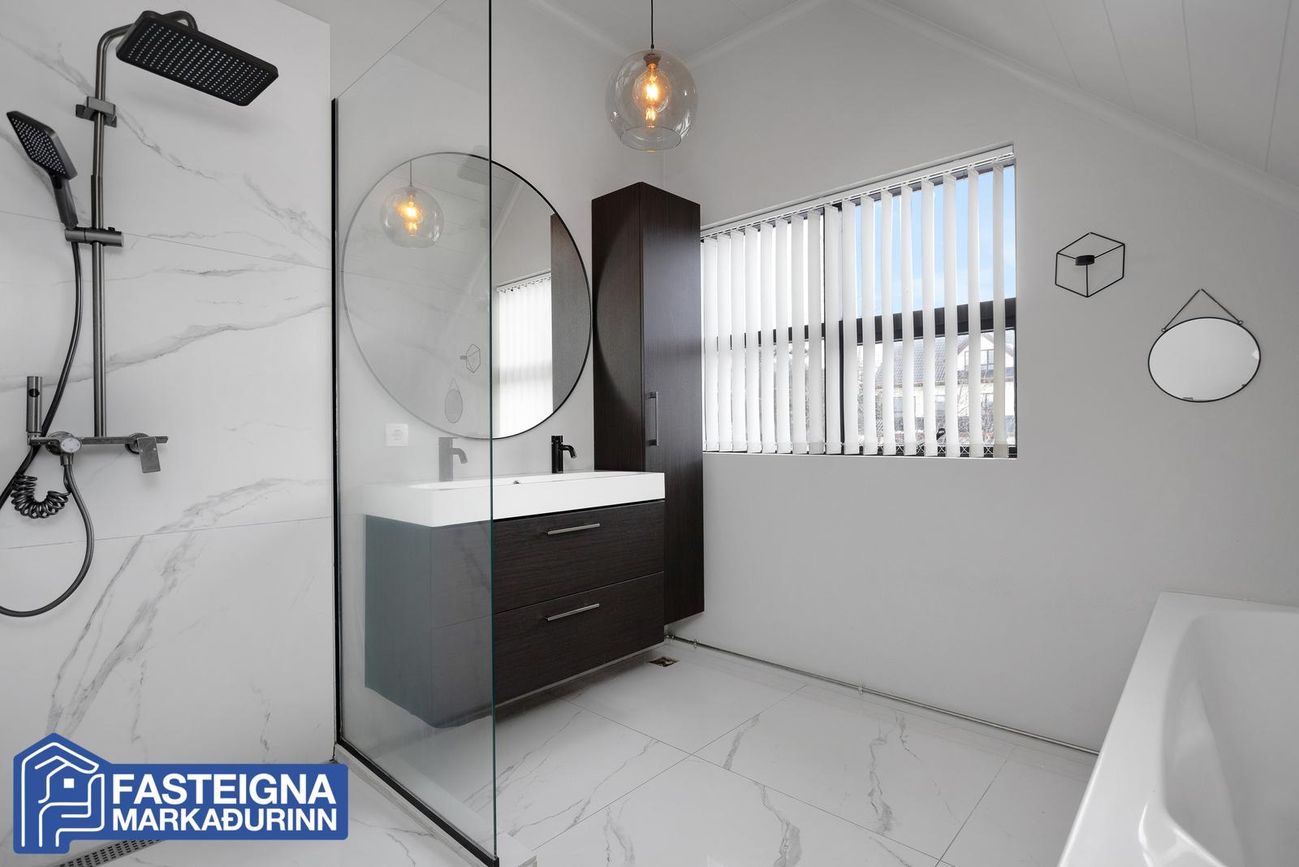 Eignin hefur verið mikið endurnýjað að undanförnu og var húsið var málað síðastliðið sumar og sett nýtt handrið á svalir hússins. Kaldavatnslagnir frá baðherbergi efri hæðar voru endurnýjaðar nýlega og nýtt parket var lagt á aðalhæðina ásamt því að endurbæta íbúð í bílskúr. Eignin skiptist þannig: á aðalhæð eru forstofa, svefnherbergi, hol, eldhús, borðstofa, stofa og gestasnyrting. Á efri hæð hússins eru sjónvarpskrókur, baðherbergi, hjónaherbergi og tvö barnaherbergi. Á jarðhæð suðvestan megin er bílskúr sem búið er að gera íbúð með sérinngangi og einnig er rúmgóð stúdíóíbúð með sérinngangi á jarðhæð. Möguleiki er á góðum leigutekjum.