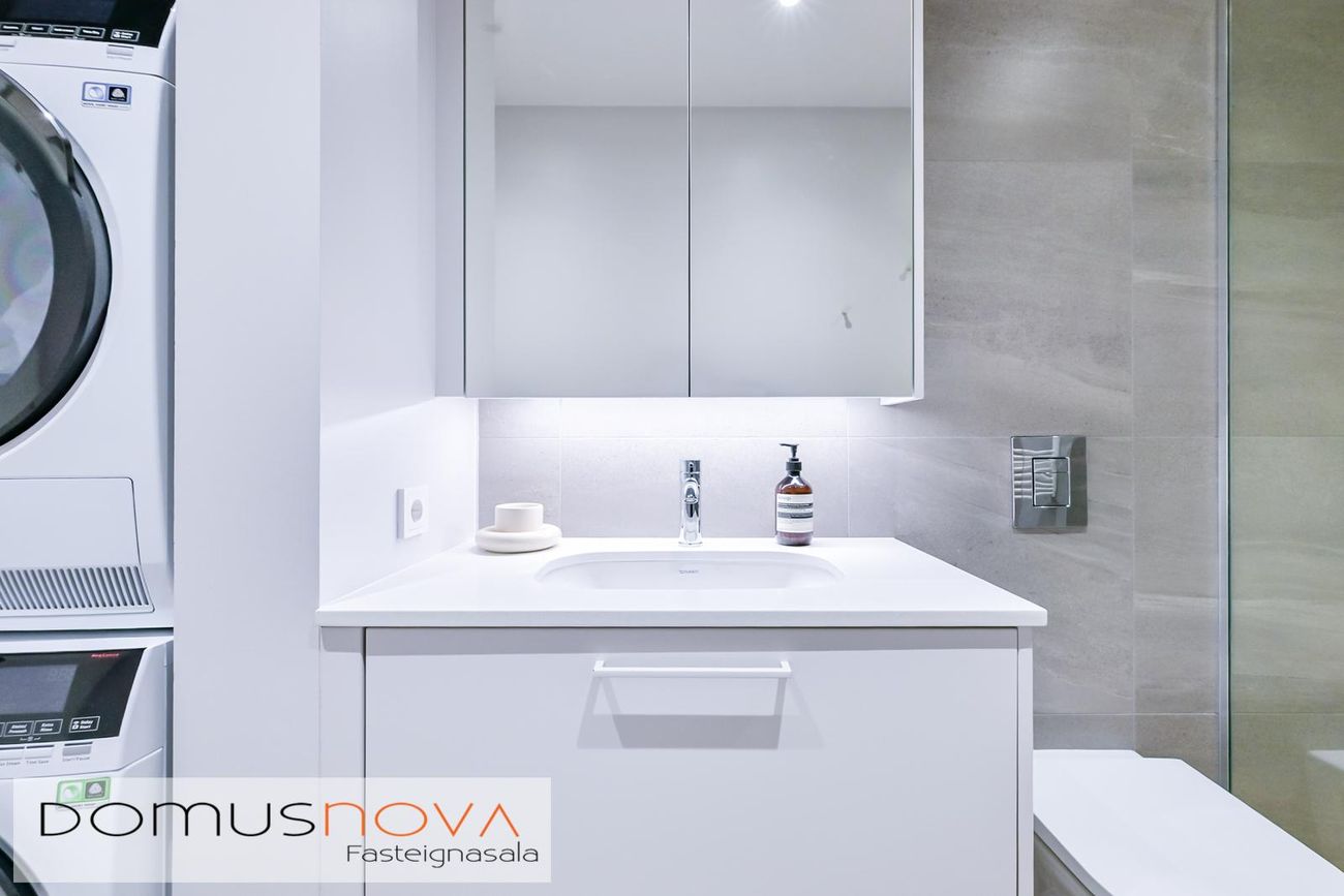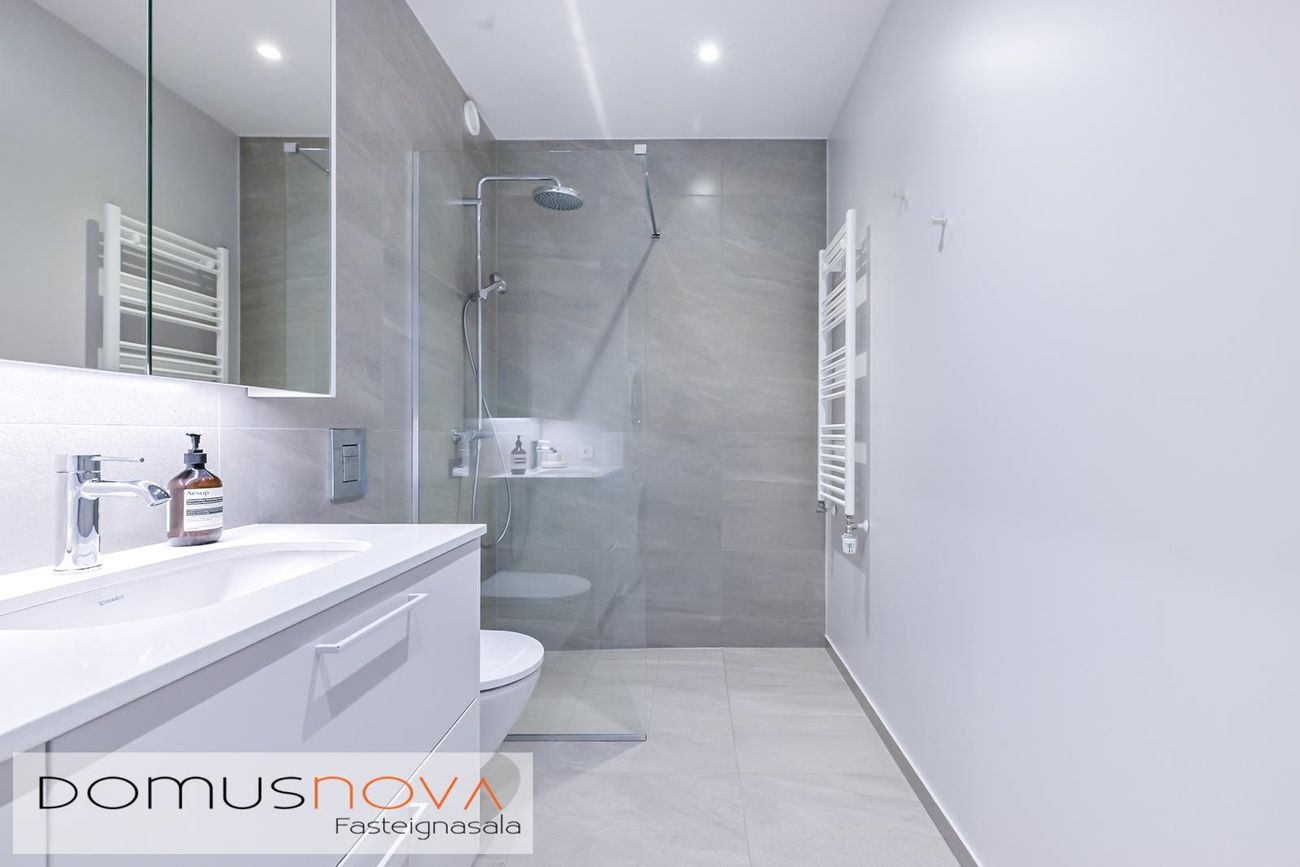 Baðherbergi flísalagt bæði gólf og hluti veggja. Vönduð innrétting með kvarts borðplötu. Tenging fyrir þvottavél og þurrkara í innréttingu á baði.