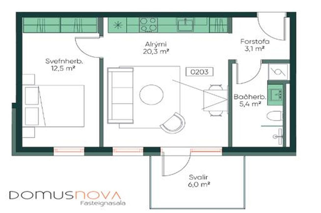 Jöfursbás 7B, Reykjavík - íbúð 0203. 2ja herbergja íbúð íbúð 54,9fm. á annari hæð í lokuðu stigahúsi, þar af geymsla 6,2fm. (merkt 0012) í kjallara. Íbúðin er skemmtilega hönnuð með góðu svefnherbergi. Svalir til vesturs út frá stofu með útsýni til sjávar.