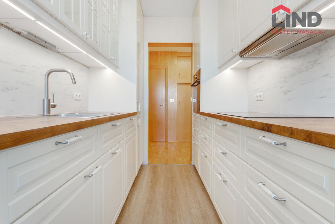 Eldhúsið er með innréttingu á tvo vegu með dúkflísum á milli skápa, innbyggðum ísskáp með frysti , og innbyggðri uppþvottavél, helluborð með viftu yfir, ofn í vinnuhæð.