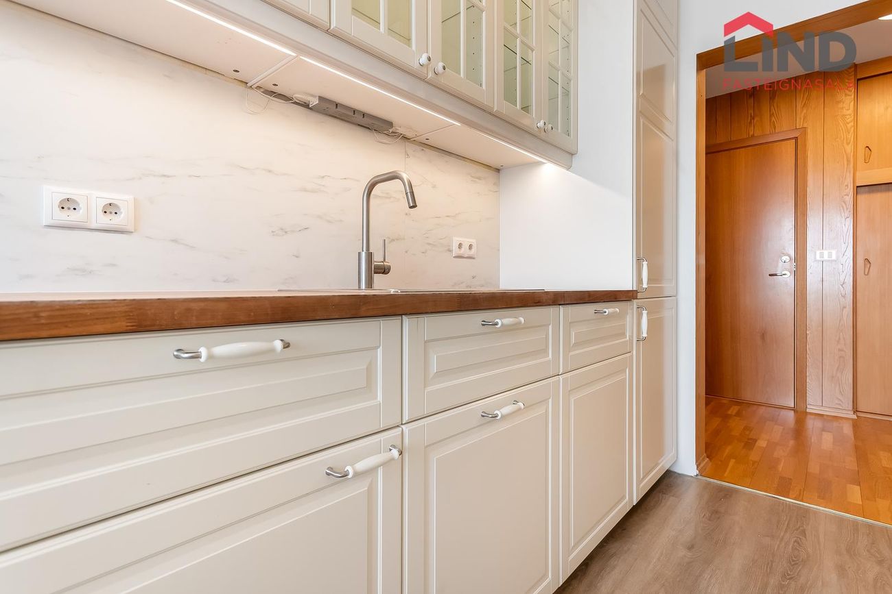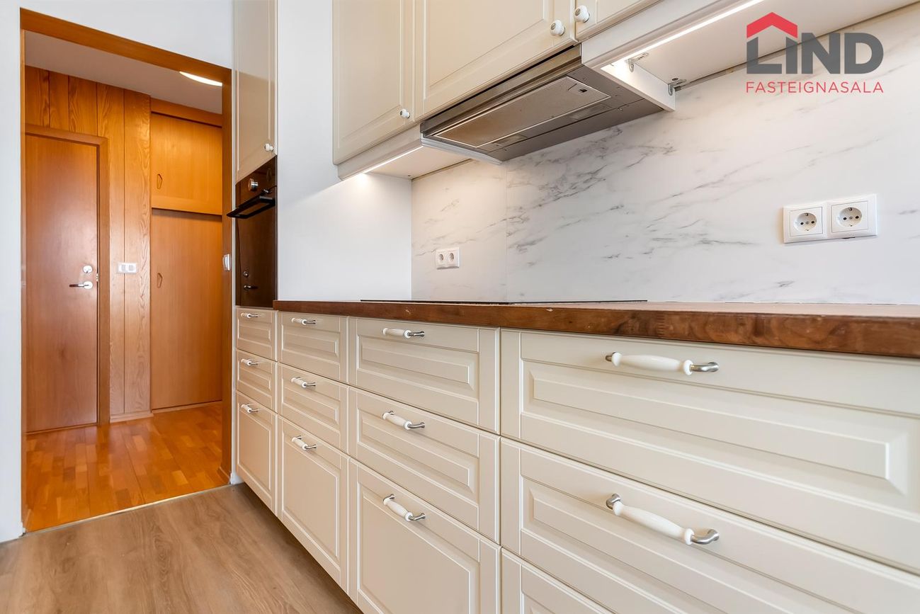 Eldhúsið er með innréttingu á tvo vegu með dúkflísum á milli skápa, innbyggðum ísskáp með frysti , og innbyggðri uppþvottavél, helluborð með viftu yfir, ofn í vinnuhæð.