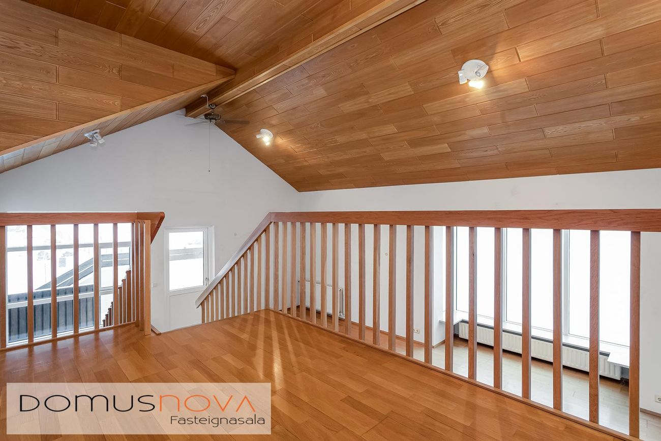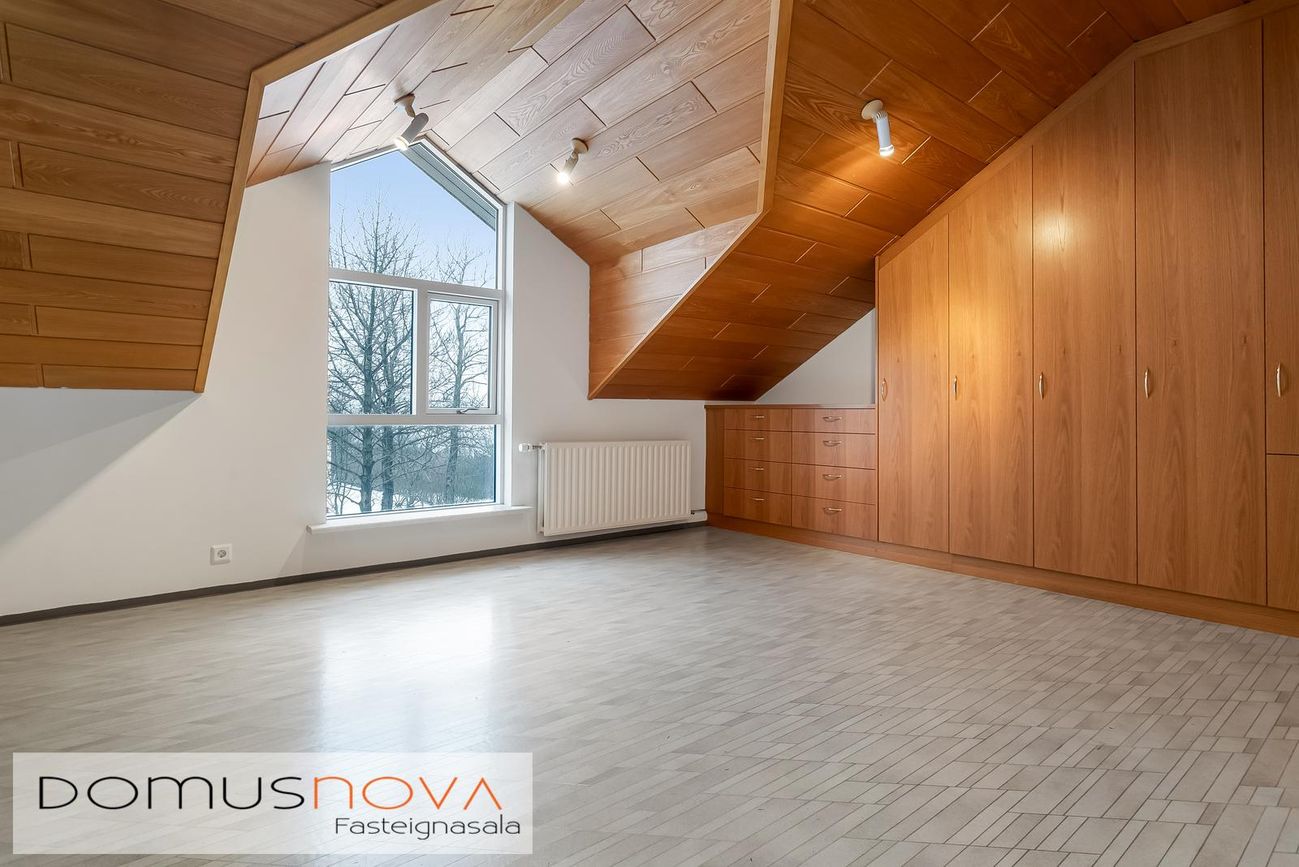 Hjónaherbergi með stórum skápum og snytiborði. Þrjú svefnherbergi á efri pöllum með dúkum á gólfum.