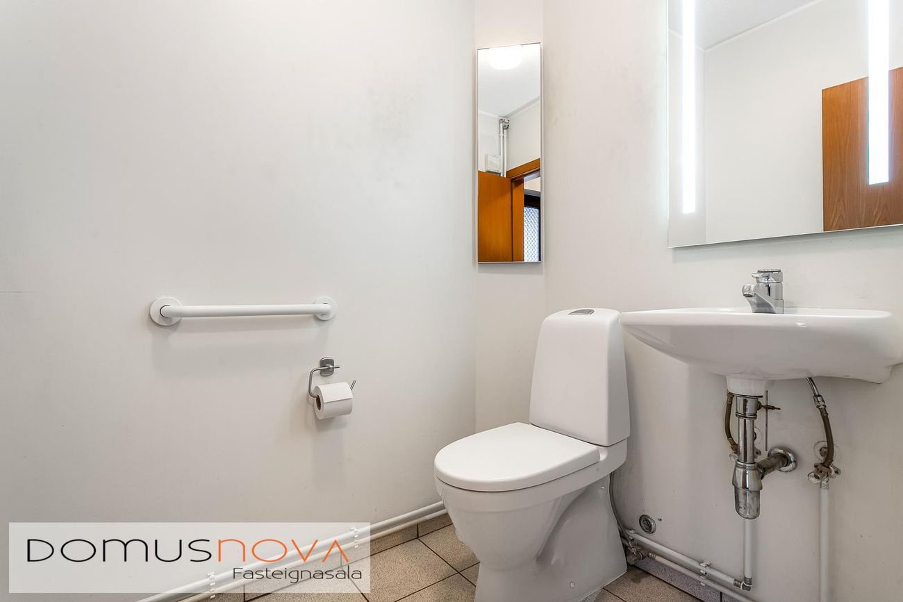 Þvottahús í bílskúr með sturtuklefa og salerni.