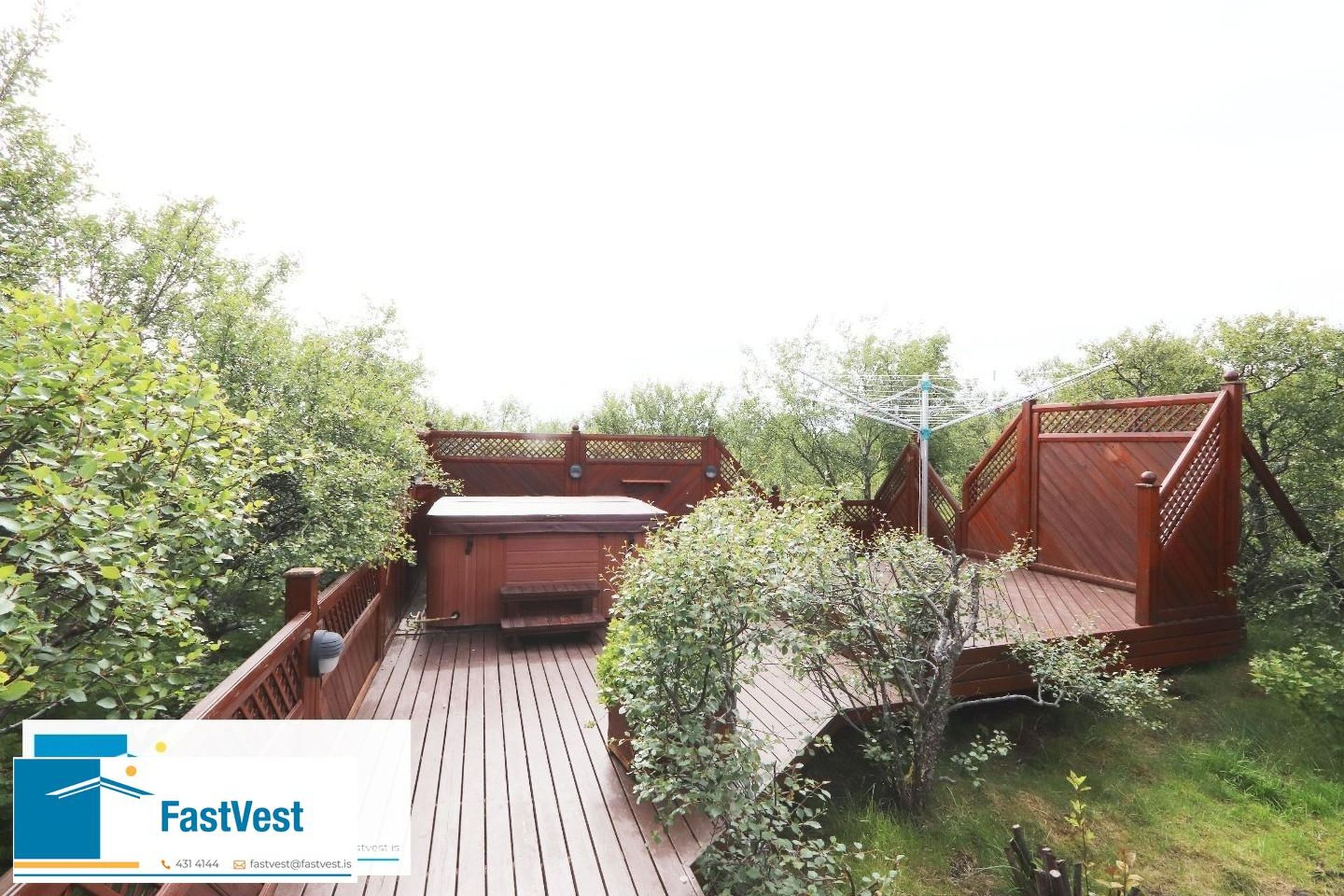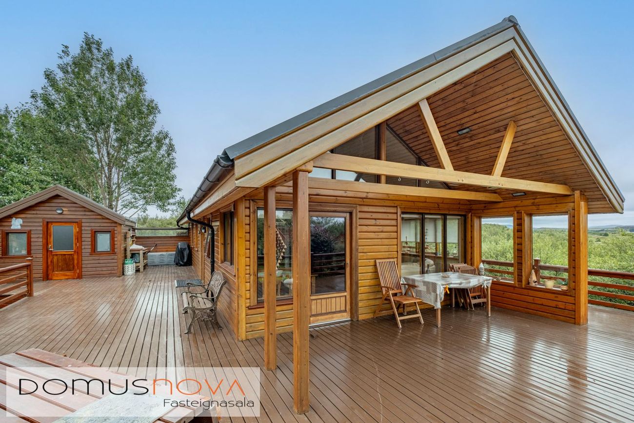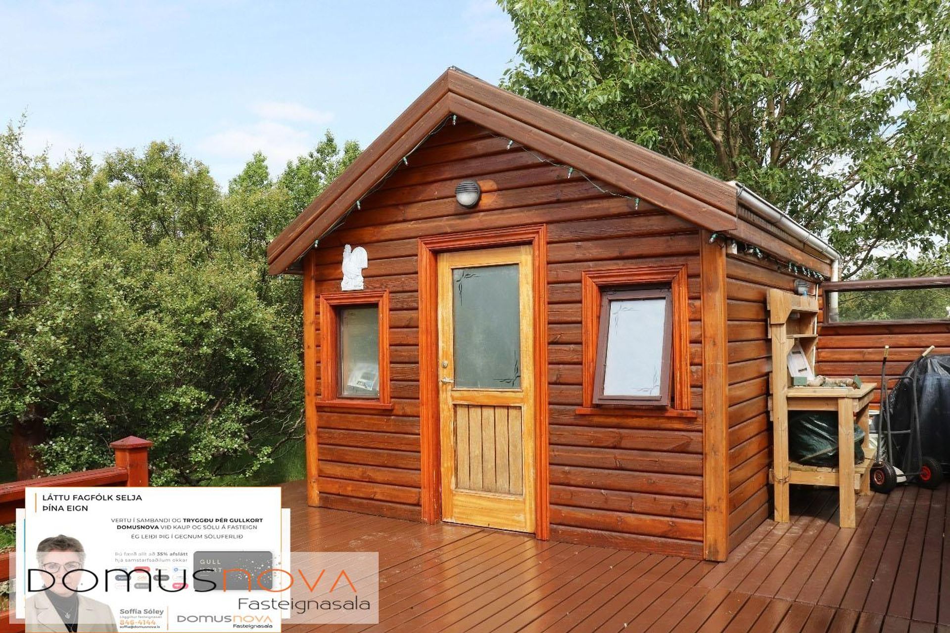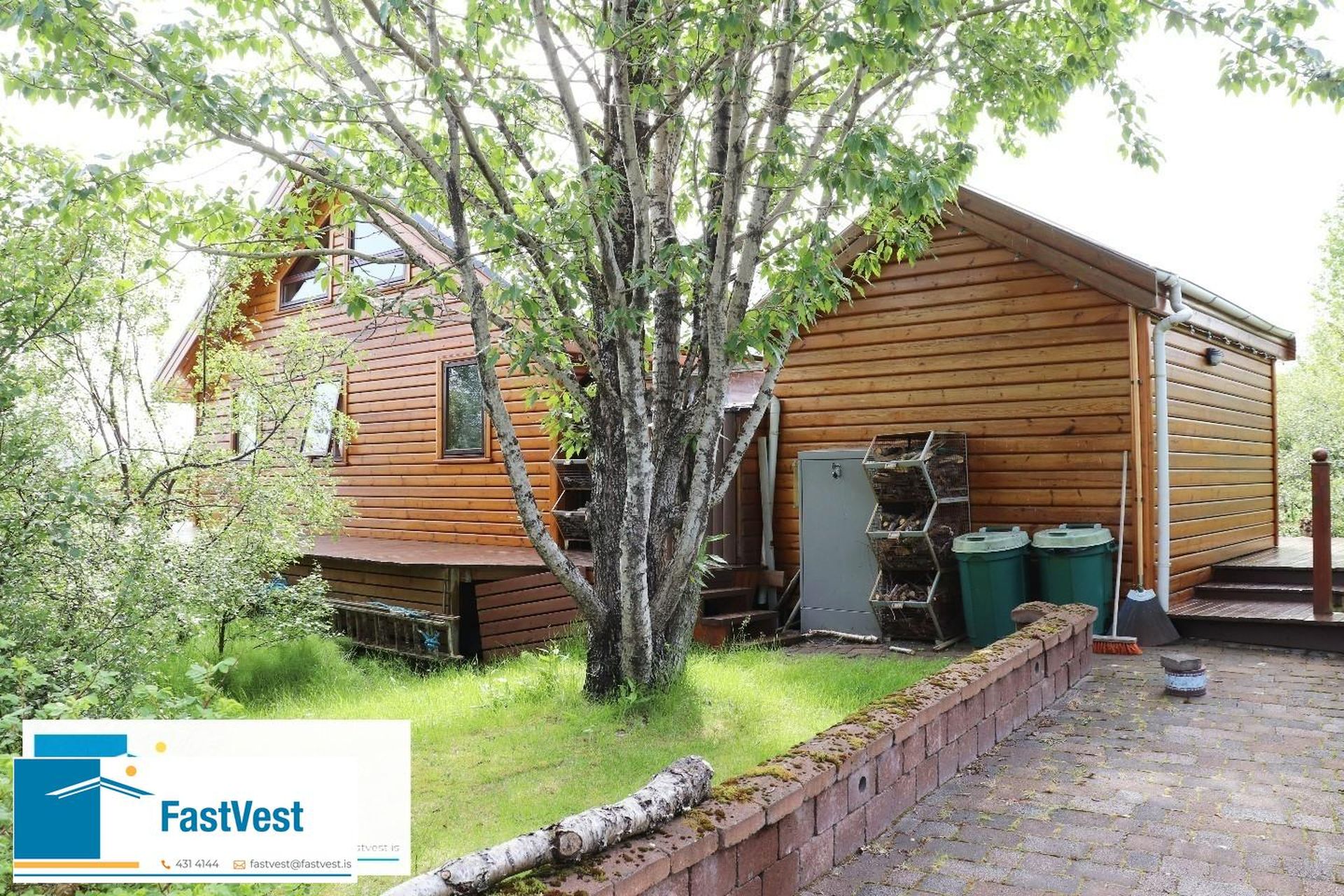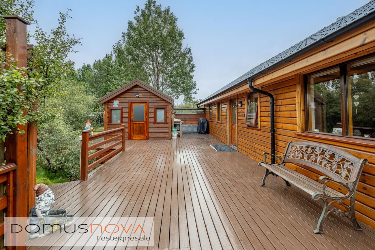 Hús á tveimur hæðum (130,7 fmr grunnflötur) með verönd, gestahús/geymsla og köldum geymslu. Hús smíðað á staðnum með vandaðri útfærslu.