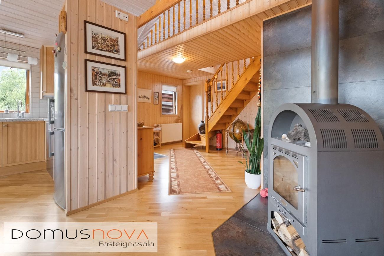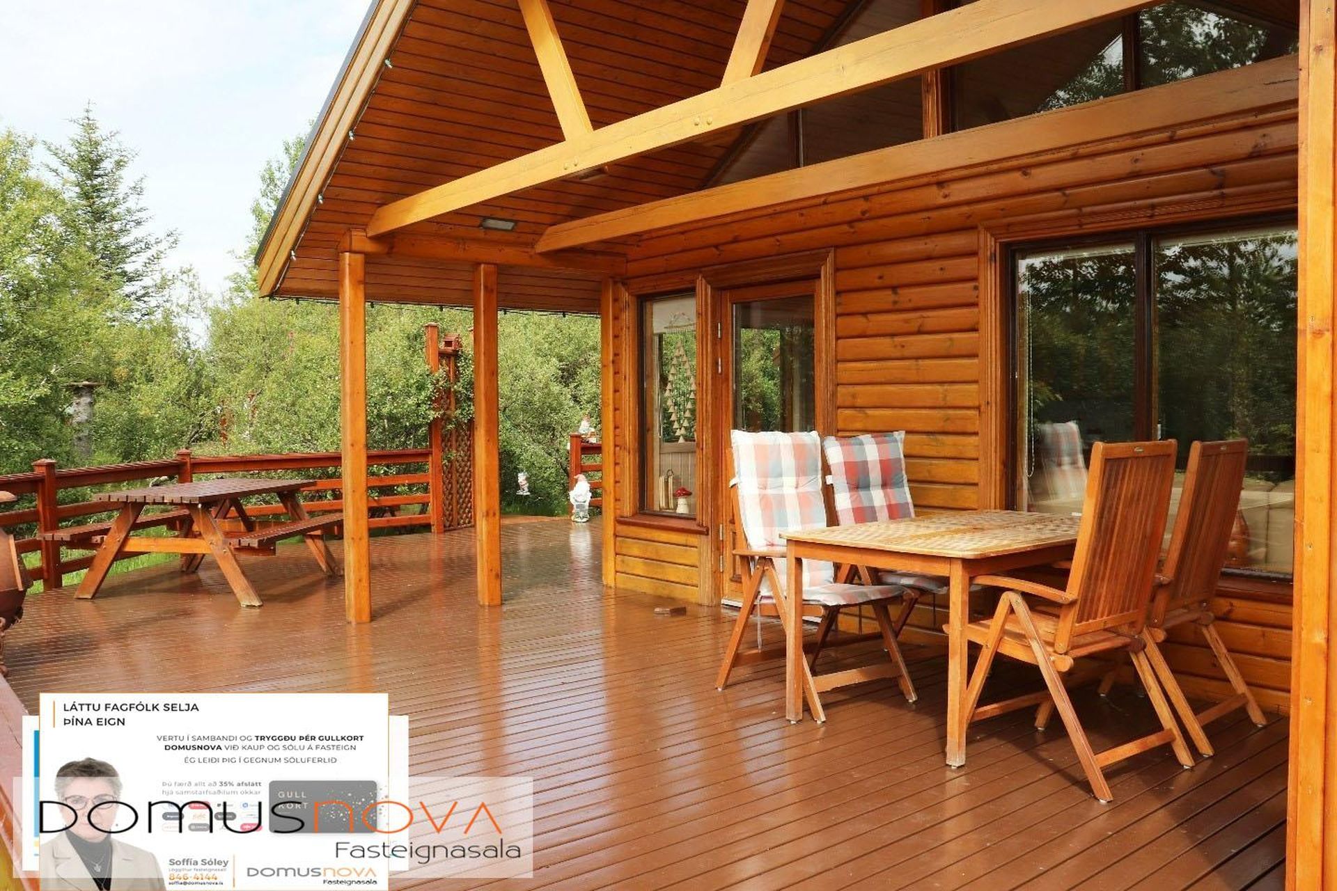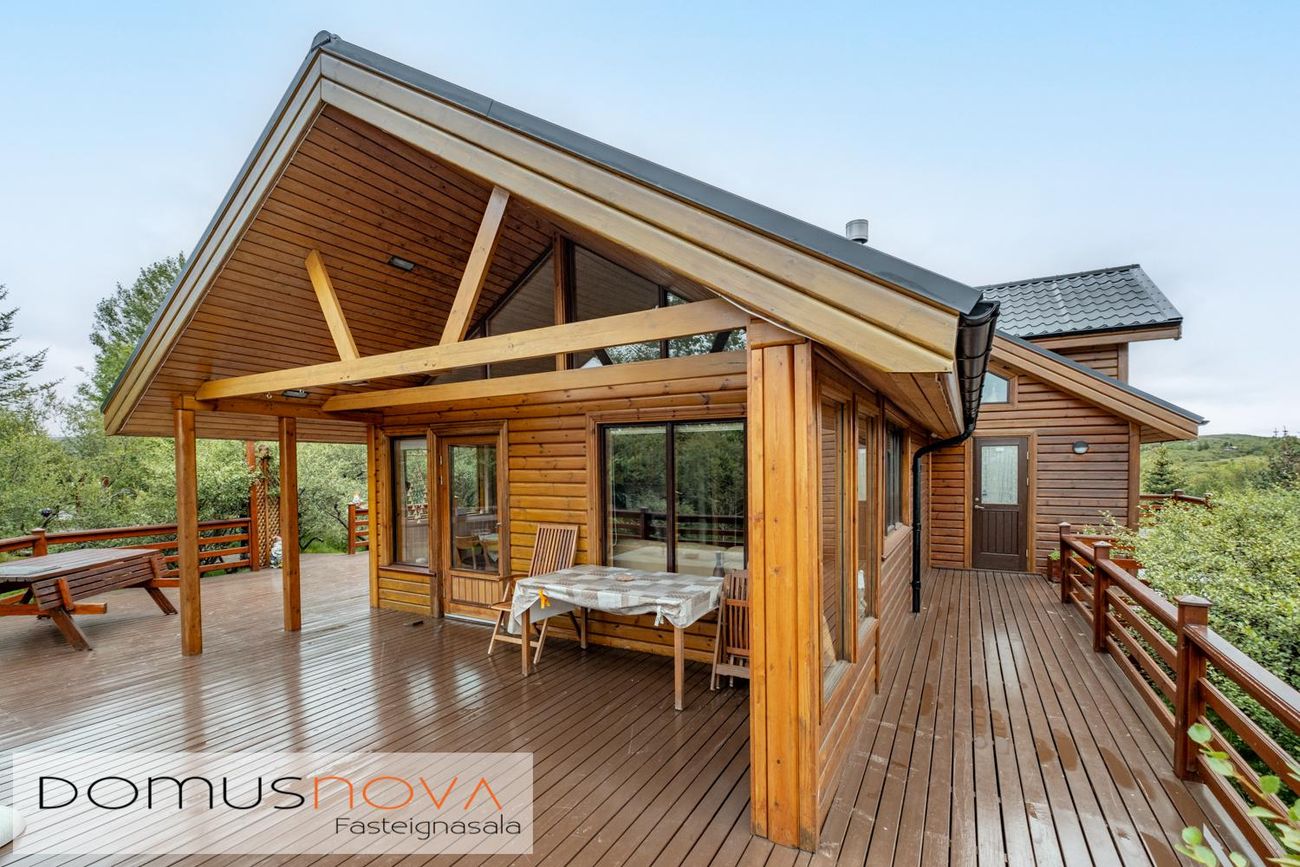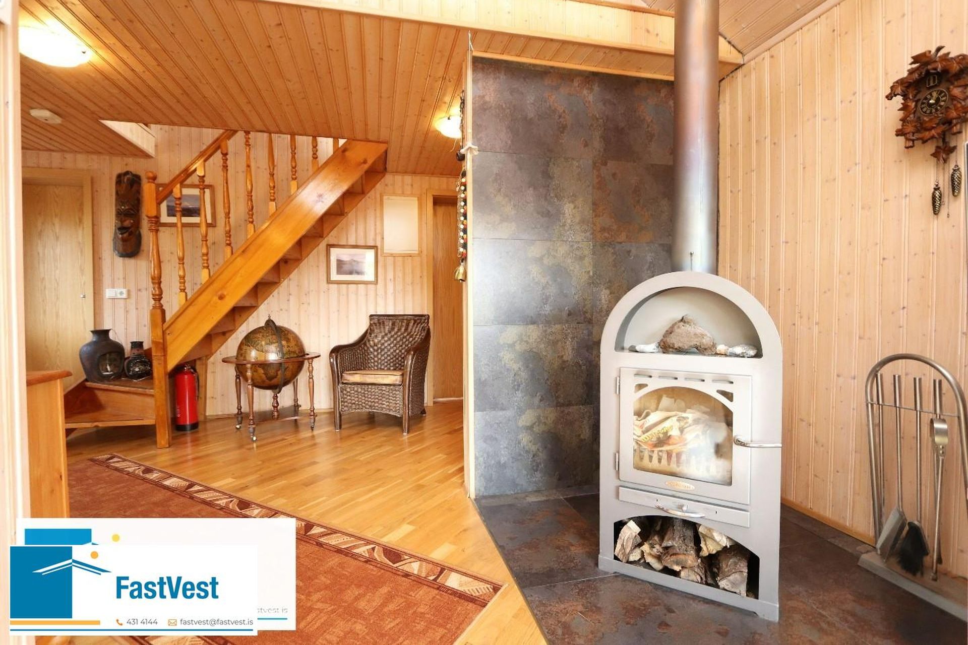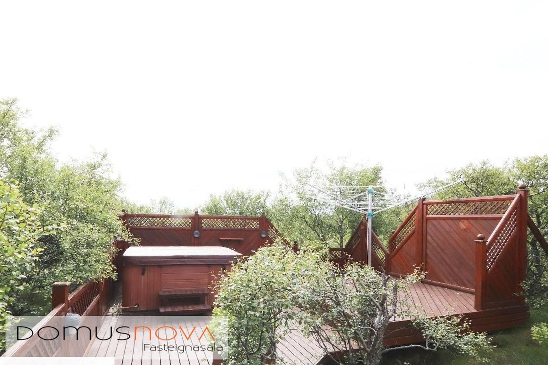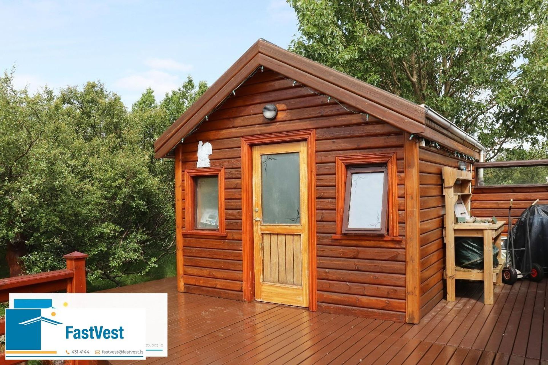 Hús á tveimur hæðum (130,7 fmr grunnflötur) með verönd, gestahús/geymsla og köldum geymslu. Hús smíðað á staðnum með vandaðri útfærslu.