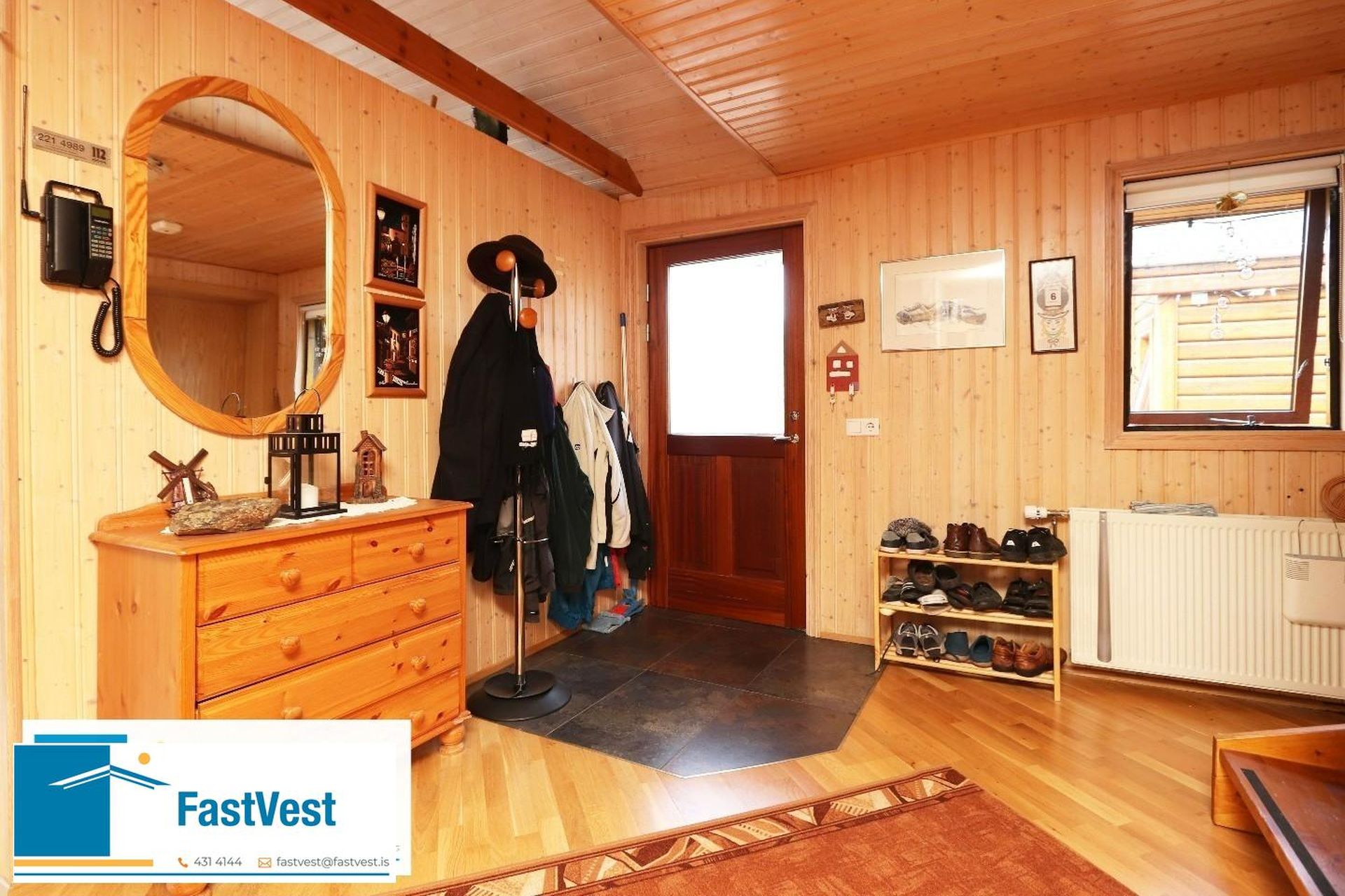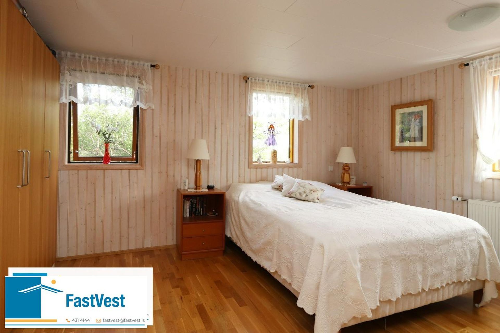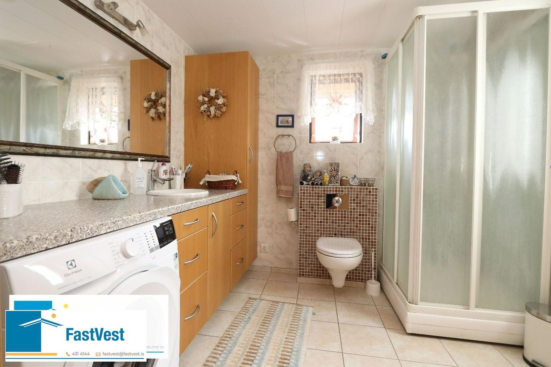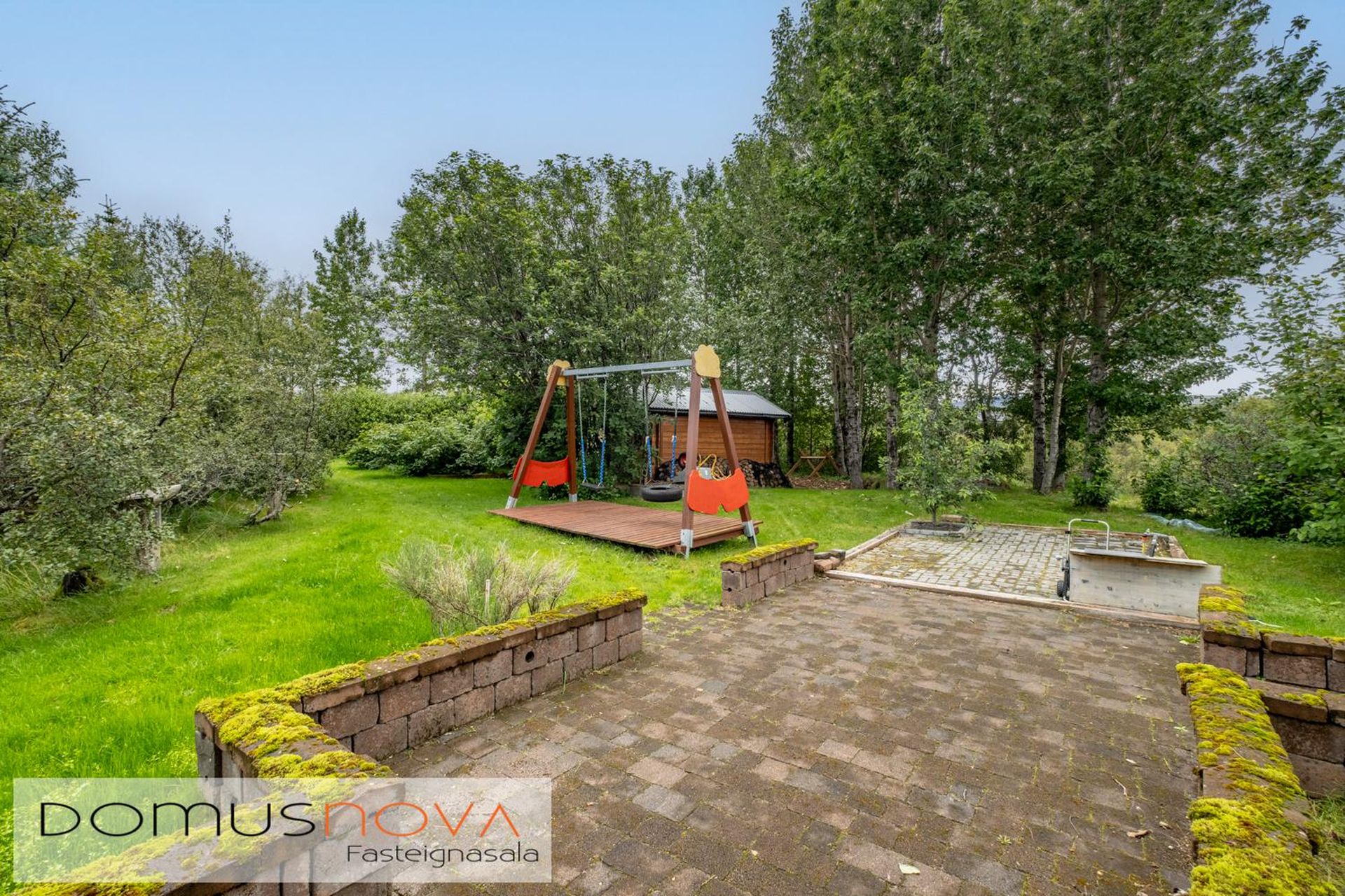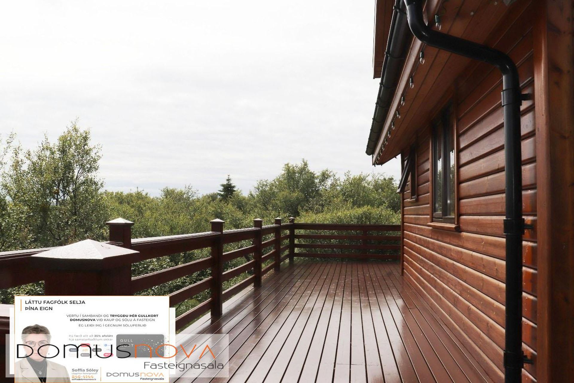Hús á tveimur hæðum (130,7 fmr grunnflötur) með verönd, gestahús/geymsla og köldum geymslu. Hús smíðað á staðnum með vandaðri útfærslu.
