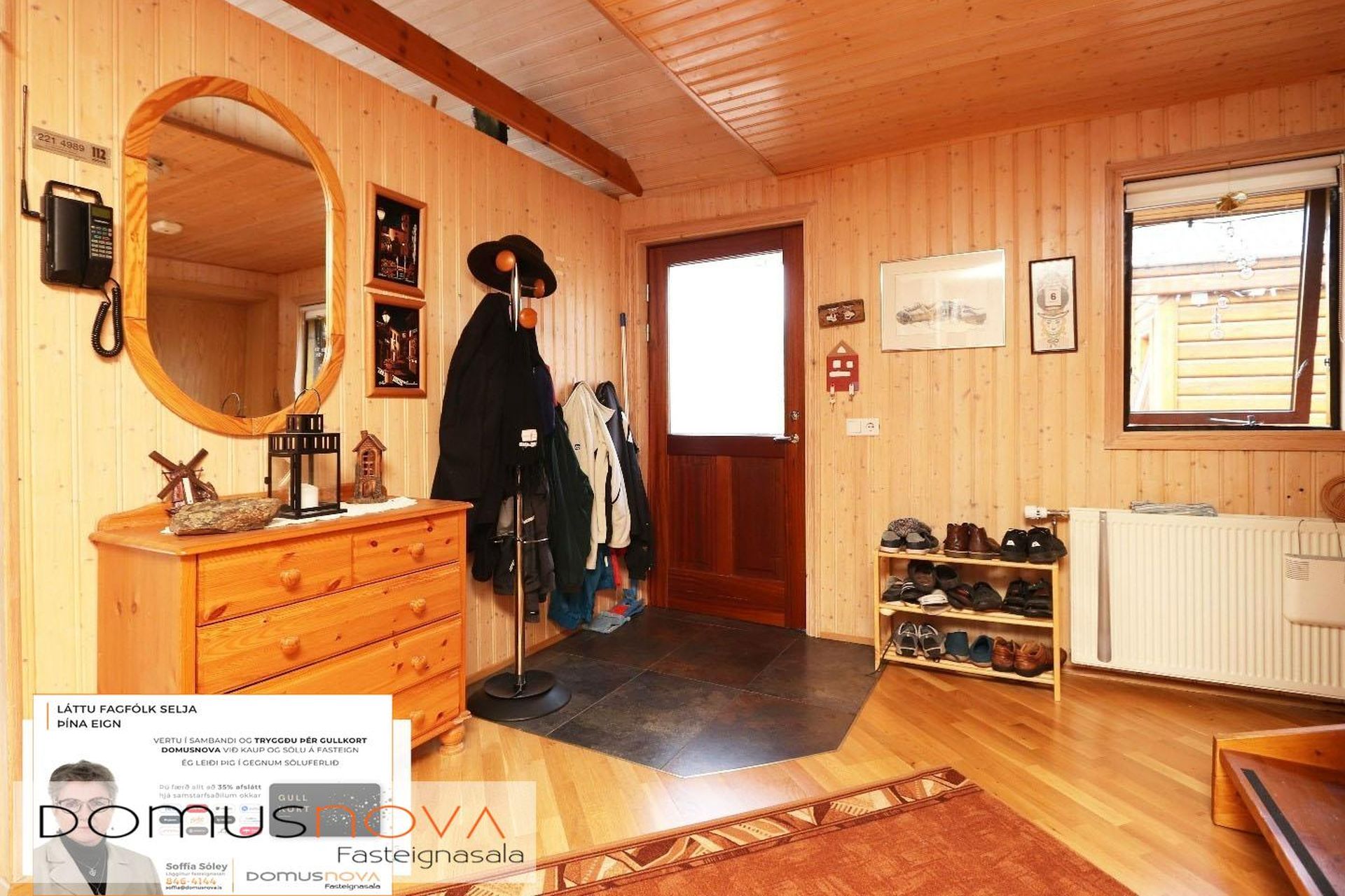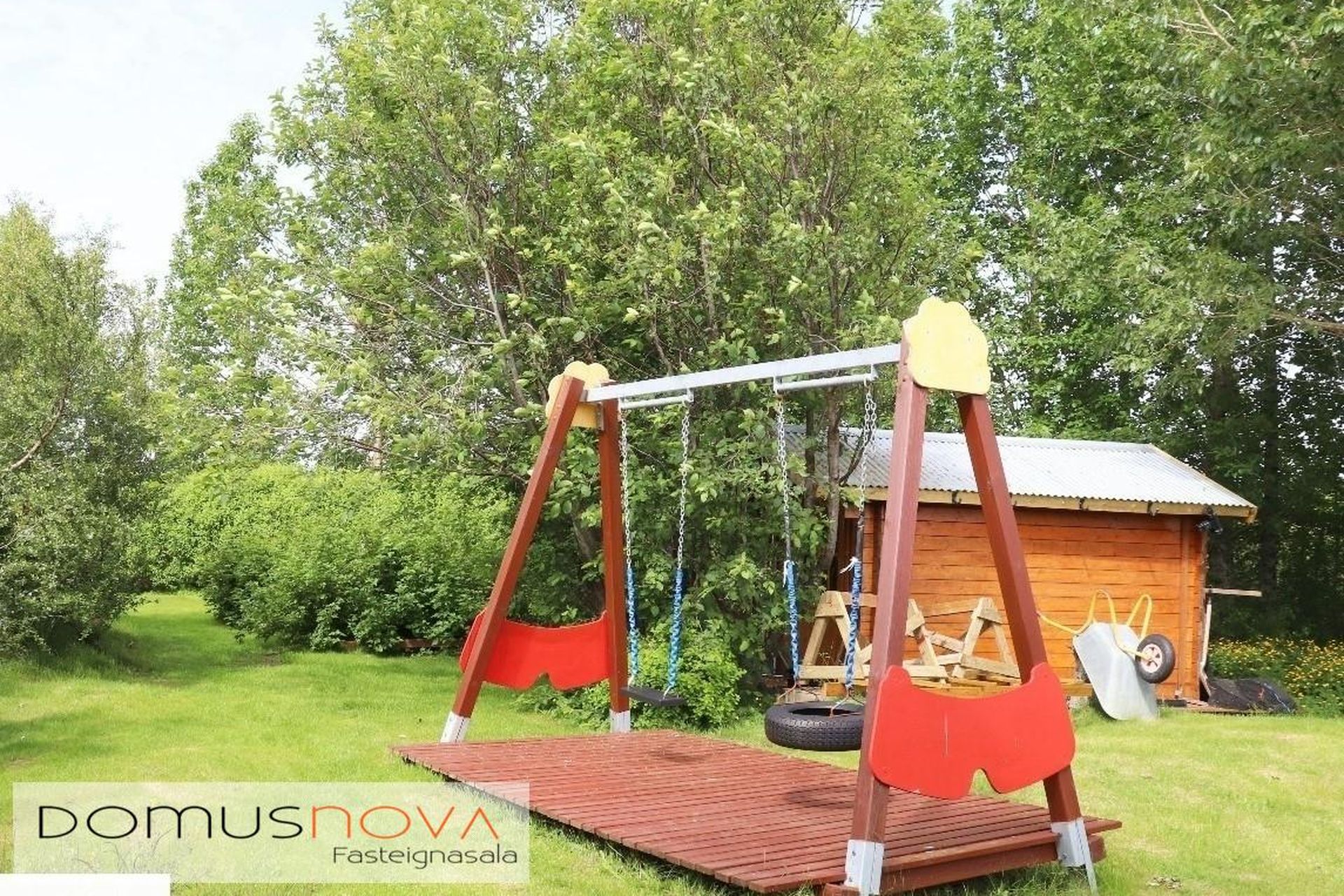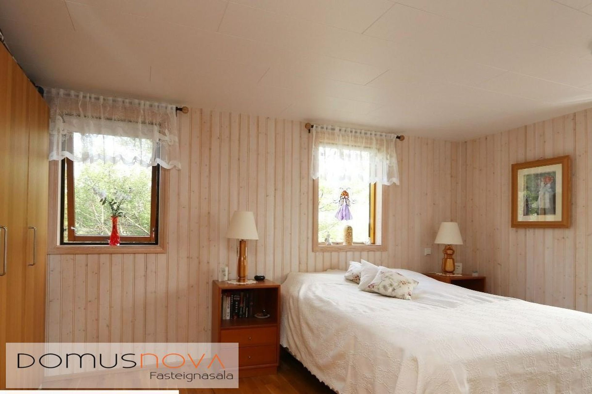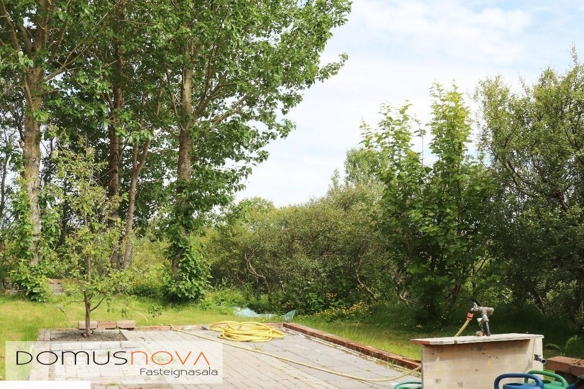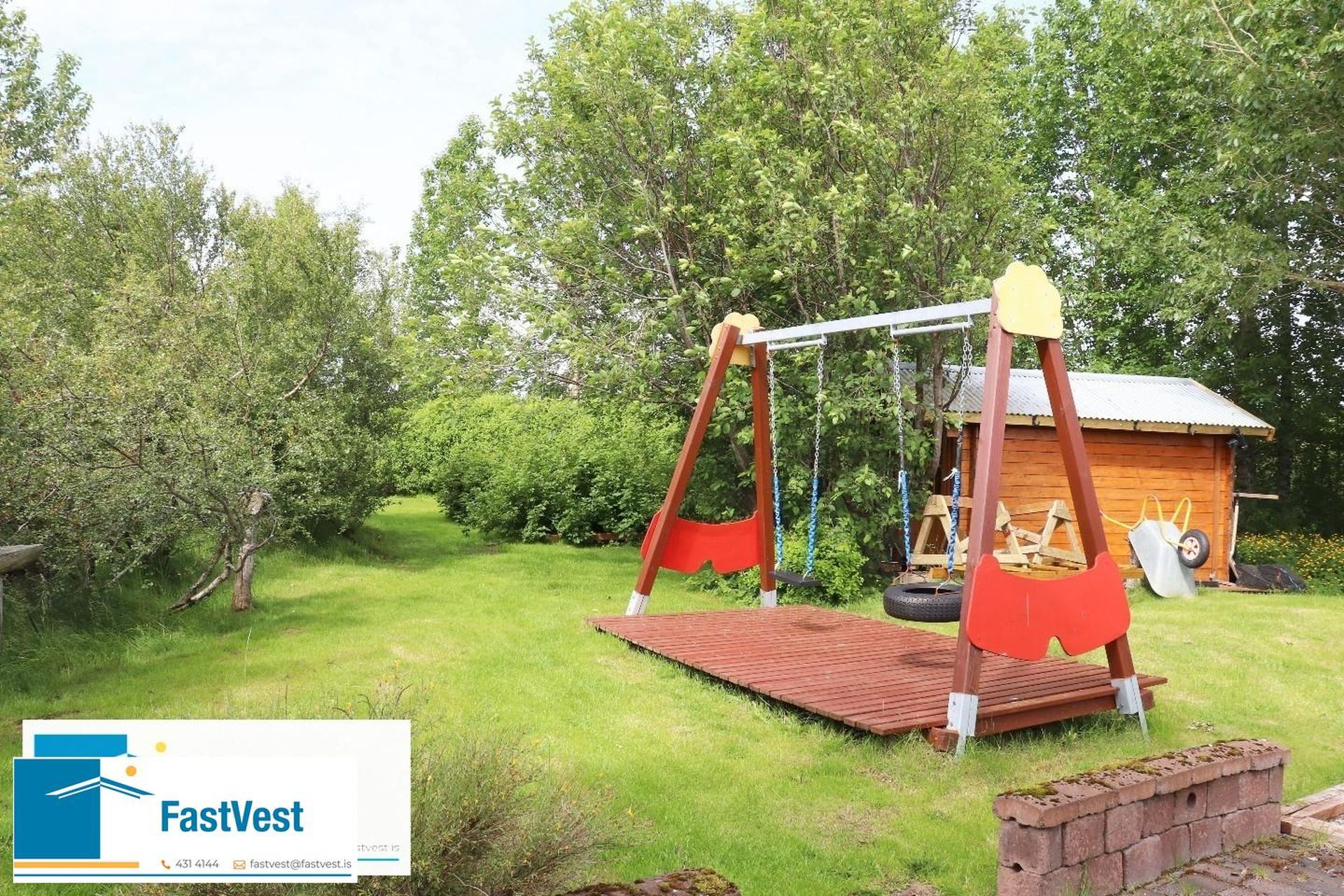 Hús á tveimur hæðum (130,7 fmr grunnflötur) með verönd, gestahús/geymsla og köldum geymslu. Hús smíðað á staðnum með vandaðri útfærslu.