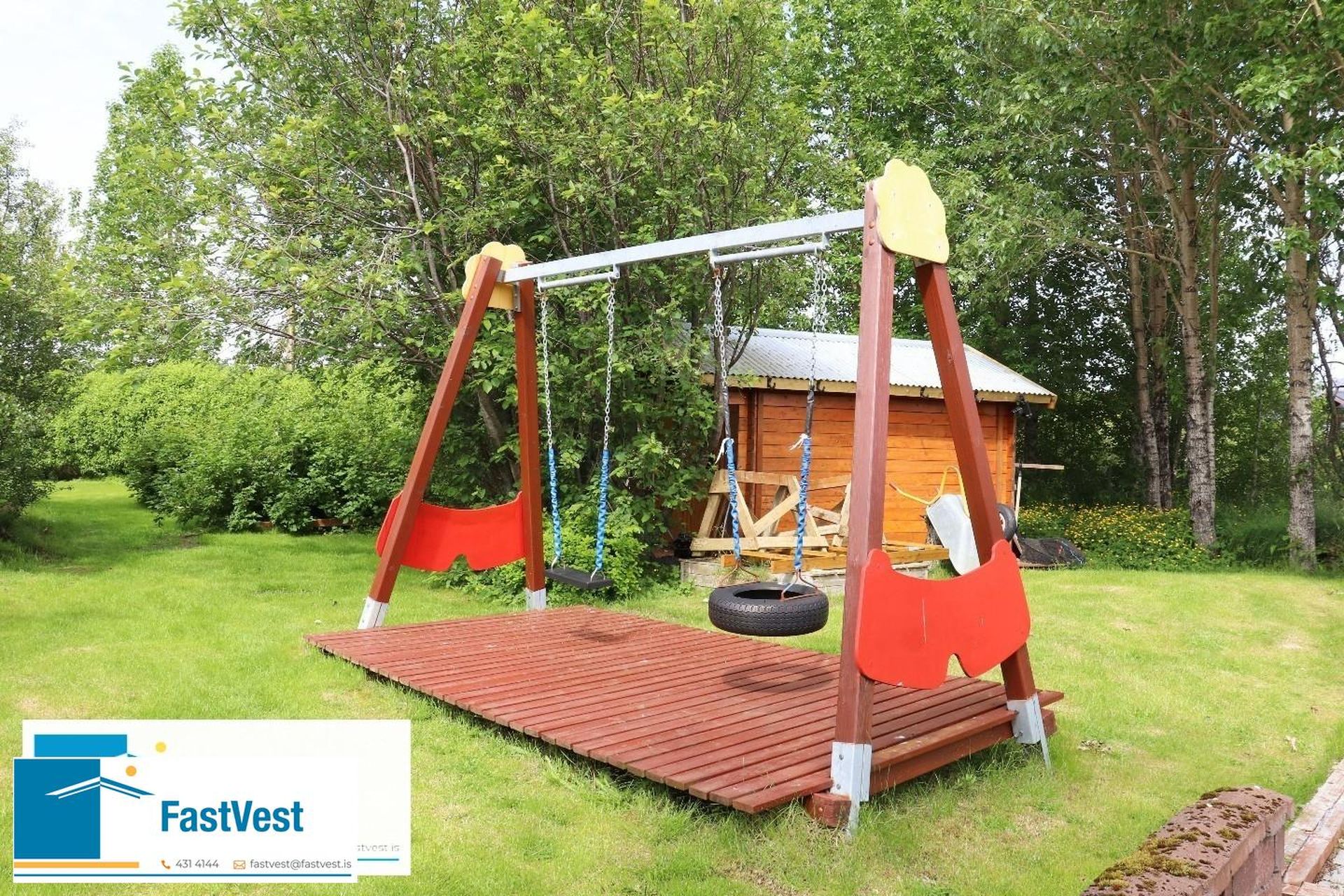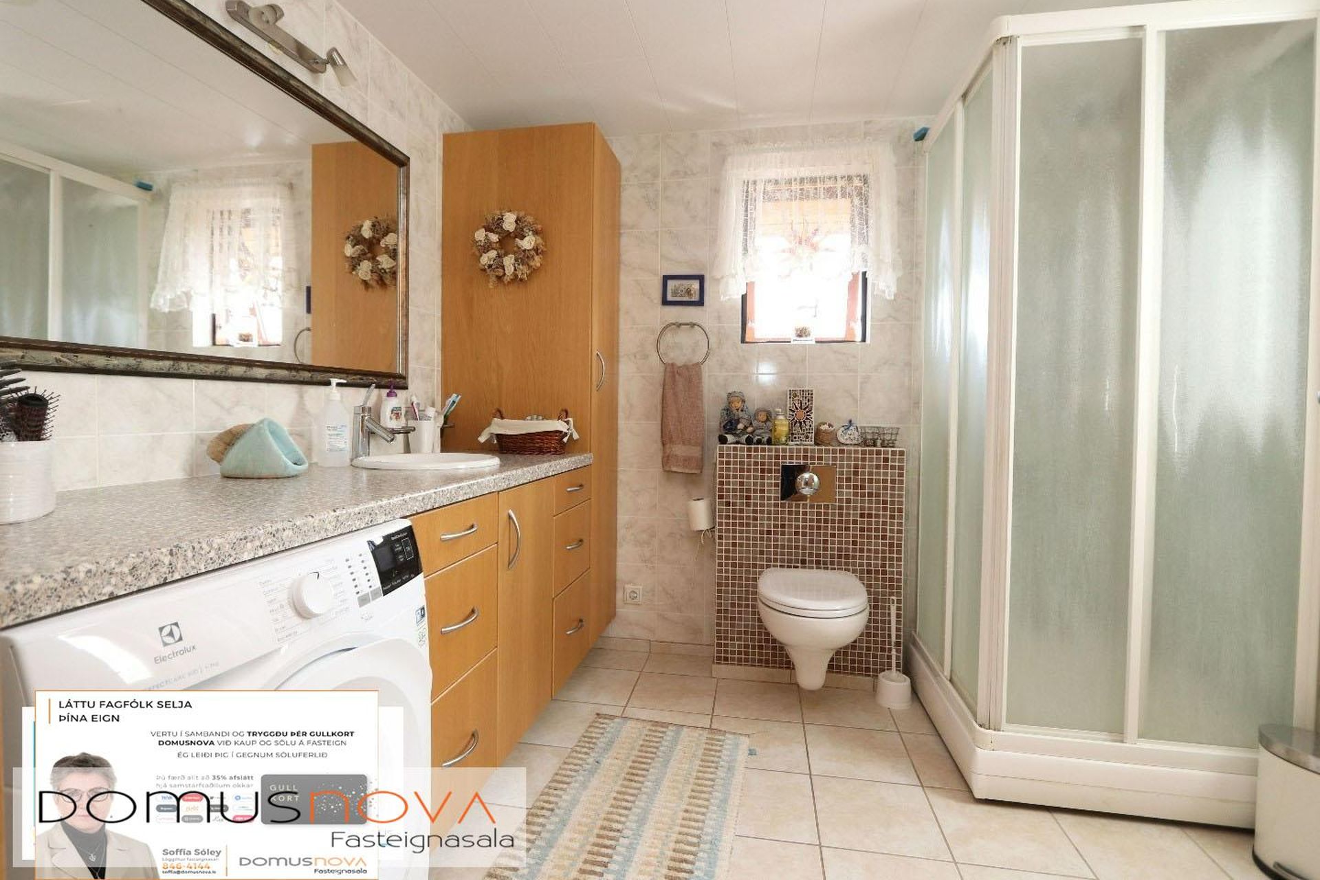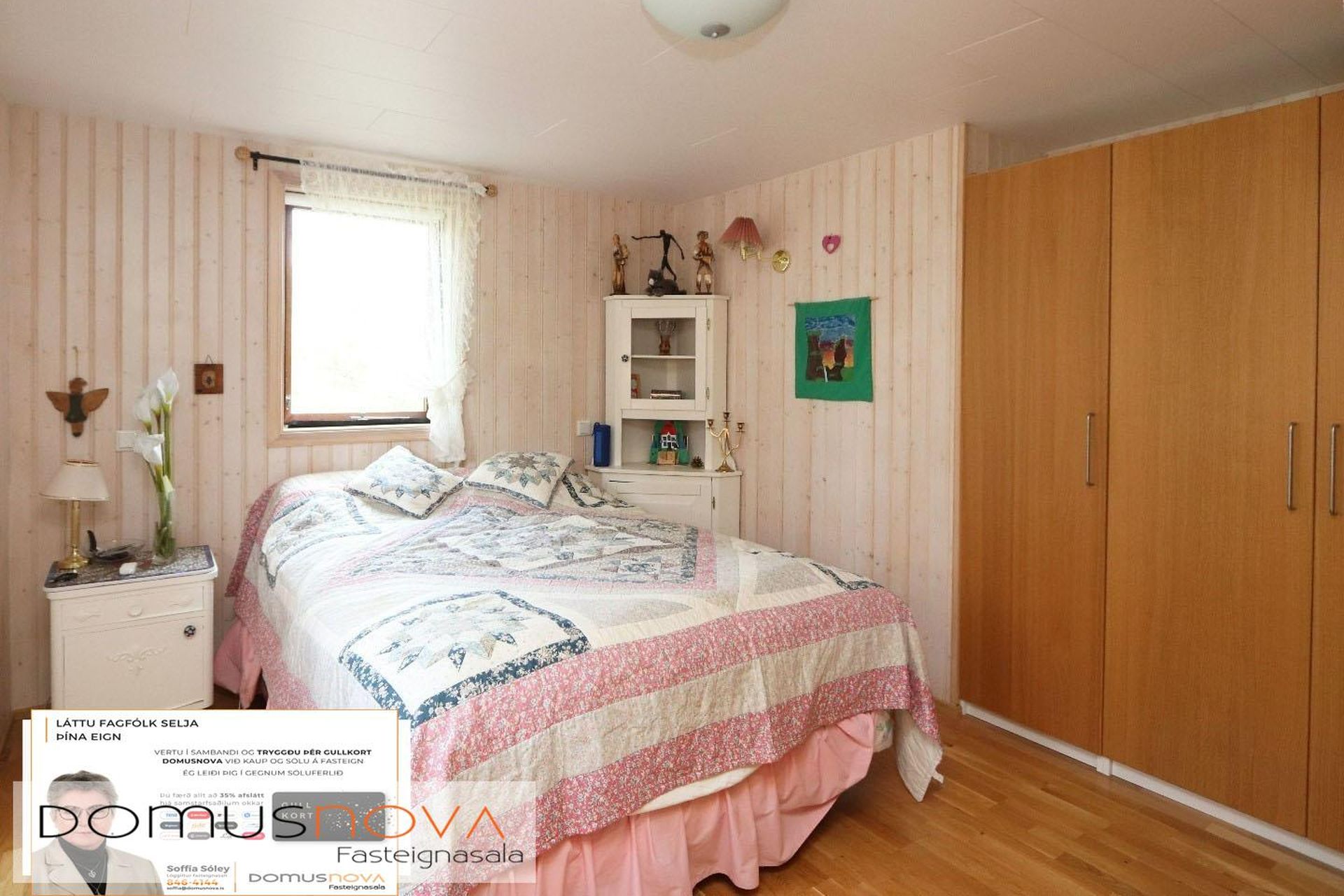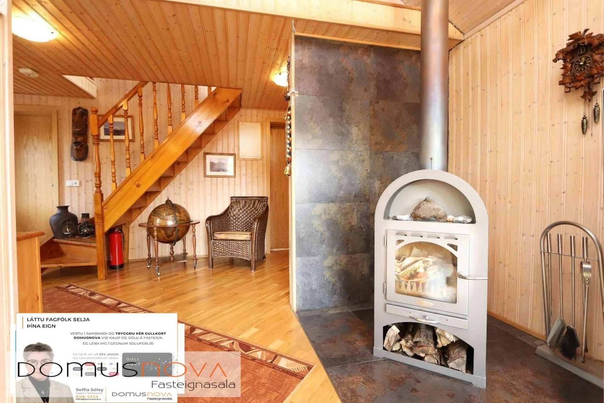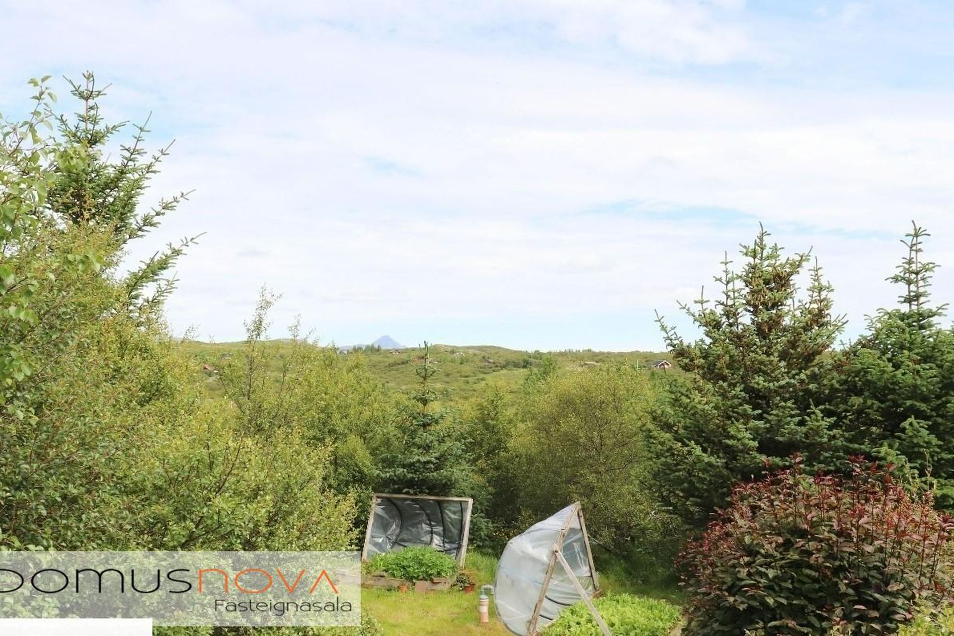 Hús á tveimur hæðum (130,7 fmr grunnflötur) með verönd, gestahús/geymsla og köldum geymslu. Hús smíðað á staðnum með vandaðri útfærslu.