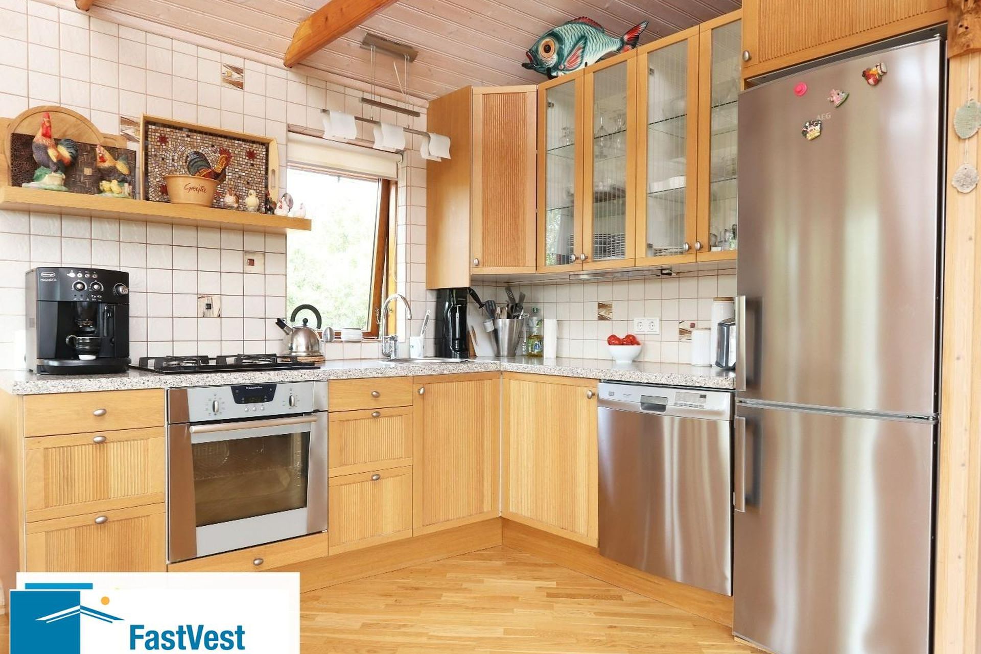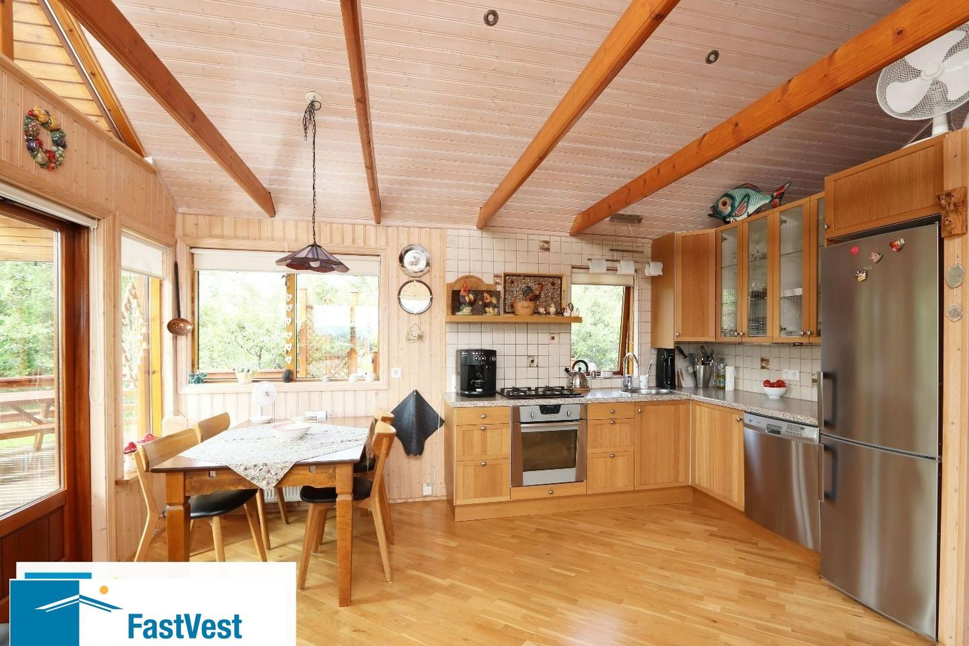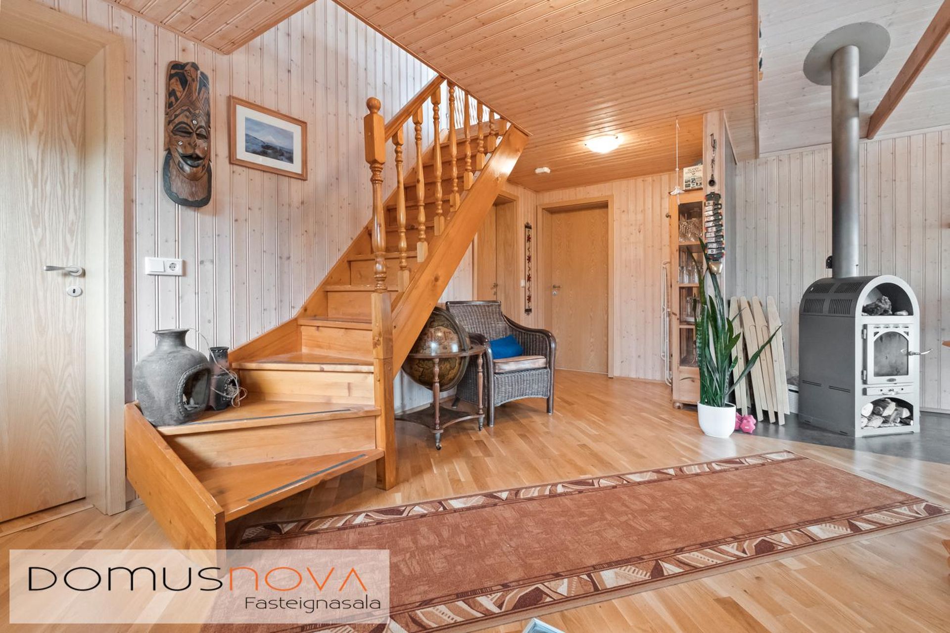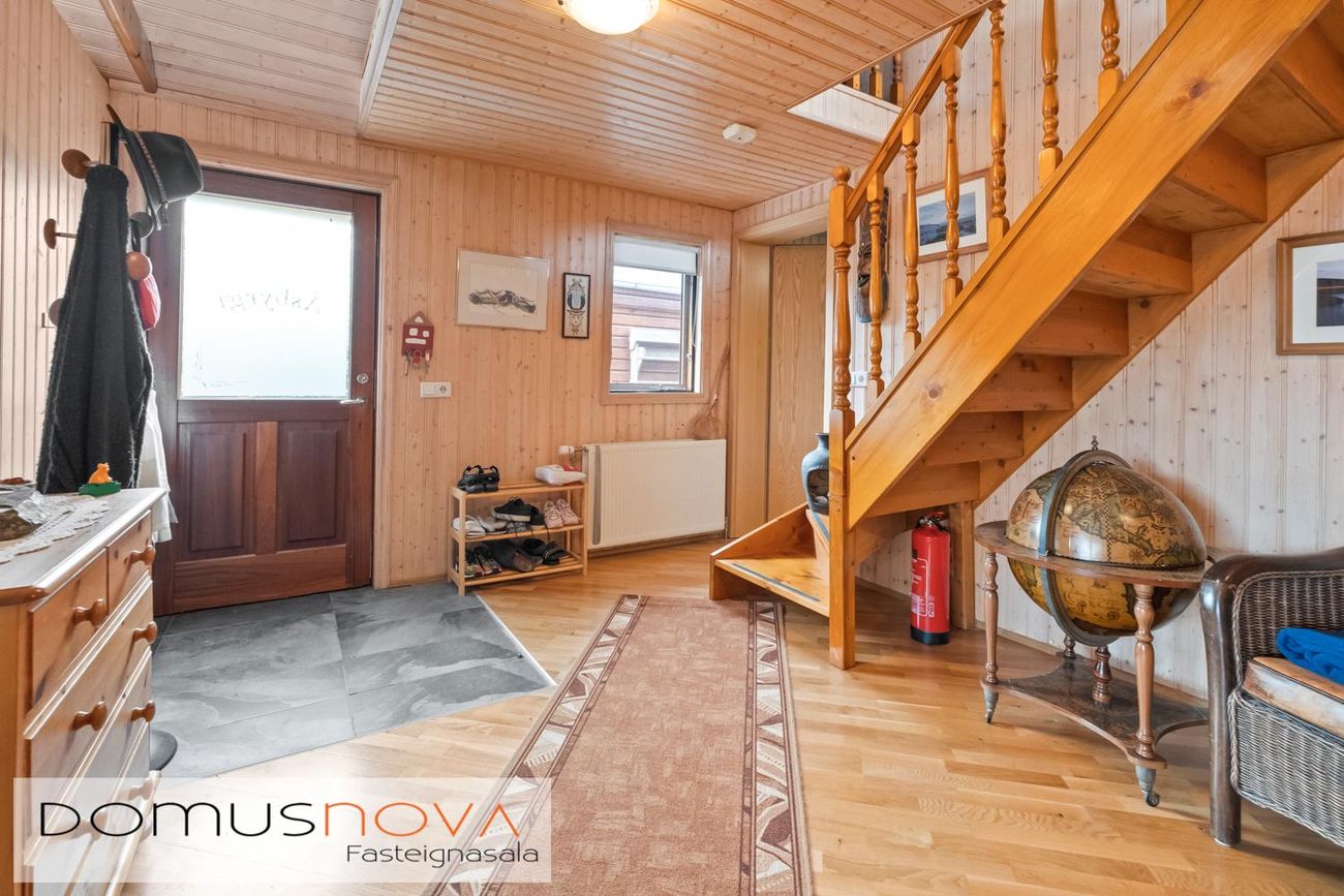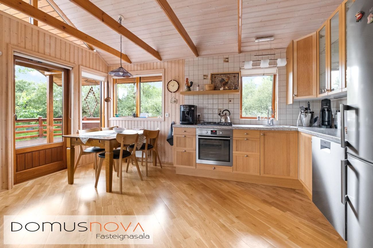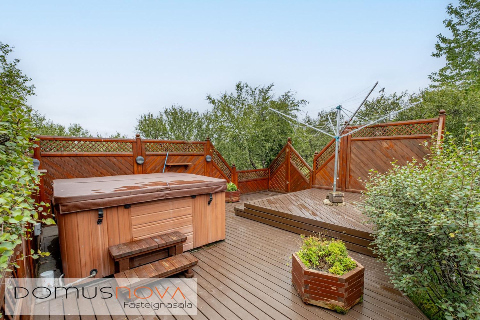 Hús á tveimur hæðum (130,7 fmr grunnflötur) með verönd, gestahús/geymsla og köldum geymslu. Hús smíðað á staðnum með vandaðri útfærslu.