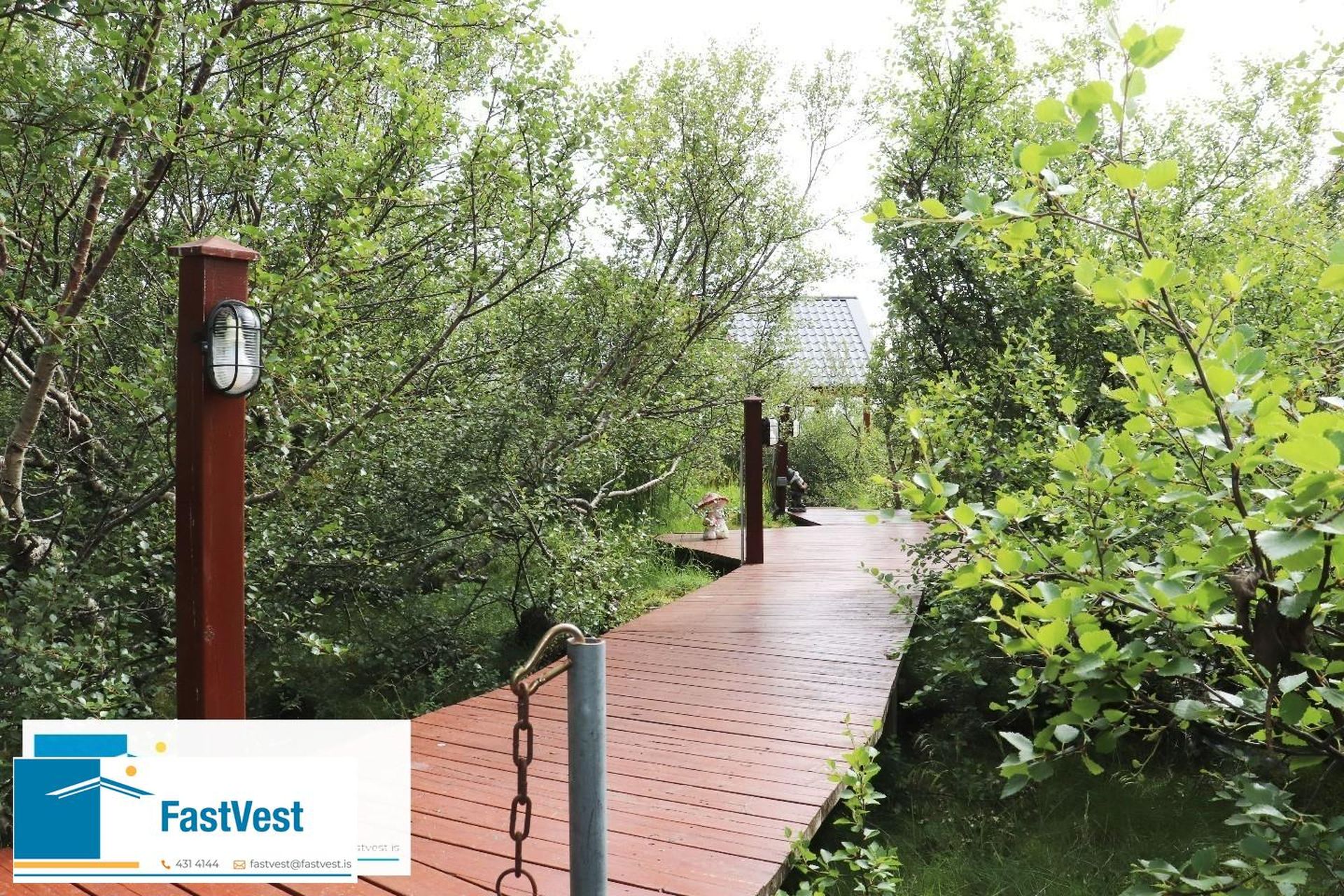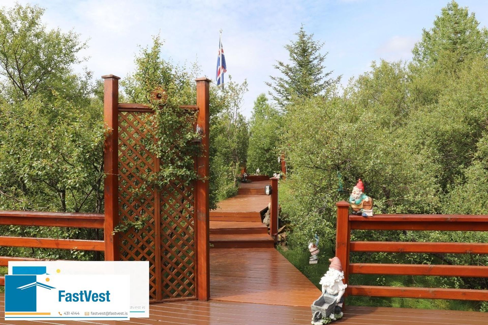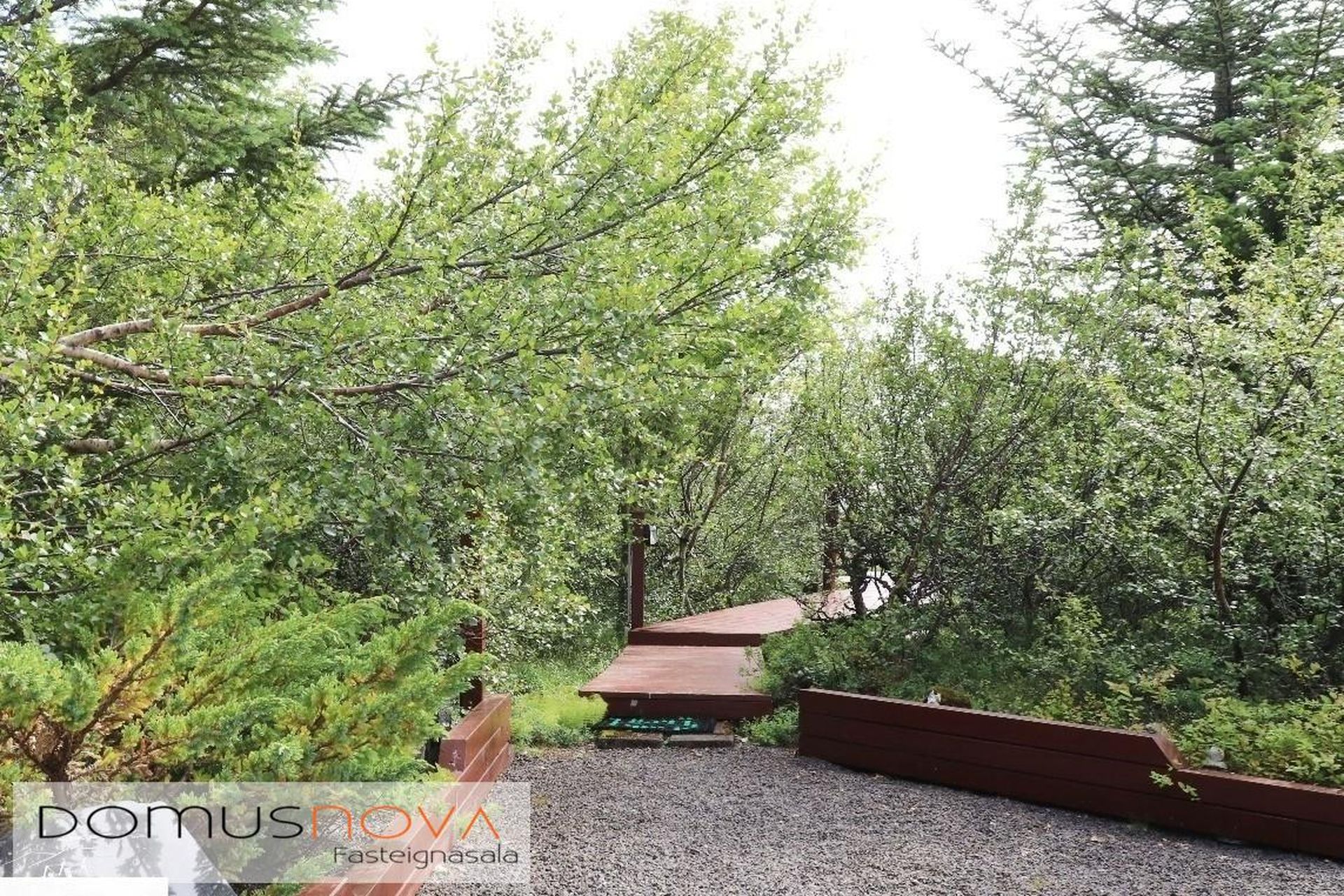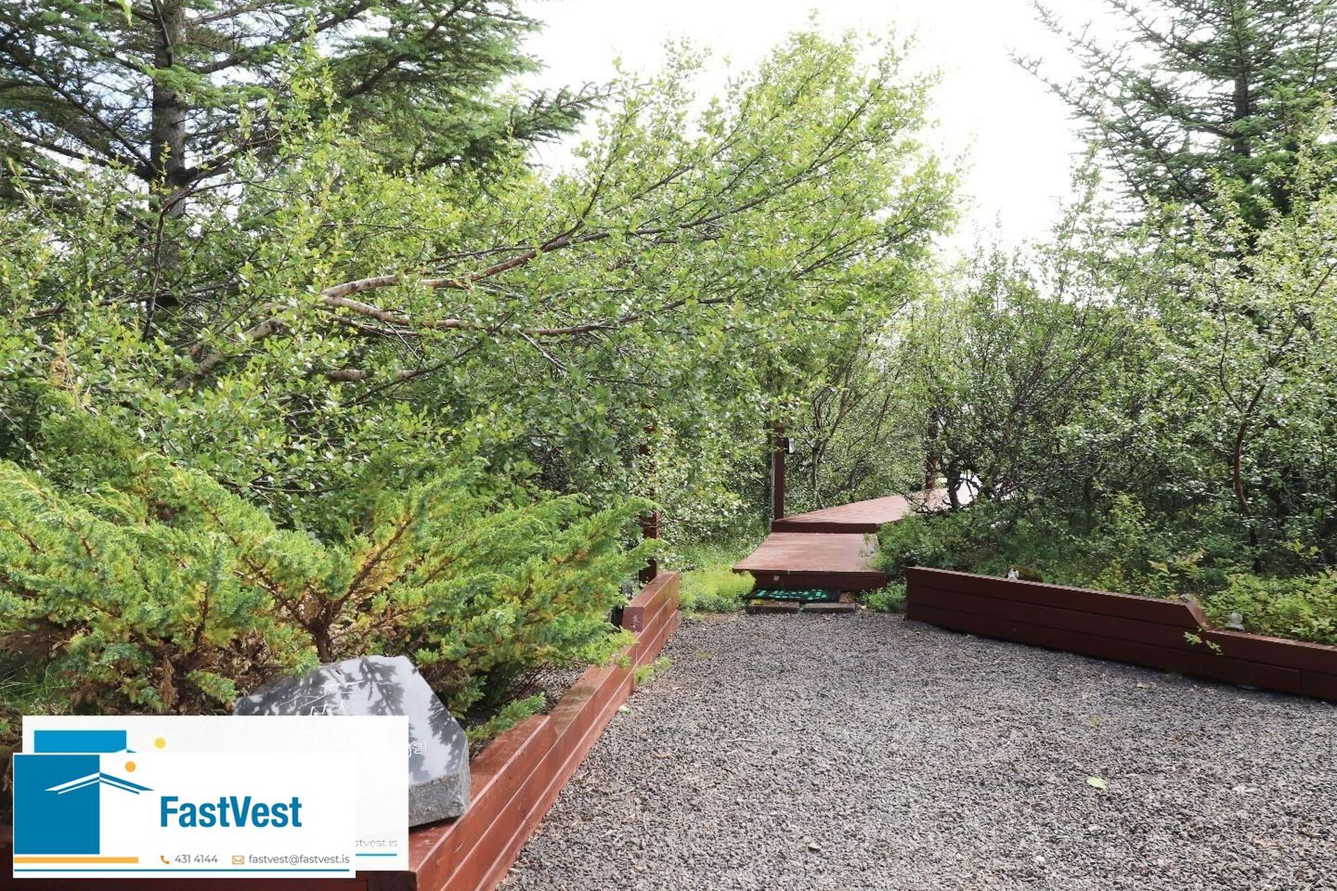 Mikið trjágróður á lóðinni, timburstígur, bílaplan með nægum bílastæðum.