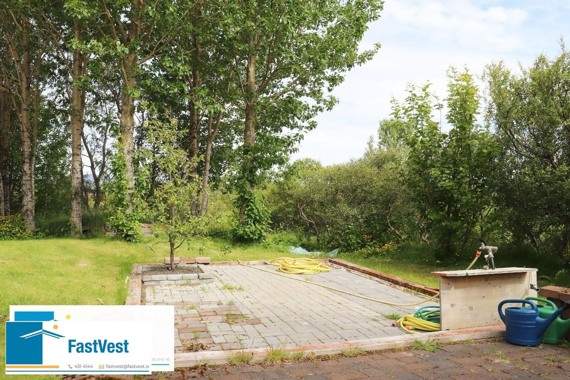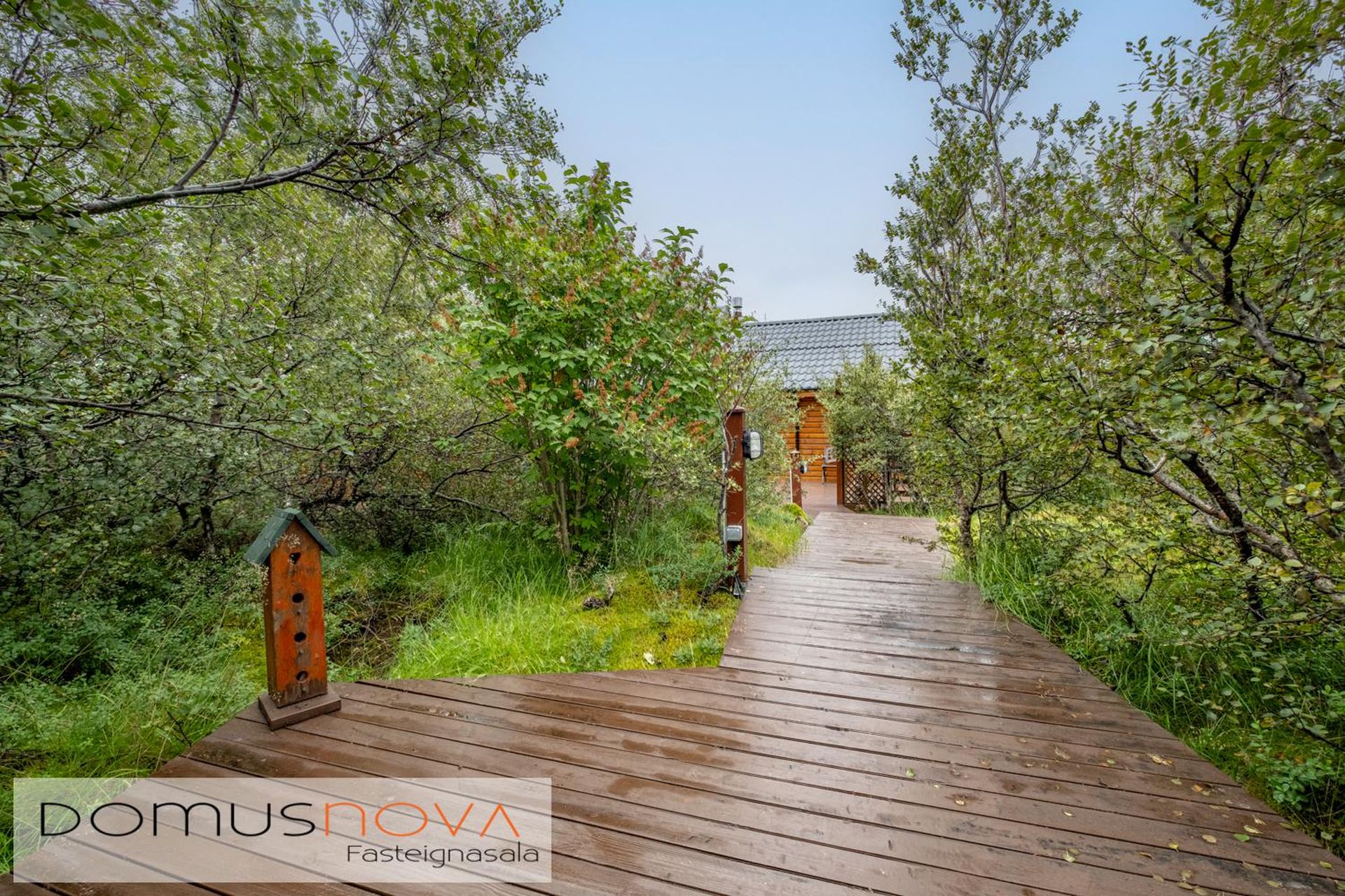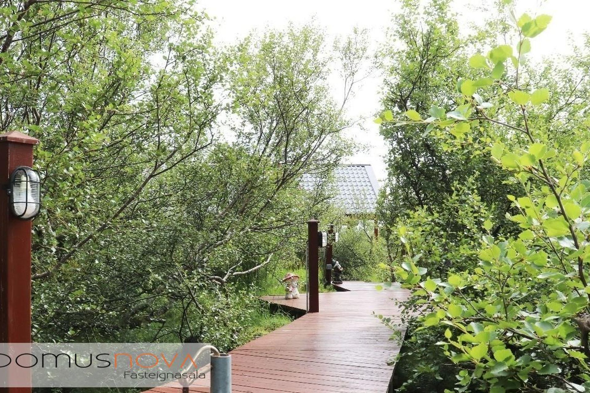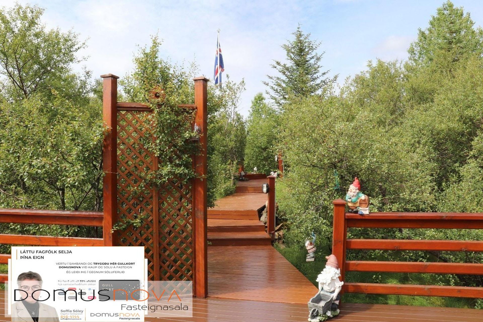 Mikið trjágróður á lóðinni, timburstígur, bílaplan með nægum bílastæðum.