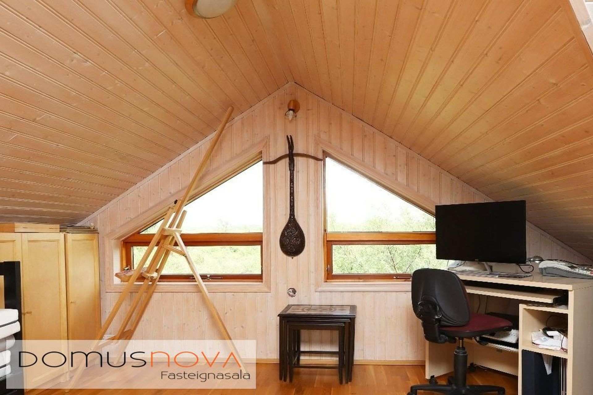 Eikarparket í stofu, parket í rislofti, flísað baðherbergi, sérsmíðaðar birkiinnréttingar.