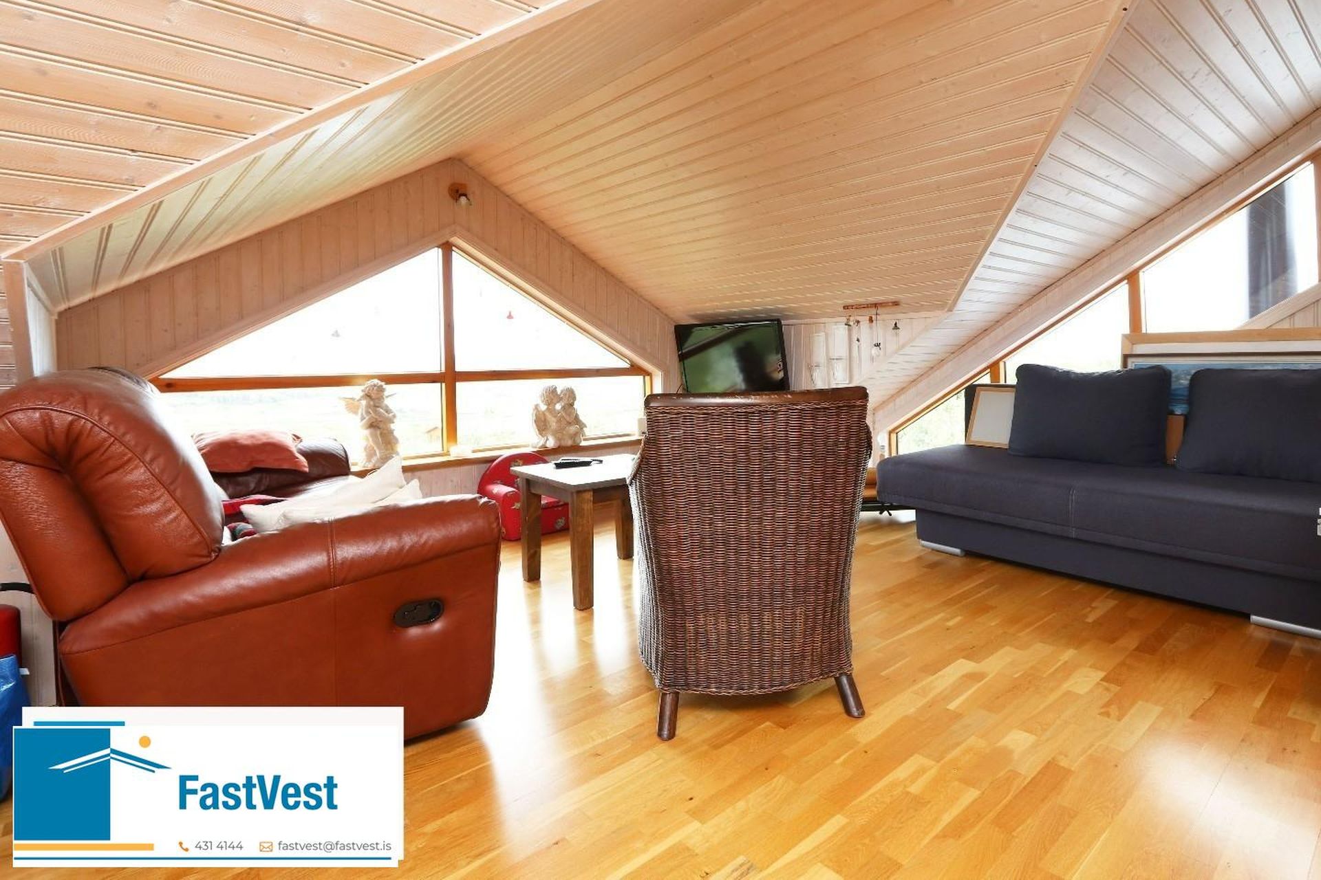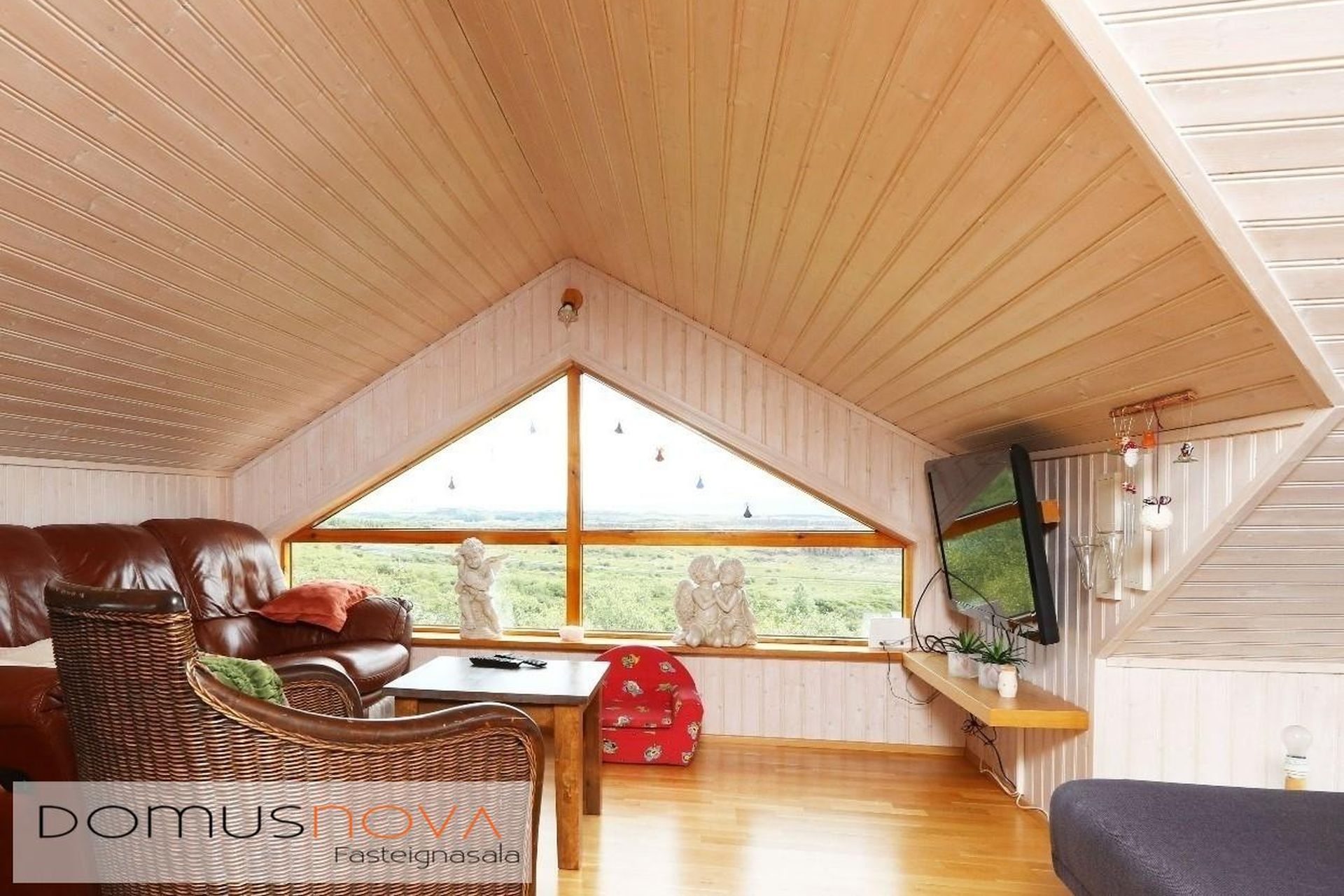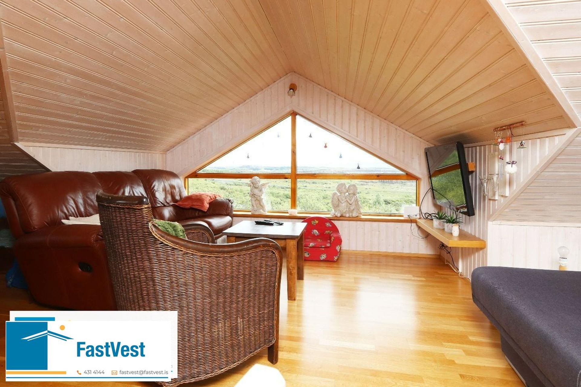 Rúmgóð stofa með eikarparket og mikilfenglegt útsýni yfir Borgarfjörð. Mikil lofthæð og góðir gluggar.