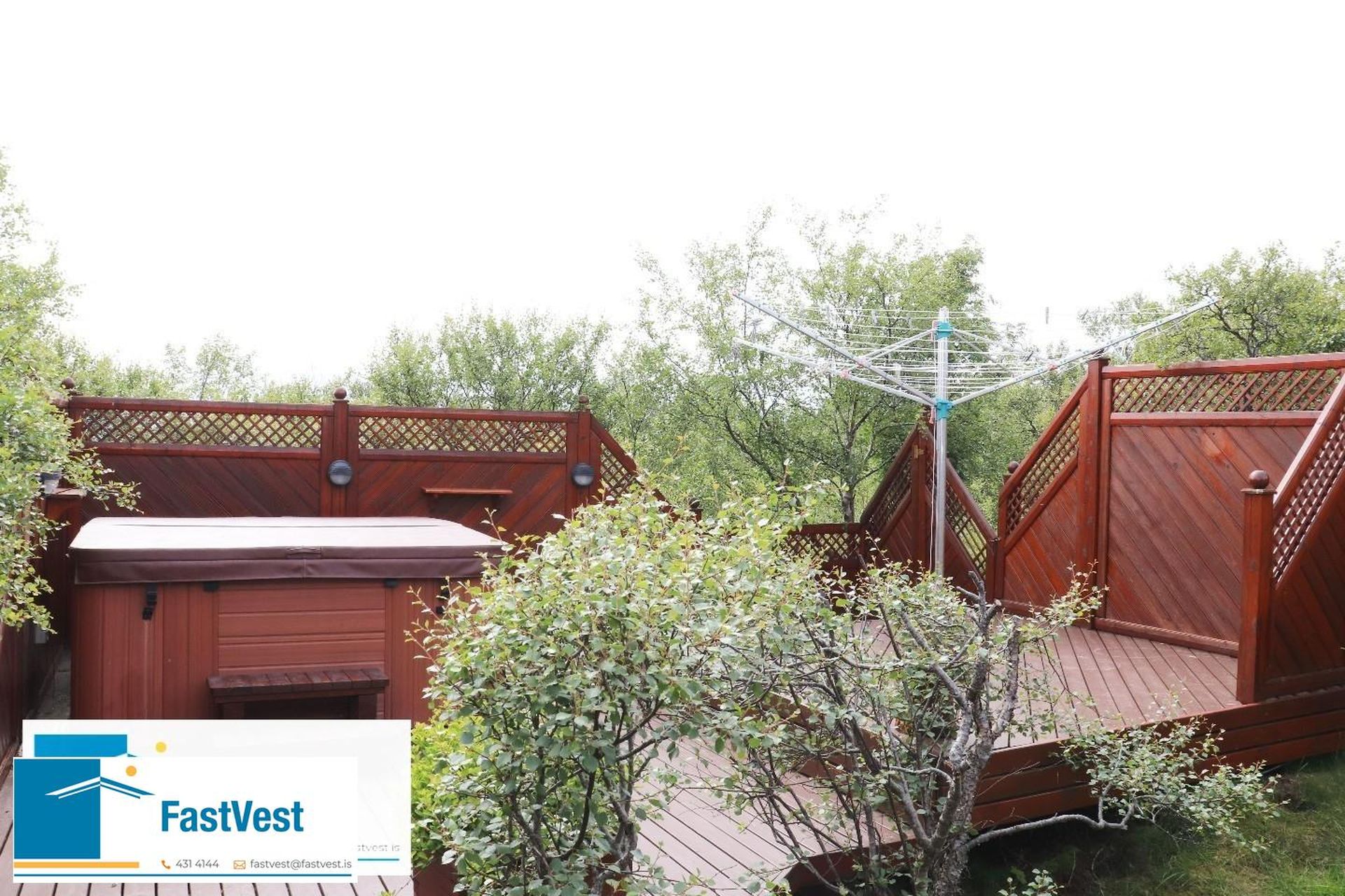 Nálægt sundlaug í Varmalandi, golf á Hamri og Glanna, þjónustumiðstöð í Munaðarnesi. Falleg aðkoma með timburstíg og rólegt umhverfi.
