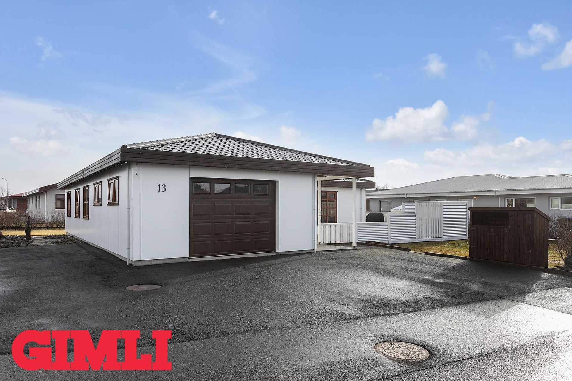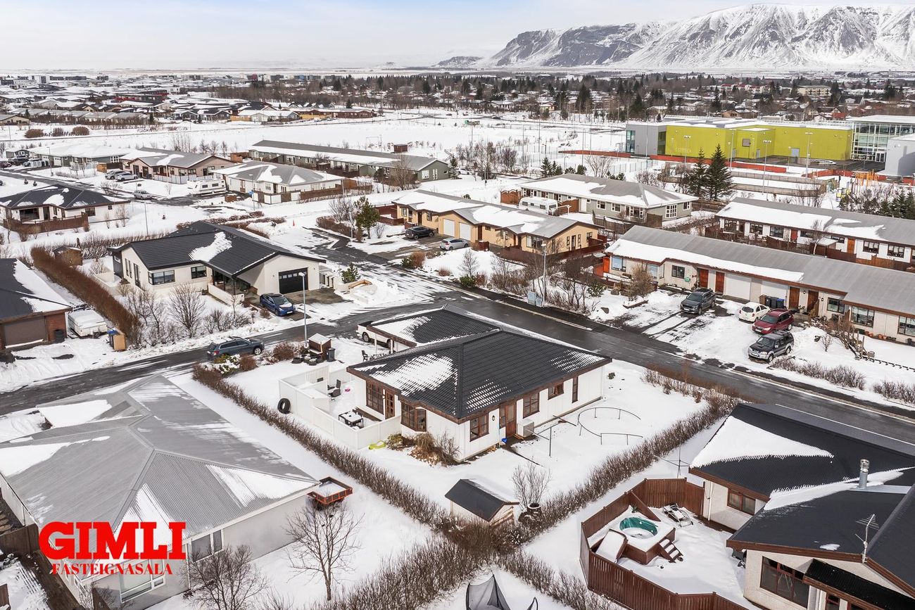 Lýsing: Húsið er á einni hæð, timburhús sem er áklætt. Íbúðarrými er 129,8fm, geymsla/herbergi og bað inn af forstofu 14,5fm og bílskúr 33,3fm, samtals 184,6fm. Gengið er inn af skjólgóðri verönd í rúmgóða forstofu með fataskáp. Úr forstofu er gengið inn á gang með baðherbergi og herbergi sem skv. teikningum er skrá geymsla. Af gangi er innangengt í bílskúr. Úr forstofu er gengið inn í sjónvarpshol. Úr holi eru þrjú svefnherbergi og bað, á vinstri hönd, og stofa og eldhús á hægri hönd. Hjónaherbergi er me glugga á tvo vegu og góðum fataskápum sem ná upp í loft. Svefnherbegi II og III eru rúmgóð með tvöföldum skápum sem ná upp í loft. Baðherbergi er með hornbaðkari og sturtu, góðri innréttingu og upphengdu salerni.