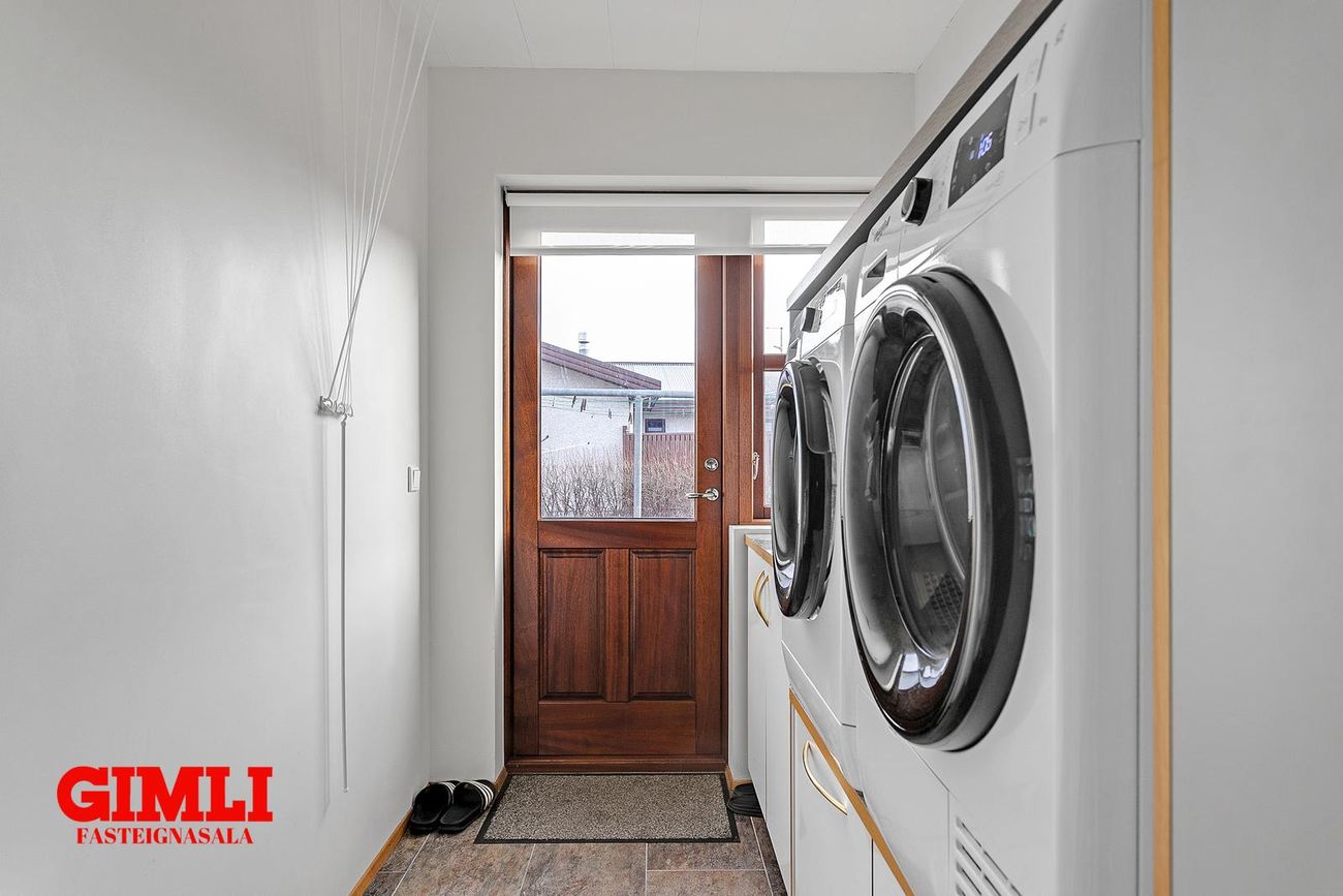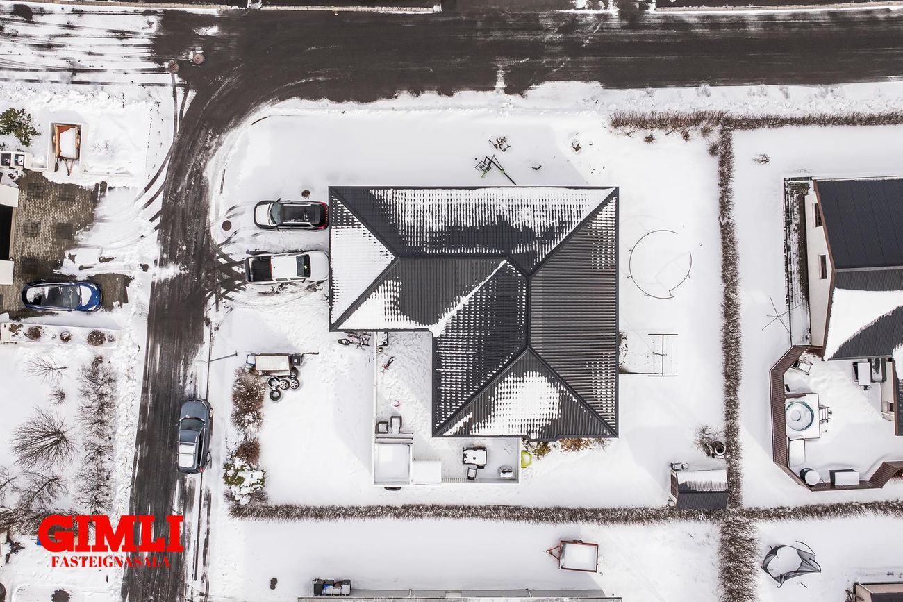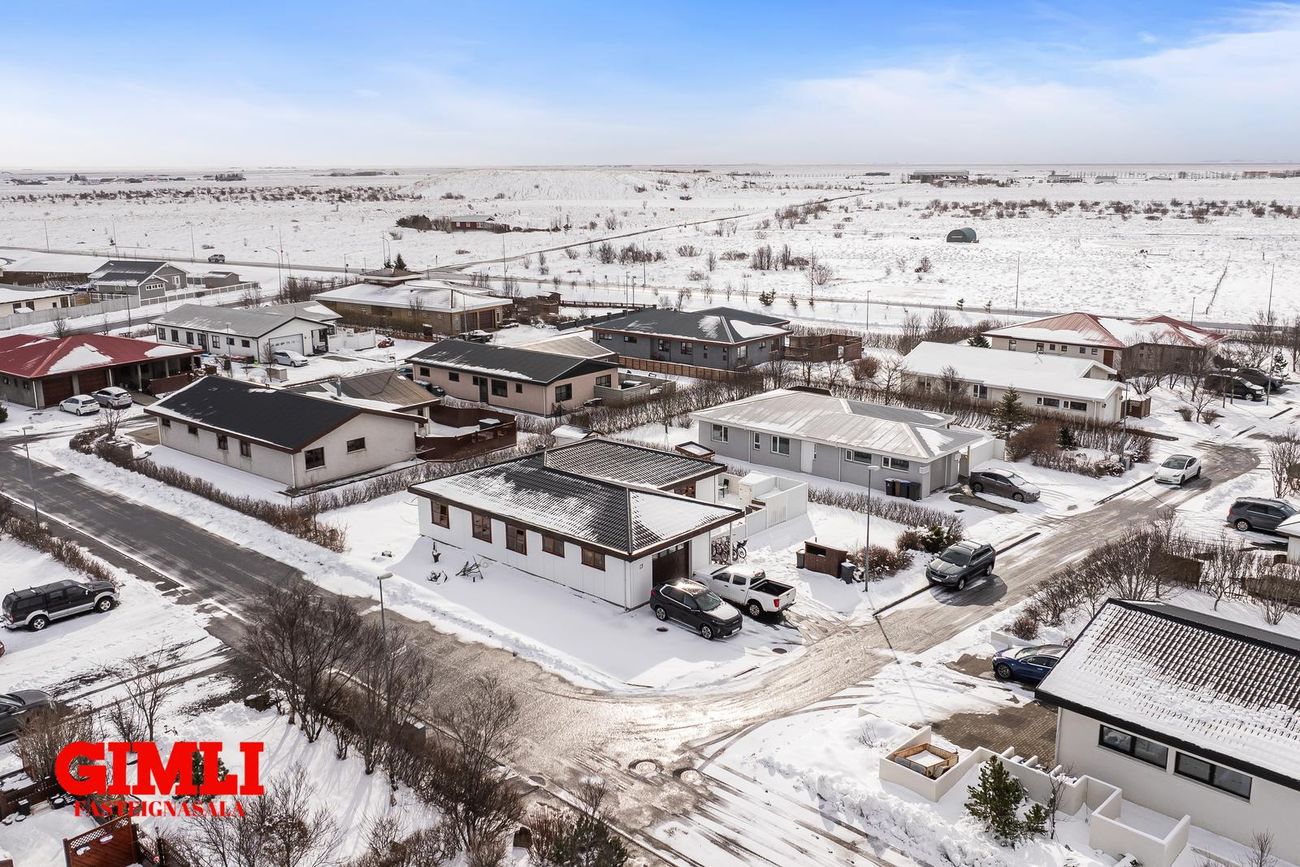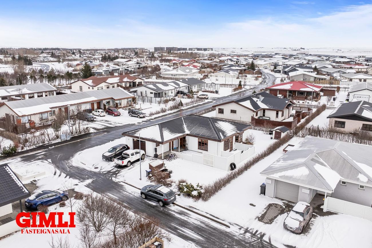 Gott flæði er úr holi inn í eldhús og stofurými, en veggur á milli borðstofu og stofu er léttur og flísalagt er undir veggnum svo einfallt er að fjarlægja hann. Eldhús er með vandaðri innréttingu, innbyggðum ísskáp og innbyggðri uppþvottavél, rafmagnshelluborði og bakaraofni í innréttingu. Borðstofa er hluti af eldhúsi og er með fallegum glugga. Gengið er úr eldhúsi inn í búr/þvottahús með góðum skáp og innréttinu og þaðan er hurð út í garð. Stofan er björt og rúmgóð með hurð út á verönd. Upptekin loft eru í eigninni og innfelld lýsing, öll rými eru flísalögð en gólfhiti er í allri eigninni. Húsið stendur á gróinni 770fm hornlóð með veglegum palli, heitum potti og stóru bílaplani. Möguleiki er á að leggja húsbíl eða hjólhýsi.