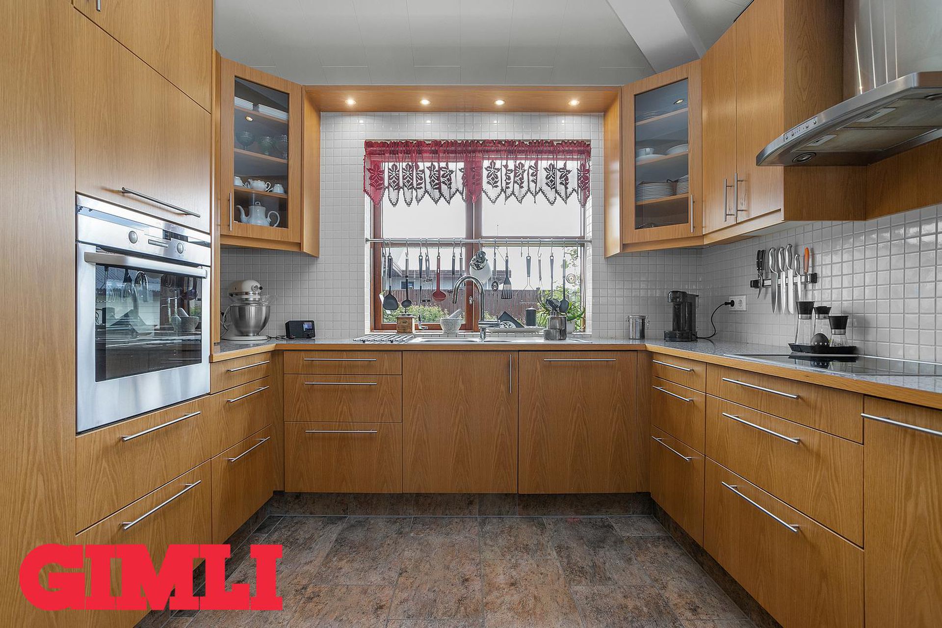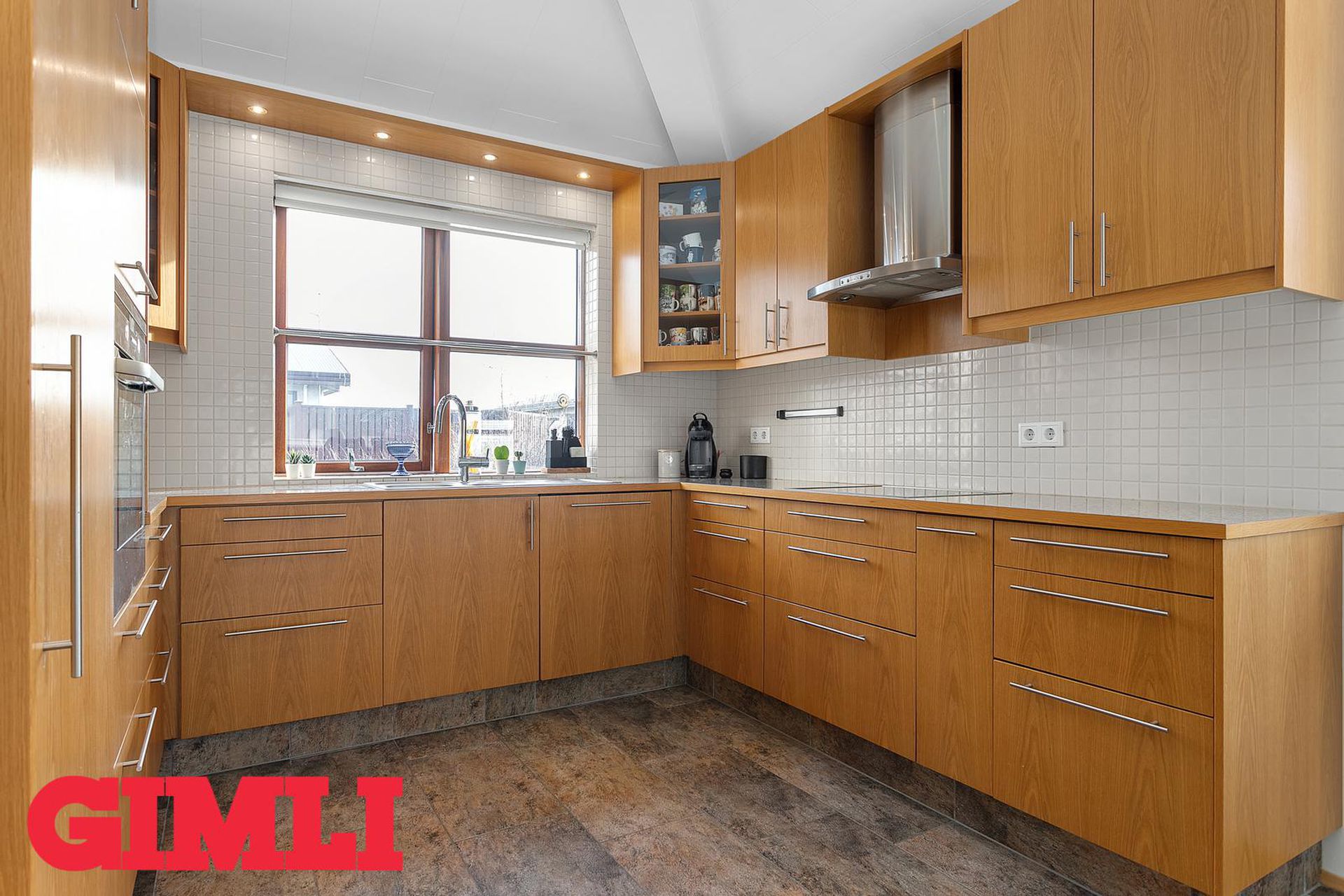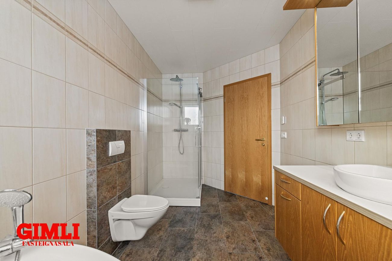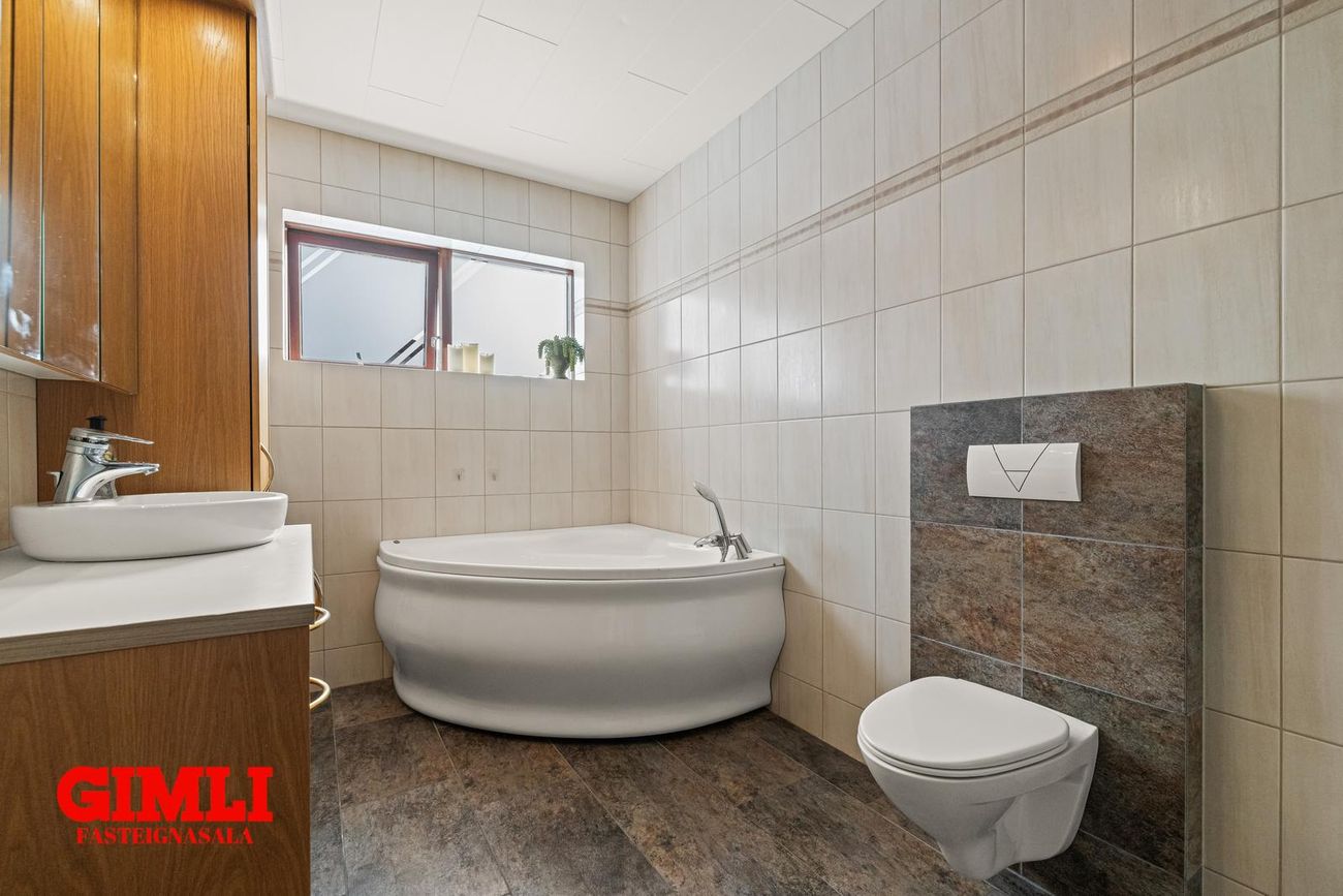 Gott flæði er úr holi inn í eldhús og stofurými, en veggur á milli borðstofu og stofu er léttur og flísalagt er undir veggnum svo einfallt er að fjarlægja hann. Eldhús er með vandaðri innréttingu, innbyggðum ísskáp og innbyggðri uppþvottavél, rafmagnshelluborði og bakaraofni í innréttingu. Borðstofa er hluti af eldhúsi og er með fallegum glugga. Gengið er úr eldhúsi inn í búr/þvottahús með góðum skáp og innréttinu og þaðan er hurð út í garð. Stofan er björt og rúmgóð með hurð út á verönd. Upptekin loft eru í eigninni og innfelld lýsing, öll rými eru flísalögð en gólfhiti er í allri eigninni. Húsið stendur á gróinni 770fm hornlóð með veglegum palli, heitum potti og stóru bílaplani. Möguleiki er á að leggja húsbíl eða hjólhýsi.