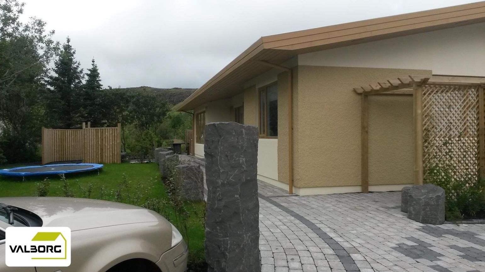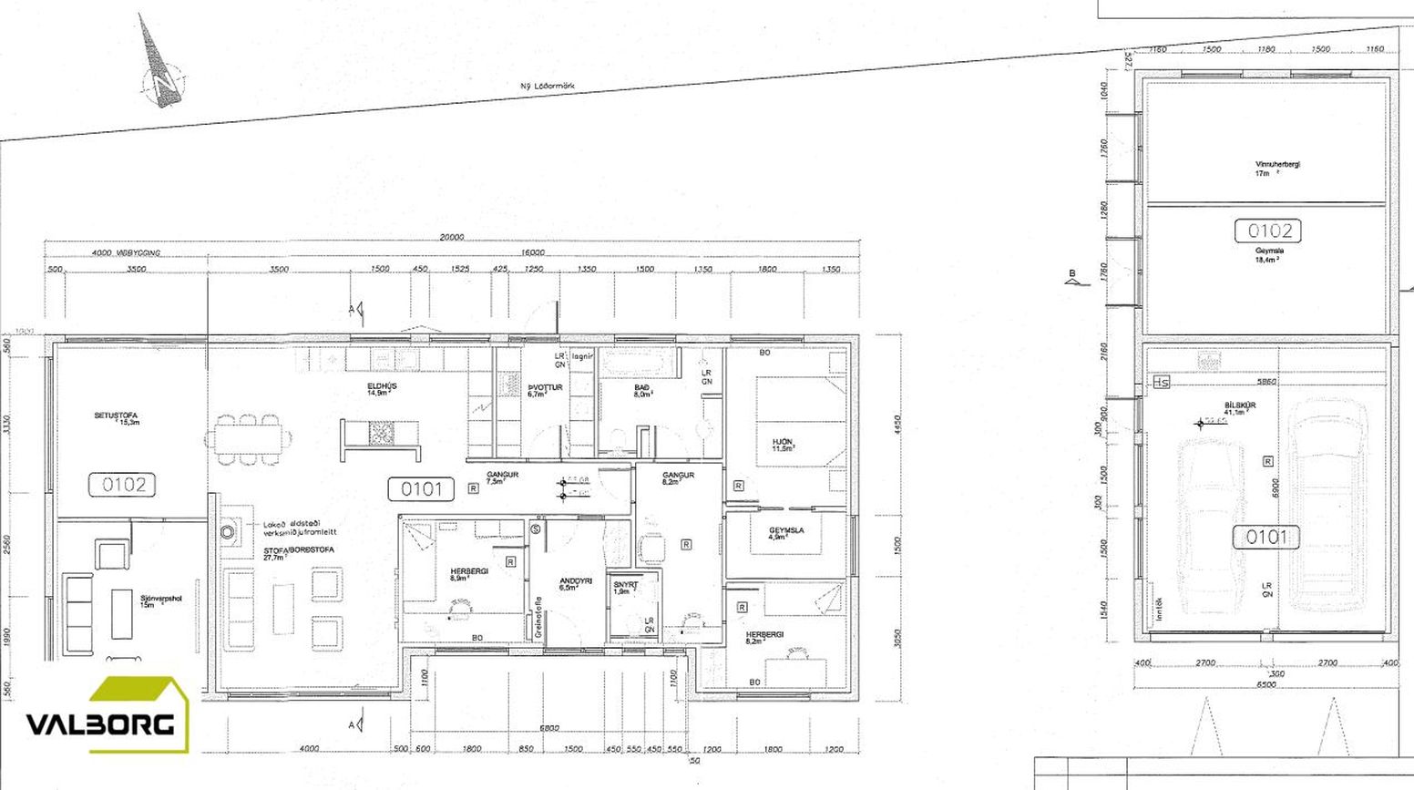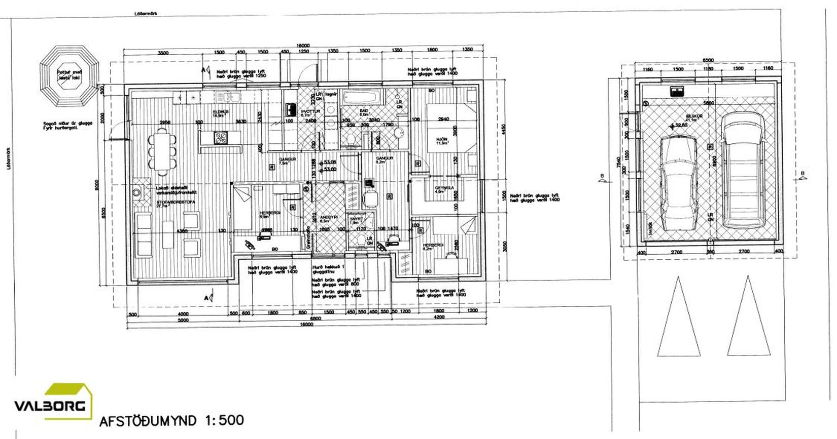 Hellulagt bílastæði er fyrir framan bílskúrinn og góð geymsla er fyrir aftan bílskúrinn.