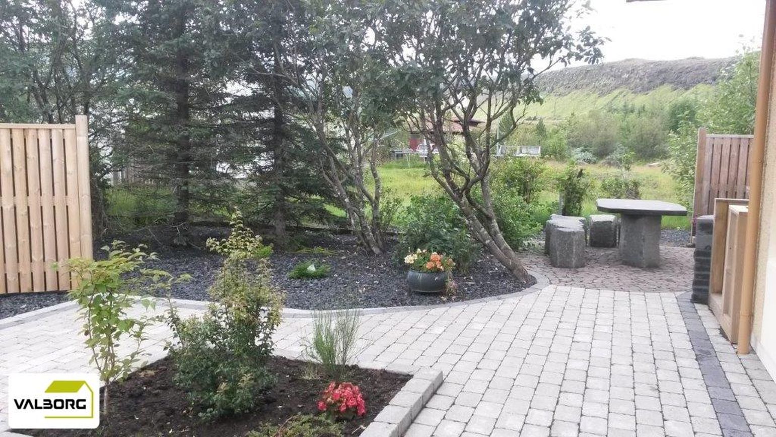 Garðurinn er verðlaunagarður og mikið hefur verið gert til að gera allt umhverfið sem snyrtilegast og notagildið mikið. Hellulagt er að eigninni, stórir gróðurkassar eru á baklóð, mikið er af fallegum gróðri, heitur pottur og næðið og skjólið á baklóð við Hamarinn er virkilega eftirsóknarvert.