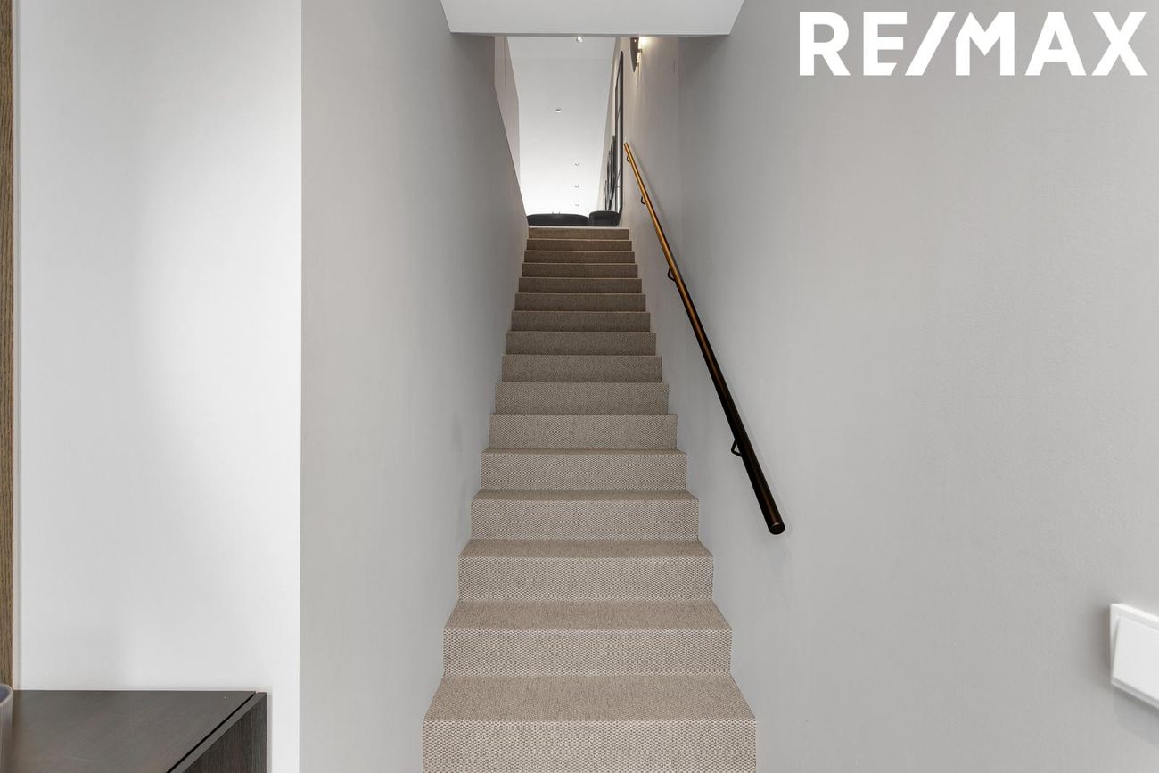 Stigi upp á hæð: með svörtu handriði og gleri. Kókosteppi á gólfi.