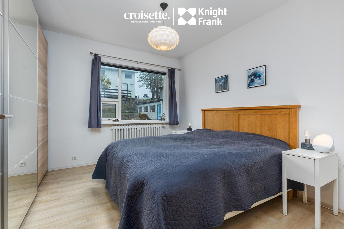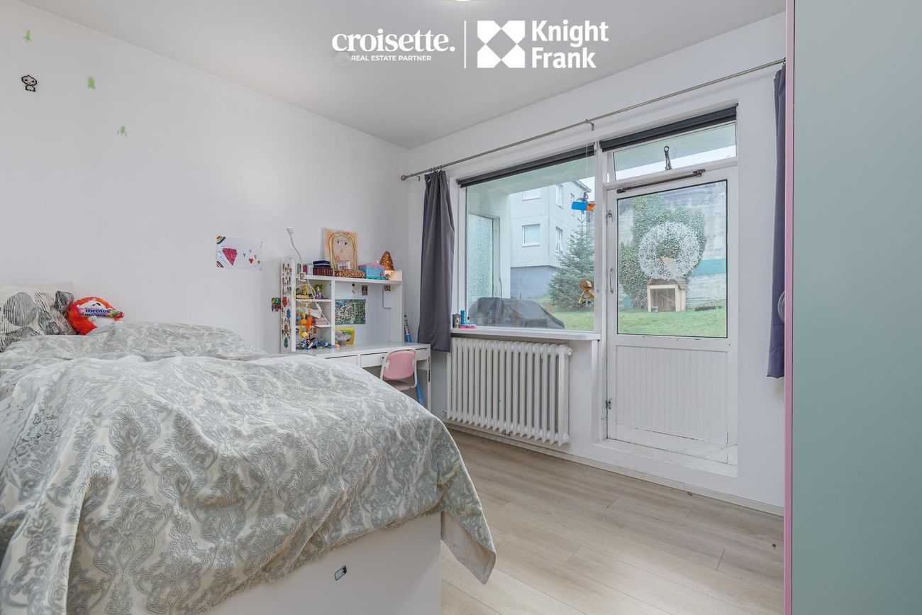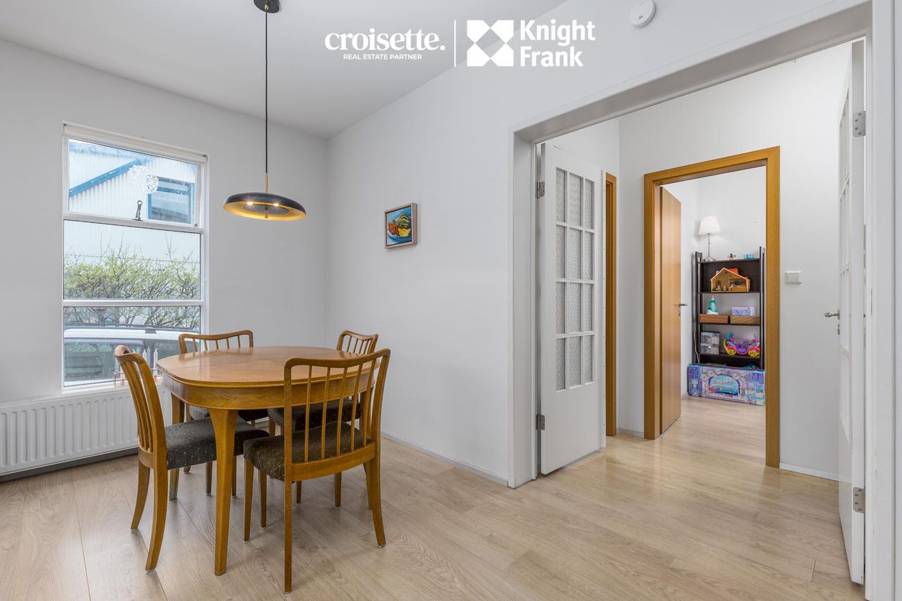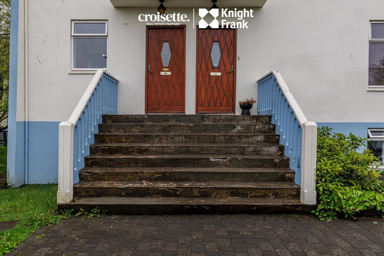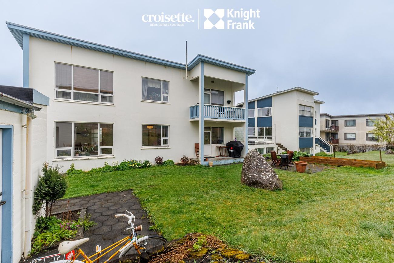 Íbúðin á miðhæð með beinneygðum aðgangi að garði. Skiftist í fjögur svefnherbergi, stofu, eldhús og baðherbergi.