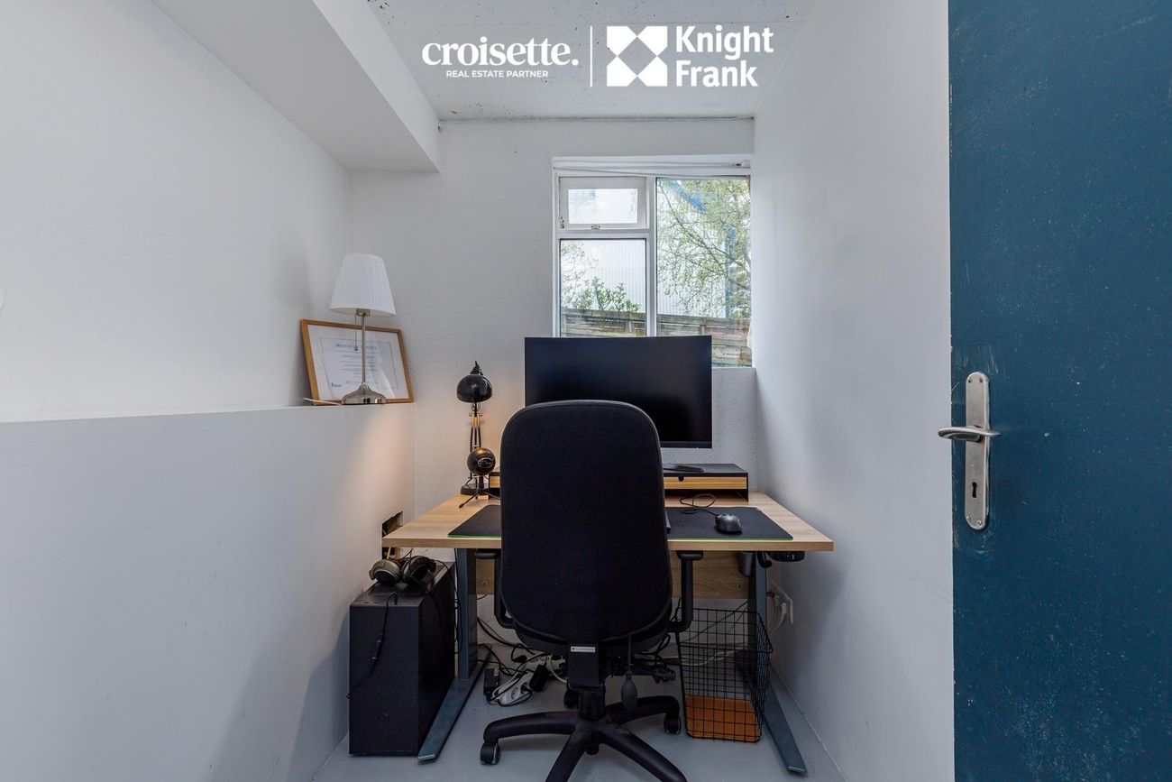 Geymsla í sameign notuð sem skrifstofa og köld útigeymsla undir stiga.