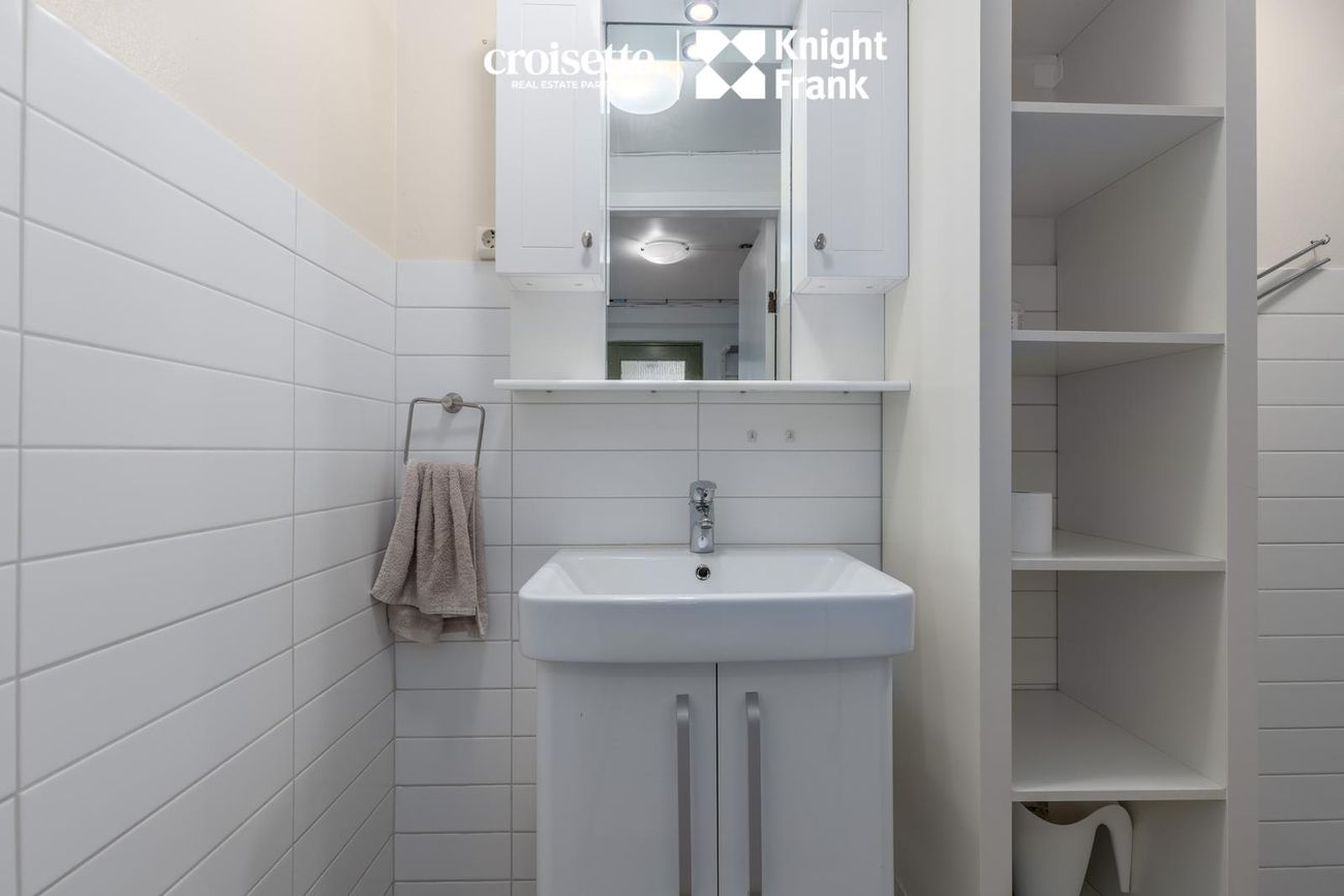 Kjallaraíbúð með flísalegum gólfum og tengi fyrir þvottavél.