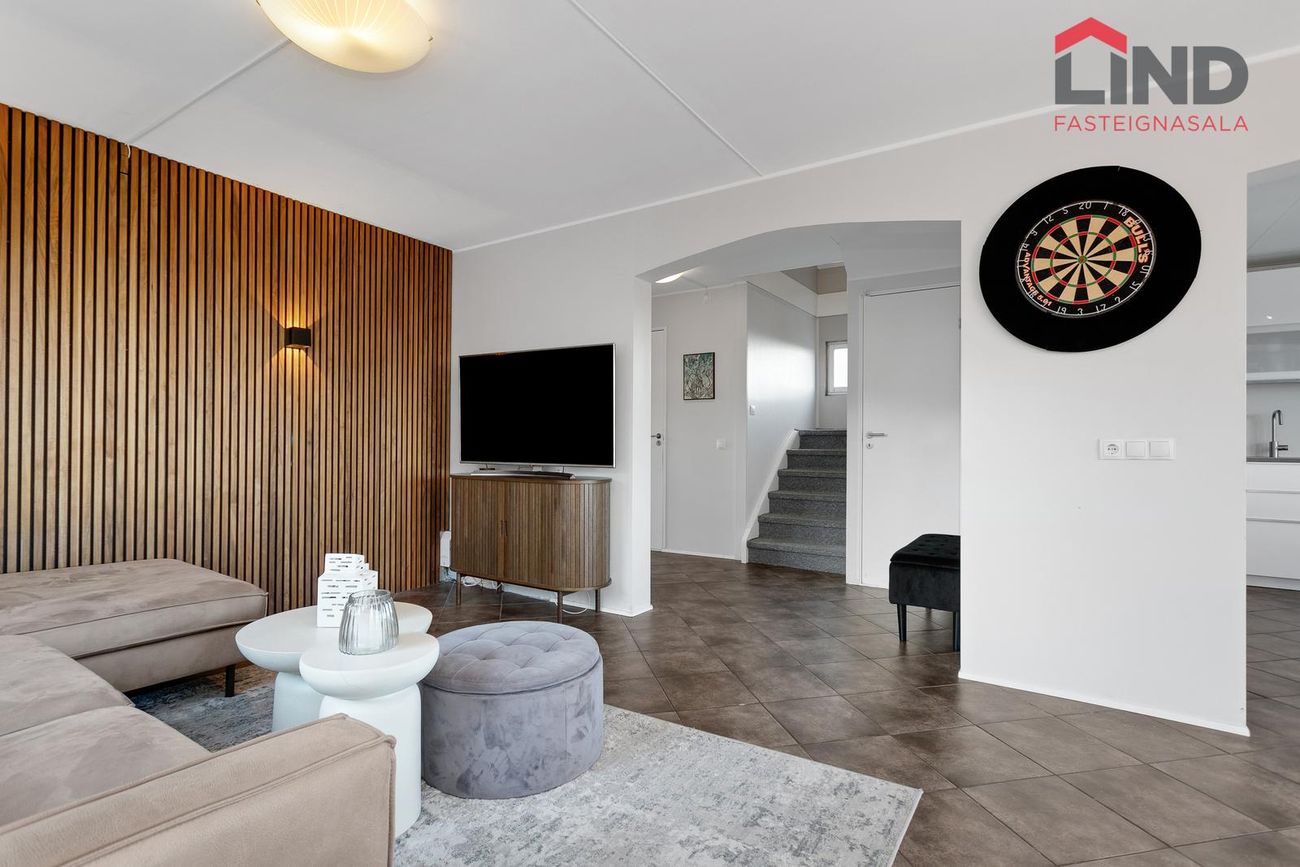 Gangur með flísum á gólfi tengir saman herbergi eldhús og stofur á neðri hæð.