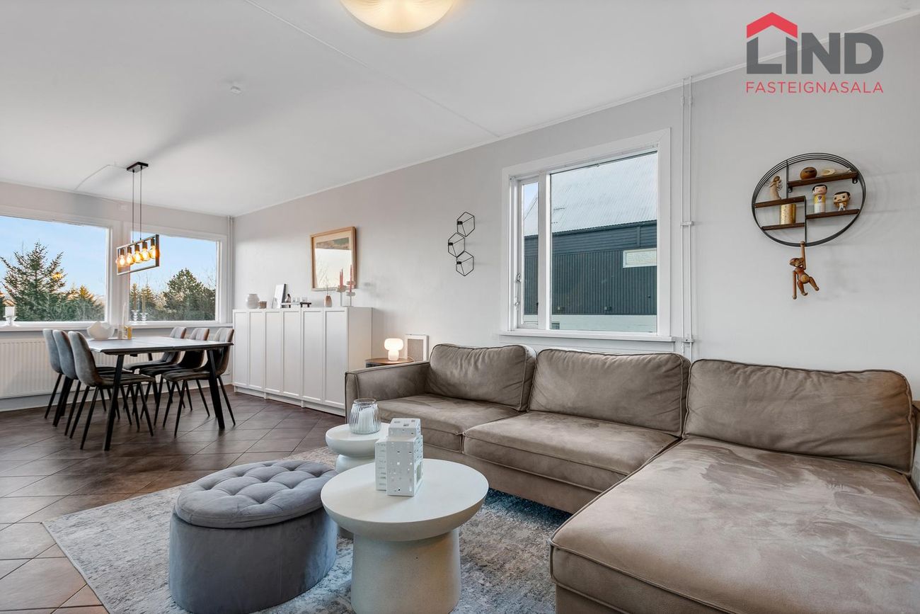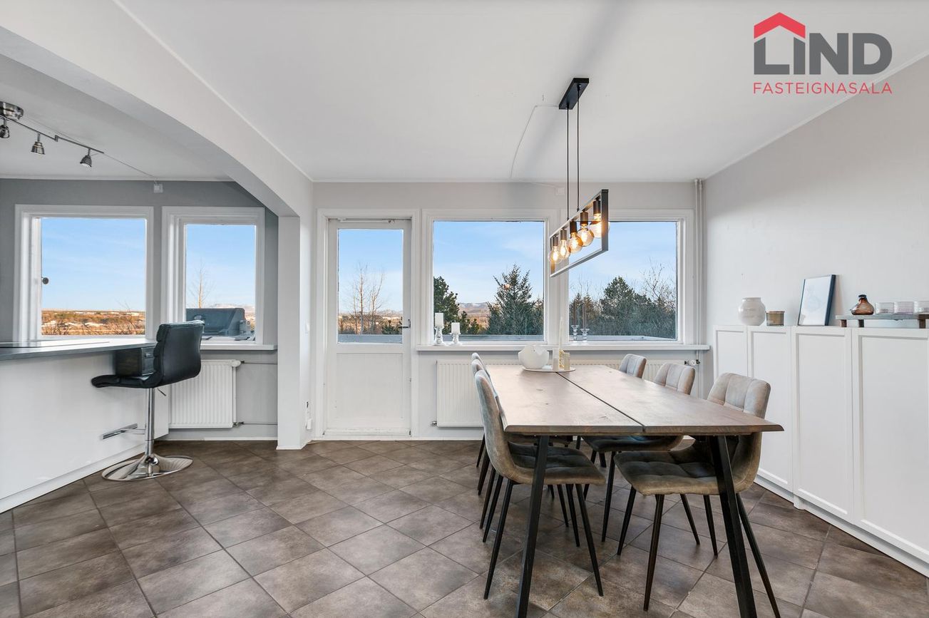 Stofa og borðastofa er samliggjandi með flísum á gólfi.