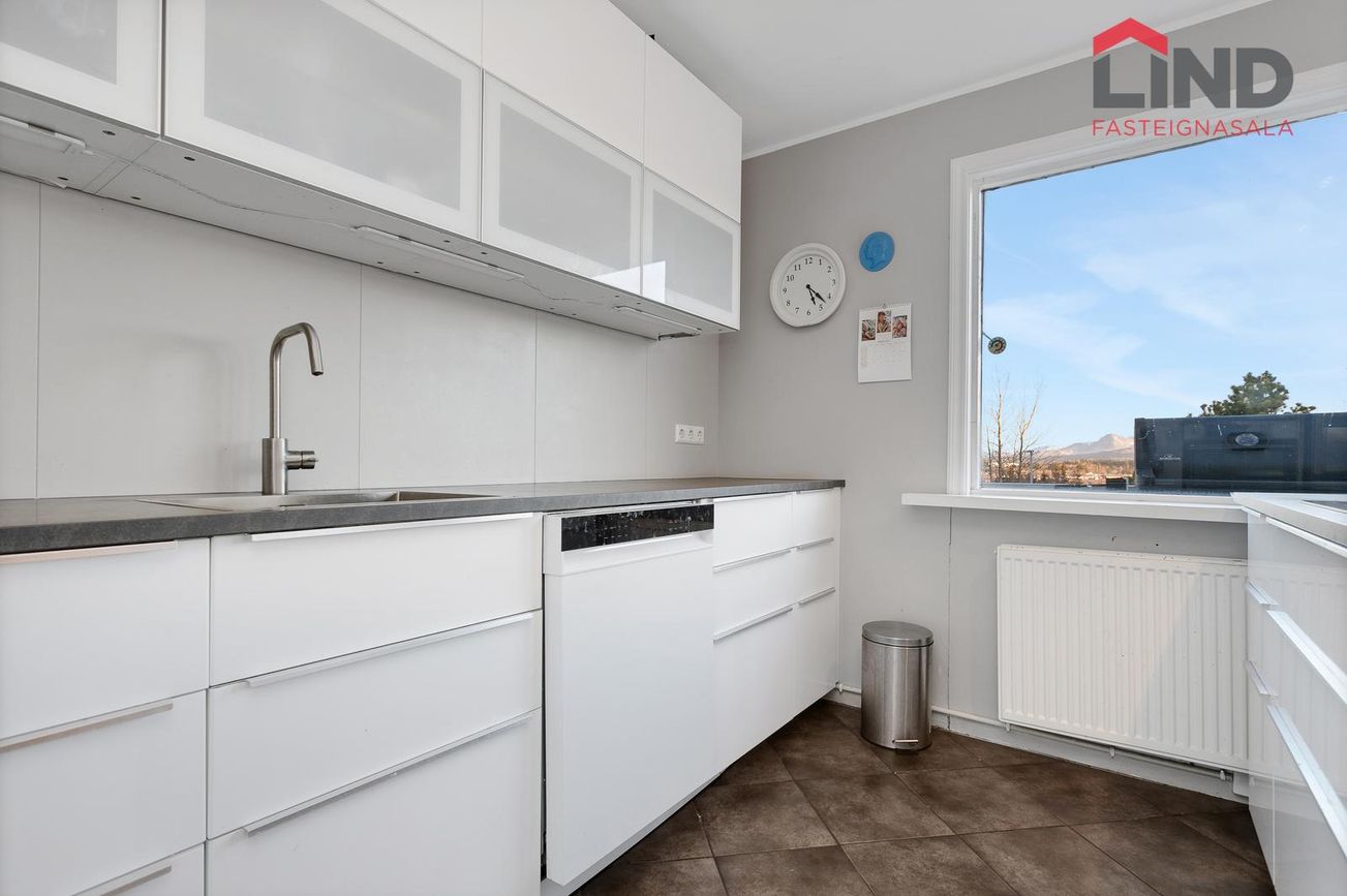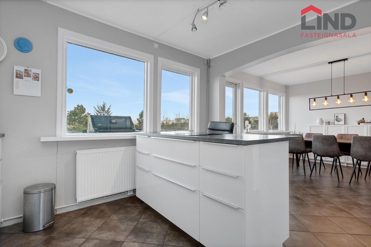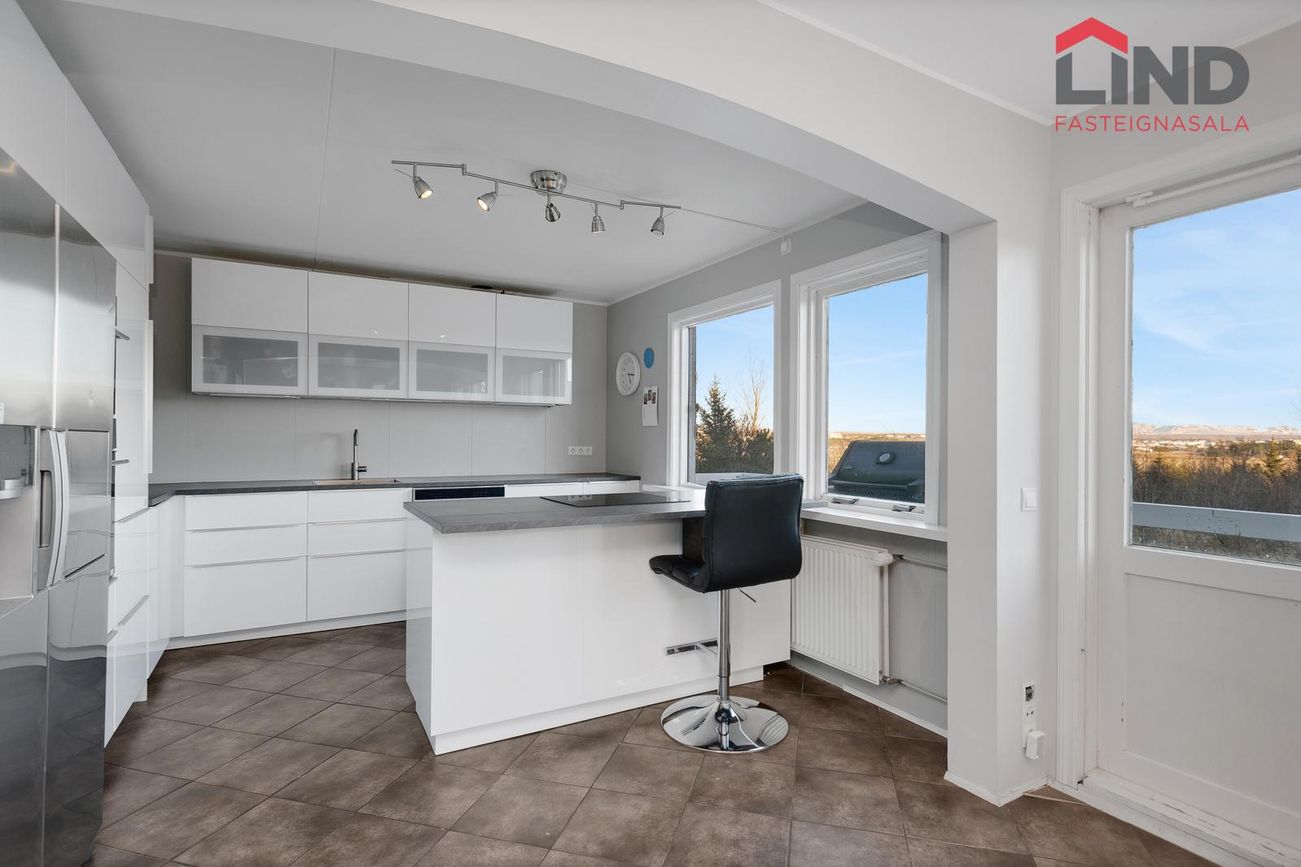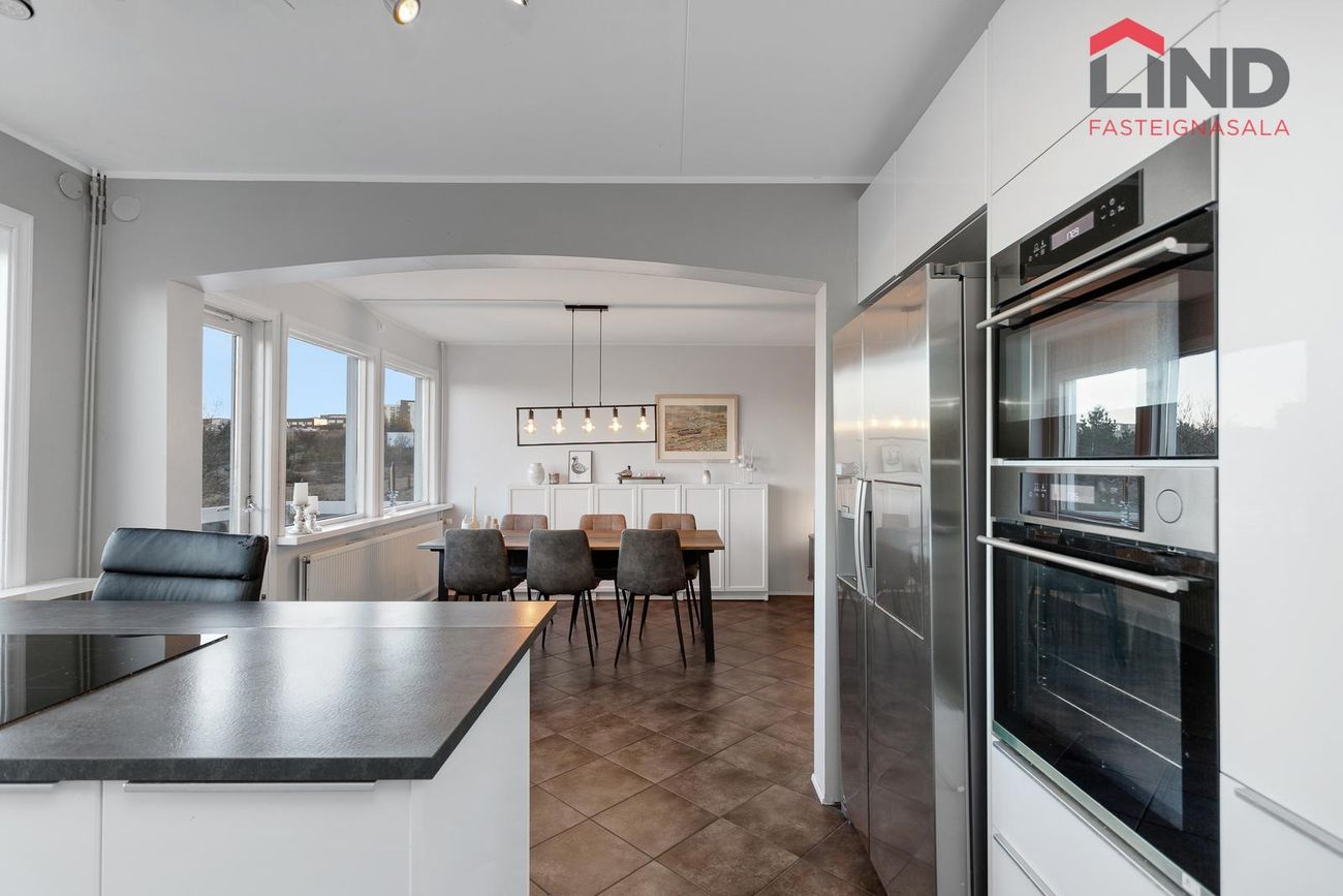 Eldhúsið er opið yfir í stofu með endurnýjaðri innréttingu og tækjum frá 2017, innréttingin er með efri og neðri skápum, eyja með span helluborði, gert er ráð fyrir tvöföldum ísskáp í innréttingu, tveir ofnar í vinnuhæð. útgengt út á svalir til vesturs með miklu útsýni.