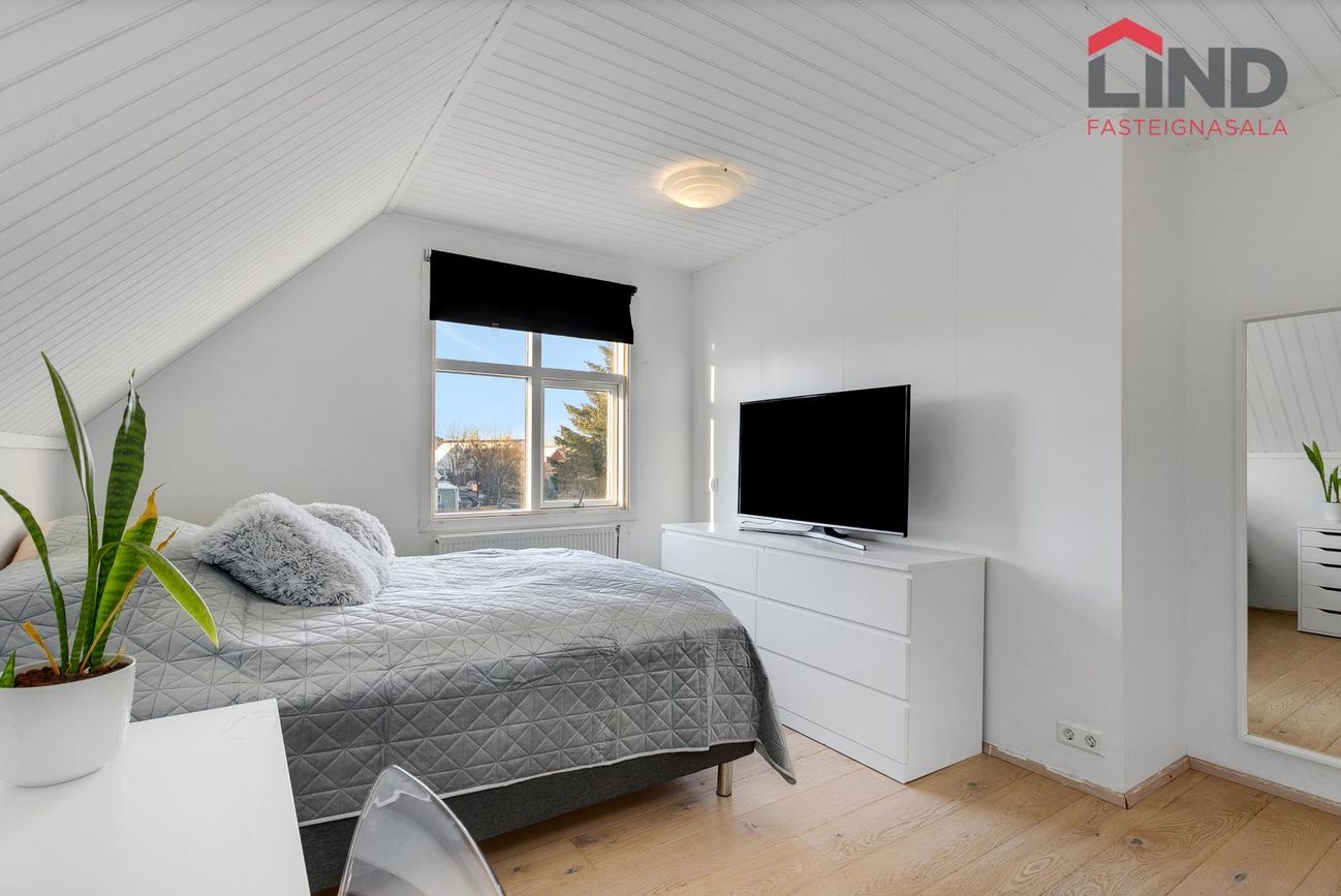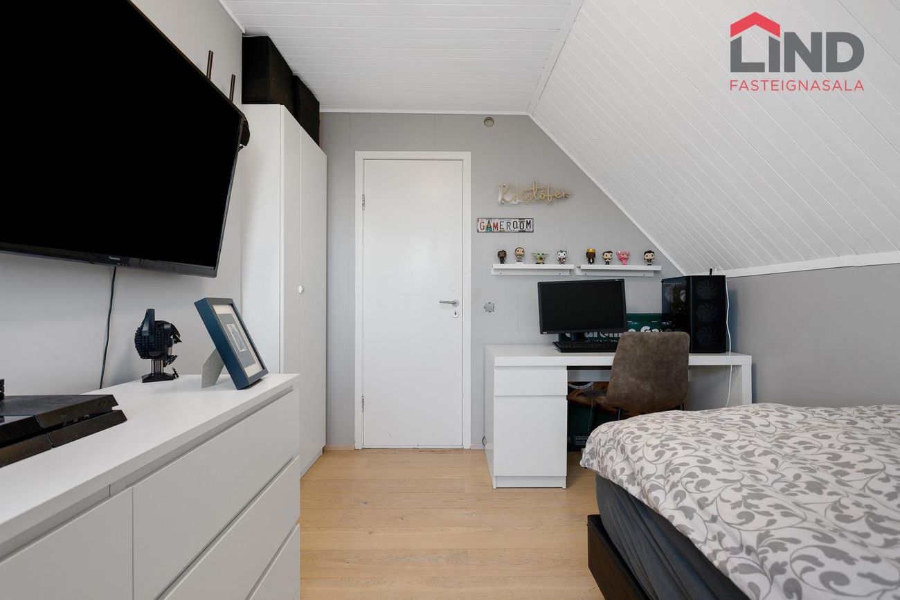 Svefnherbergi er hægra megin við inngang með flísalögðu gólfi.
