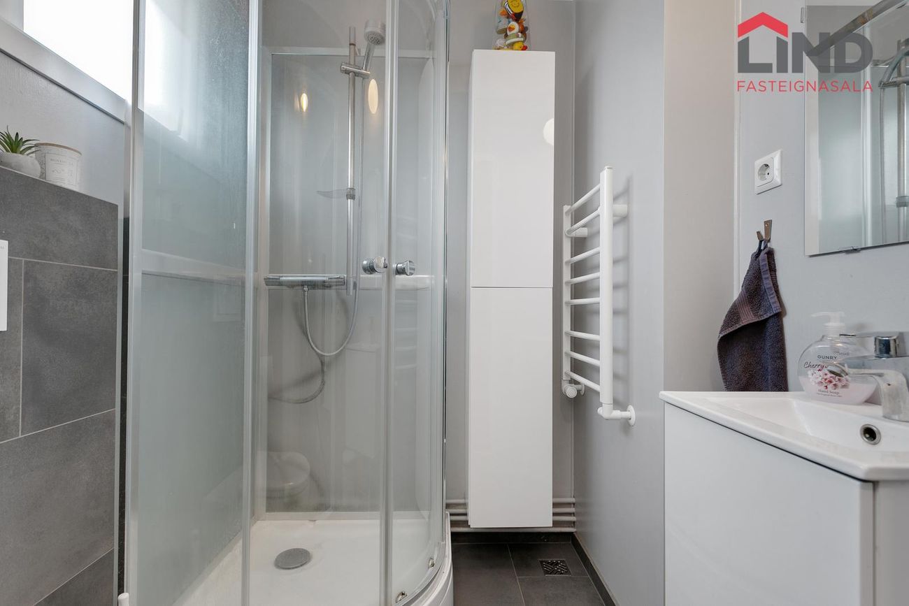 Baðherbergi endurnýjað 2024 með flísalögðu gólfi ( hiti í gólfi ) , hvítar innréttingar, upphengt salerni og sturtuklefi.