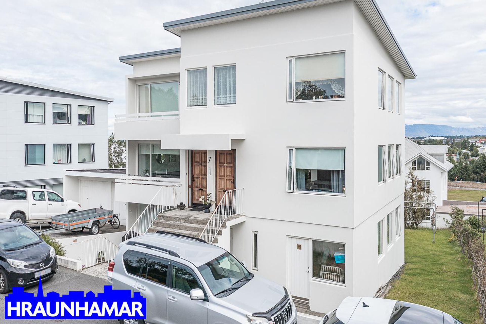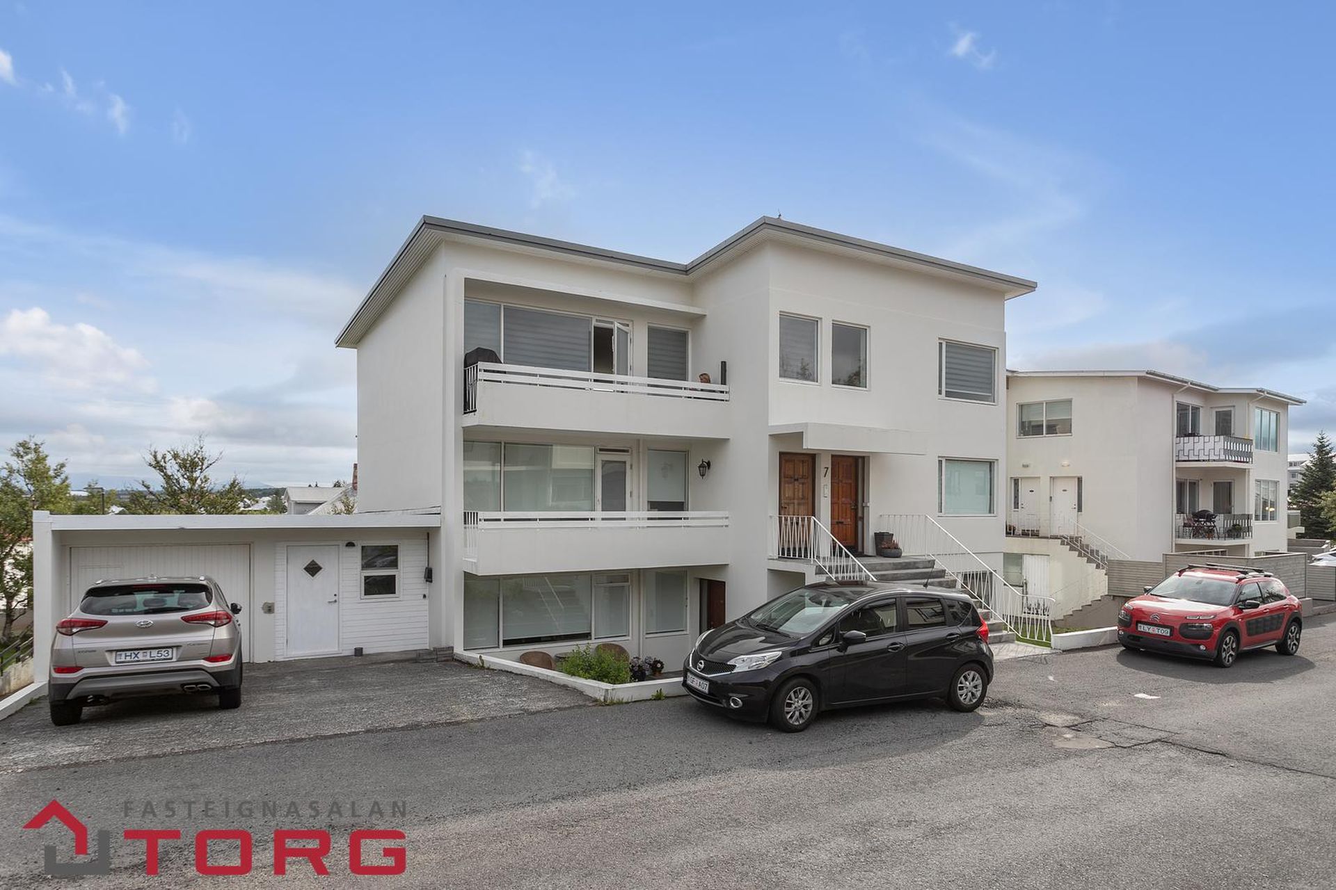 Bílskúr: með rafmagni, heitu- og köldu vatni og er staðsettur fjær aðalinngang til vinstri séð út frá götu.