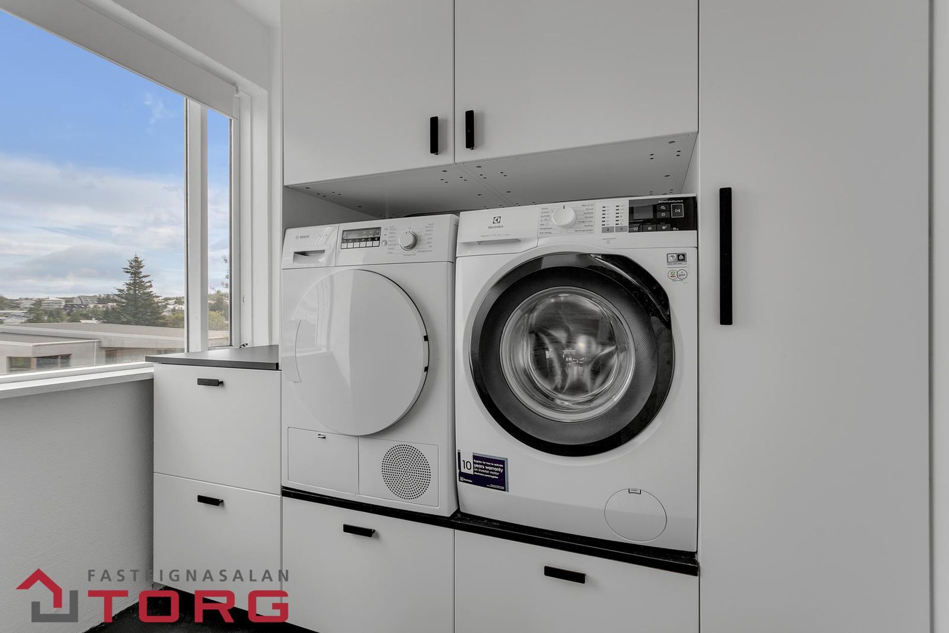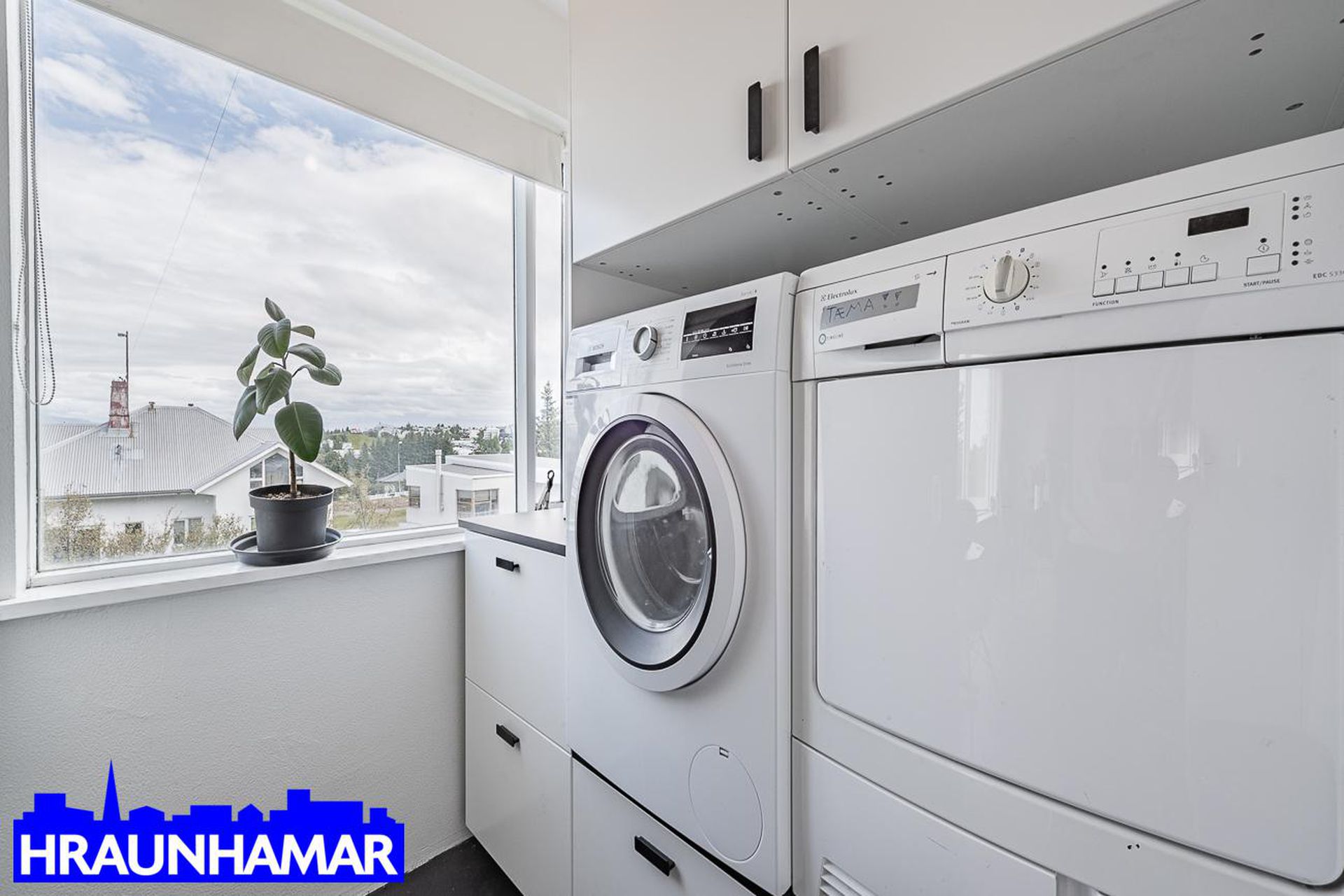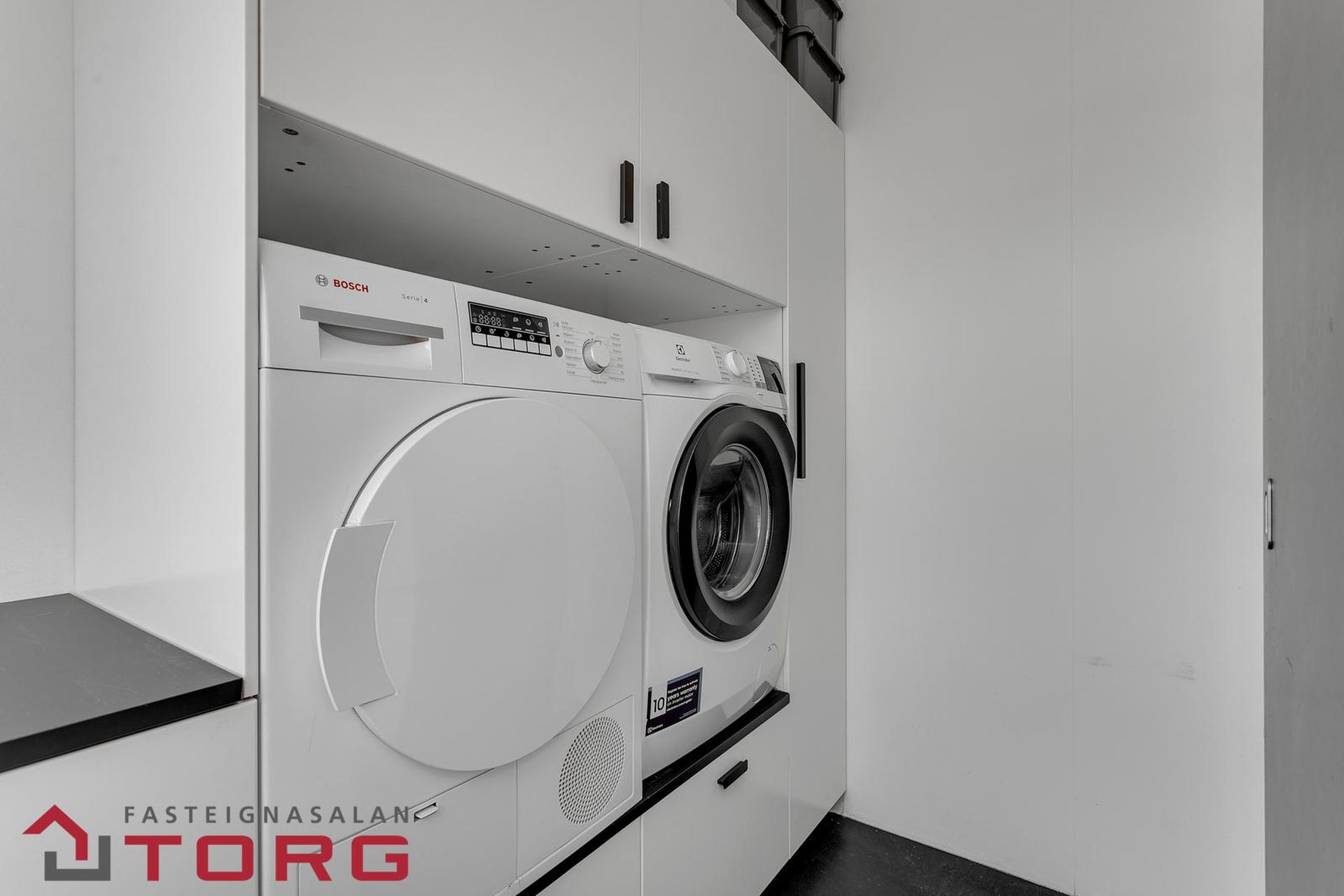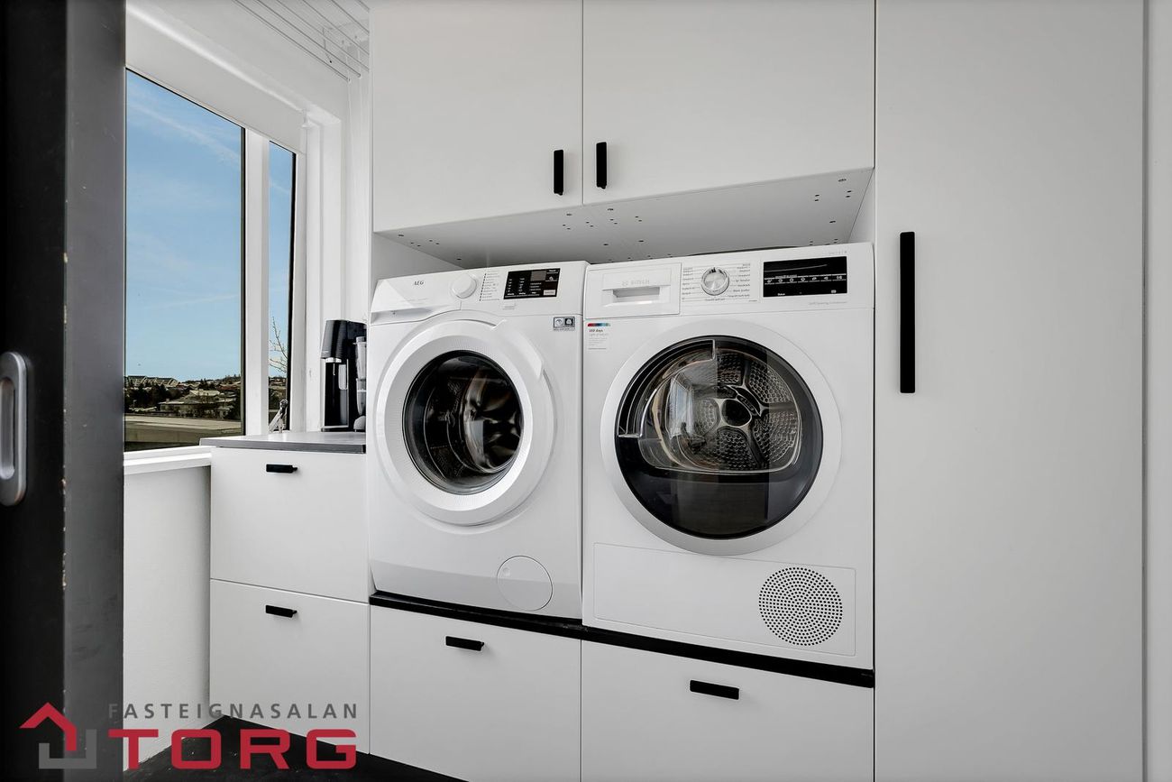 Þvottahús: Innaf eldhúsi. Innrétting fyrir þvottavél- og þurrkara í vinnuhæð.