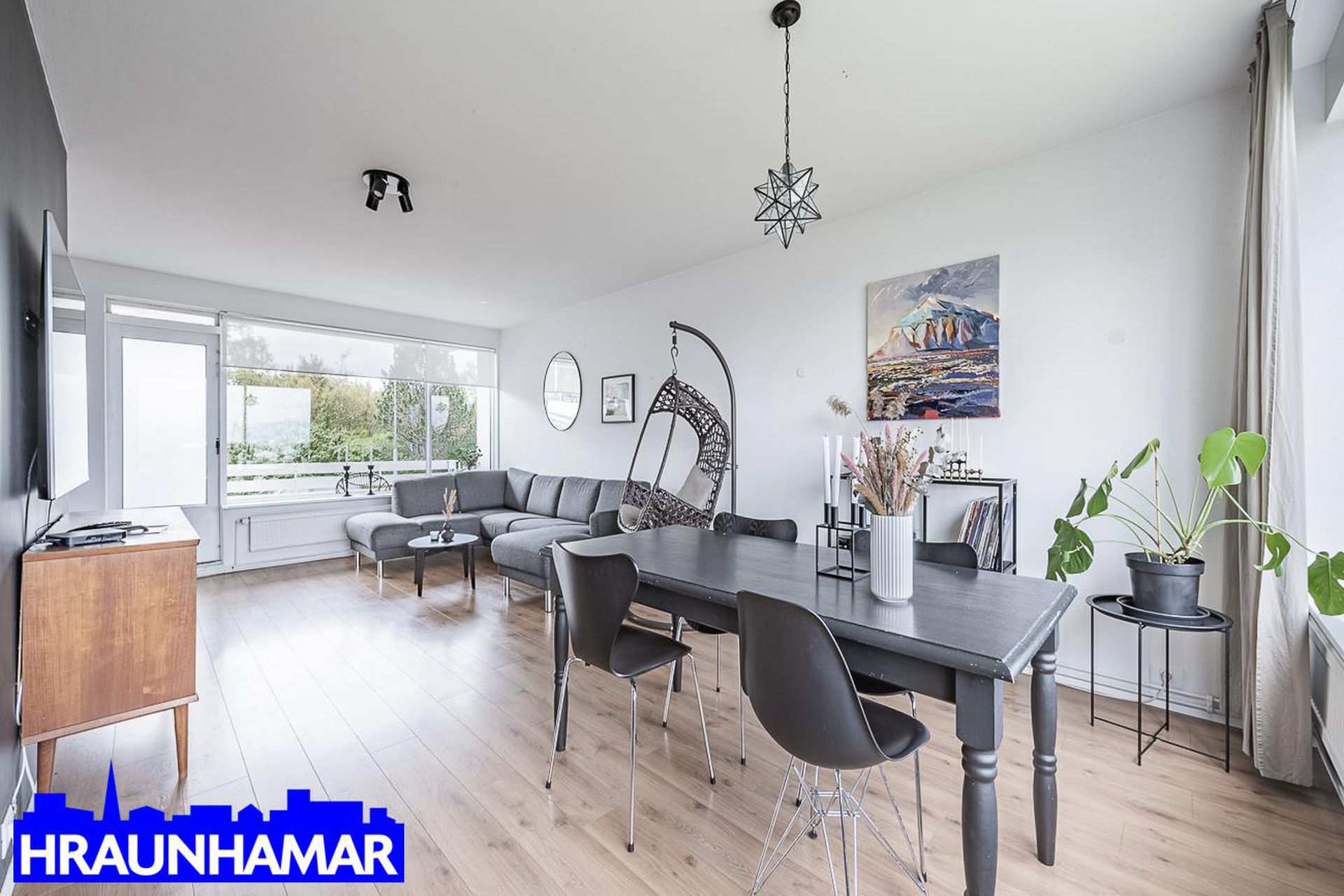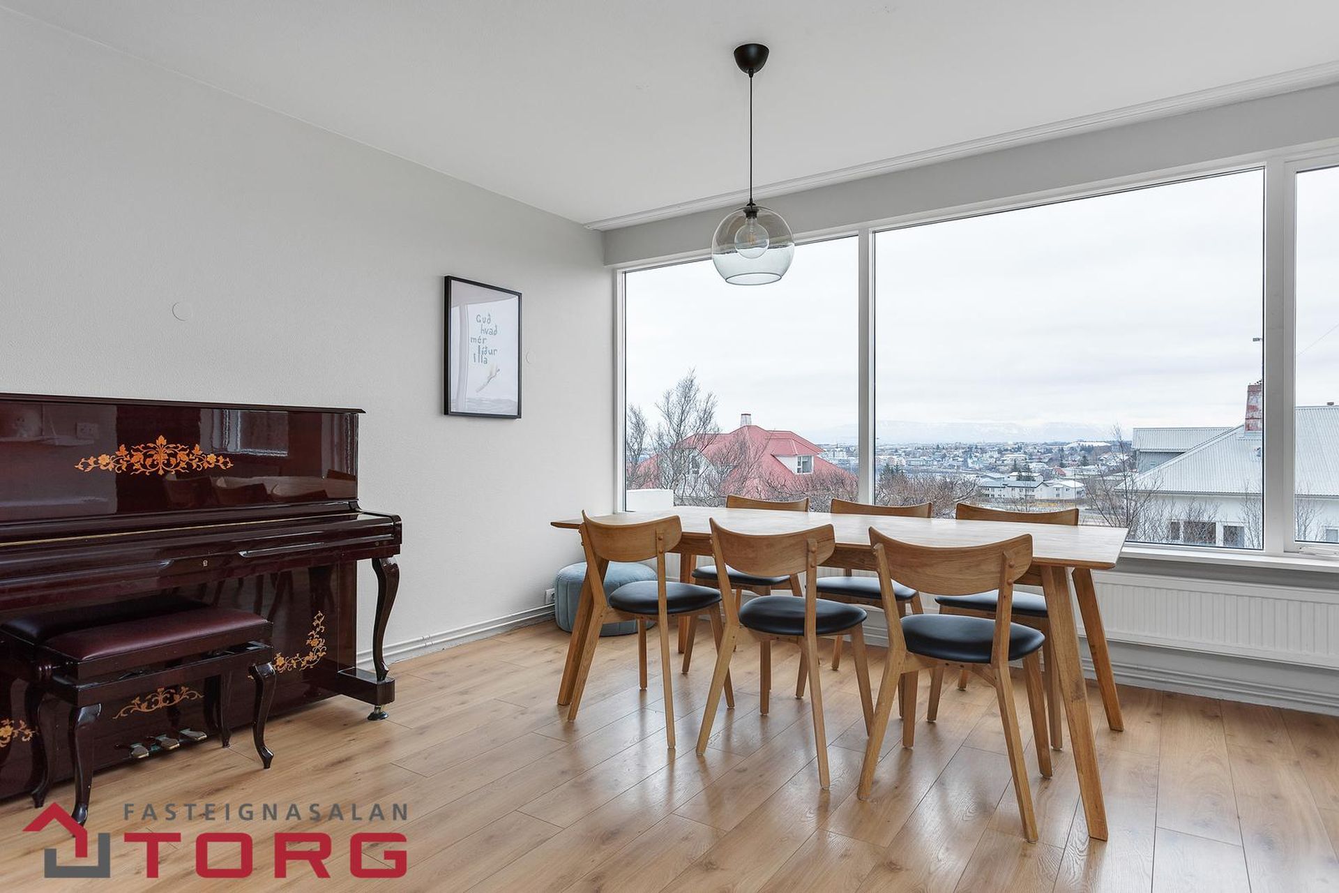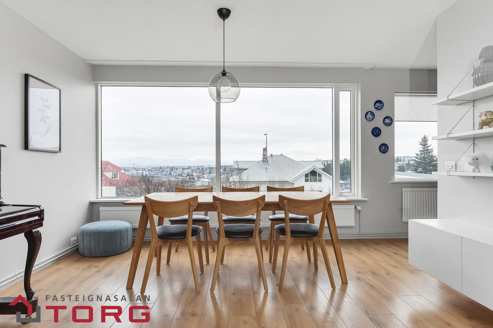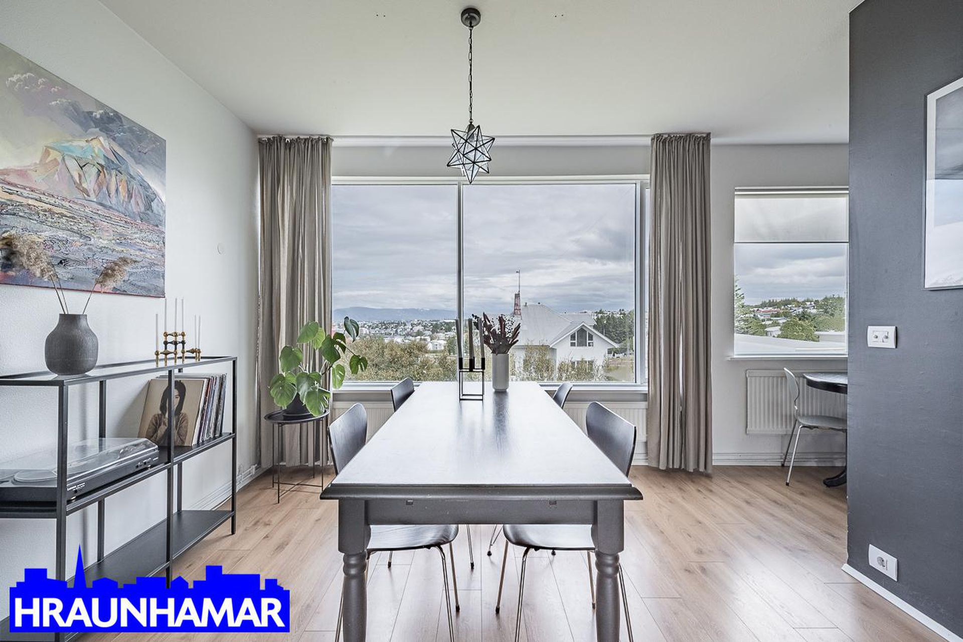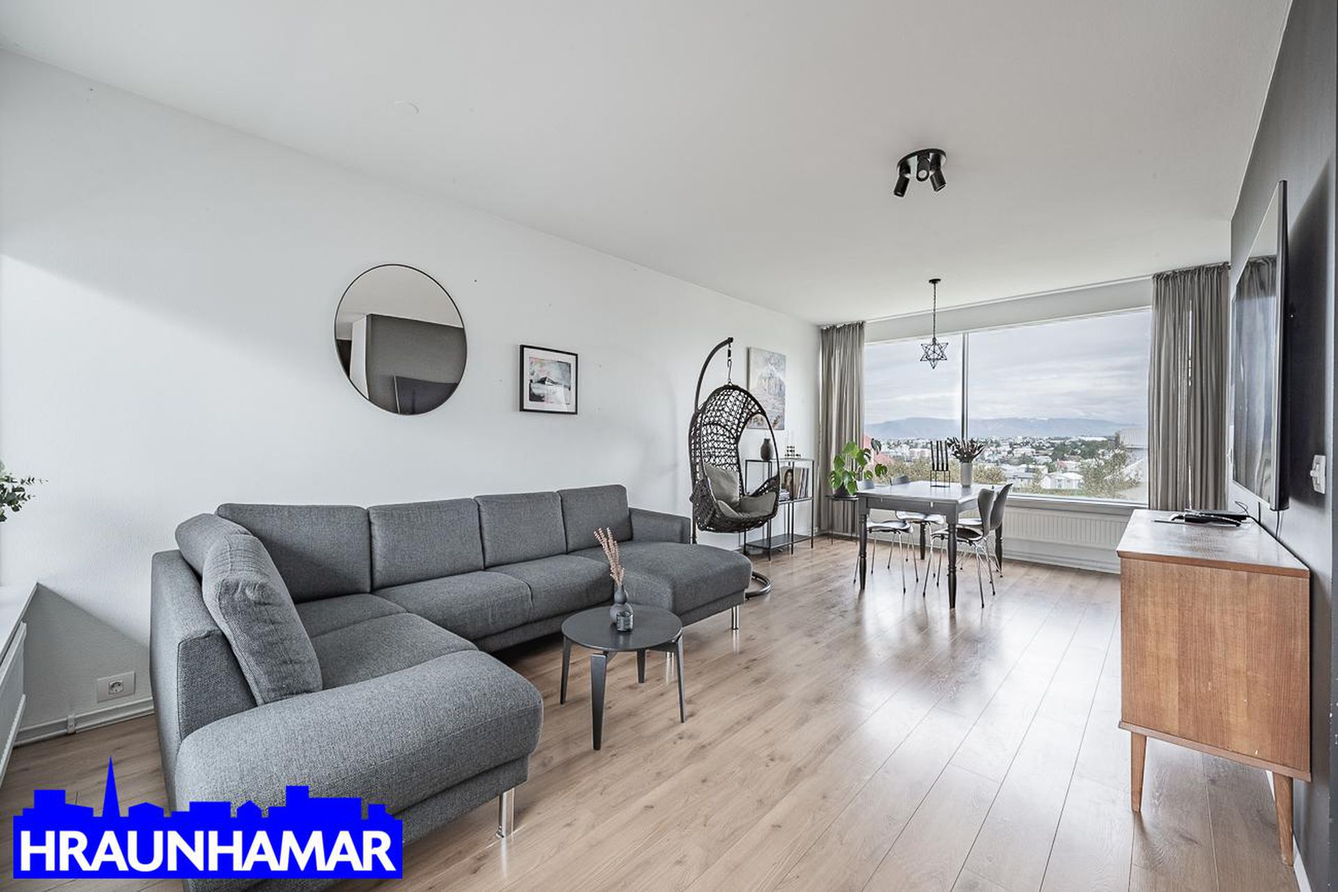 Stofa- og borðstofa: Mikið og fallegt útsýni í átt að gamla bænum í Hafnarfirði og að Esju. Frá stofu er gengið út á svalir sem snúa í suð-vestur. Parket á gólfi.