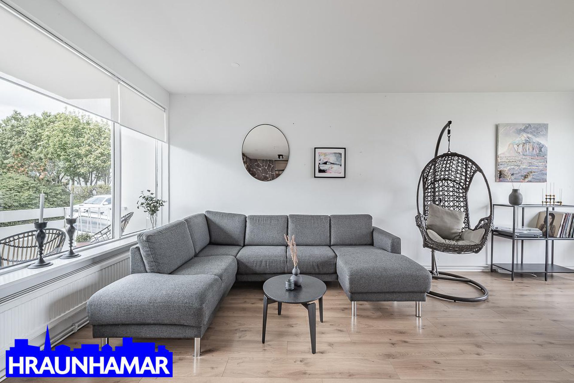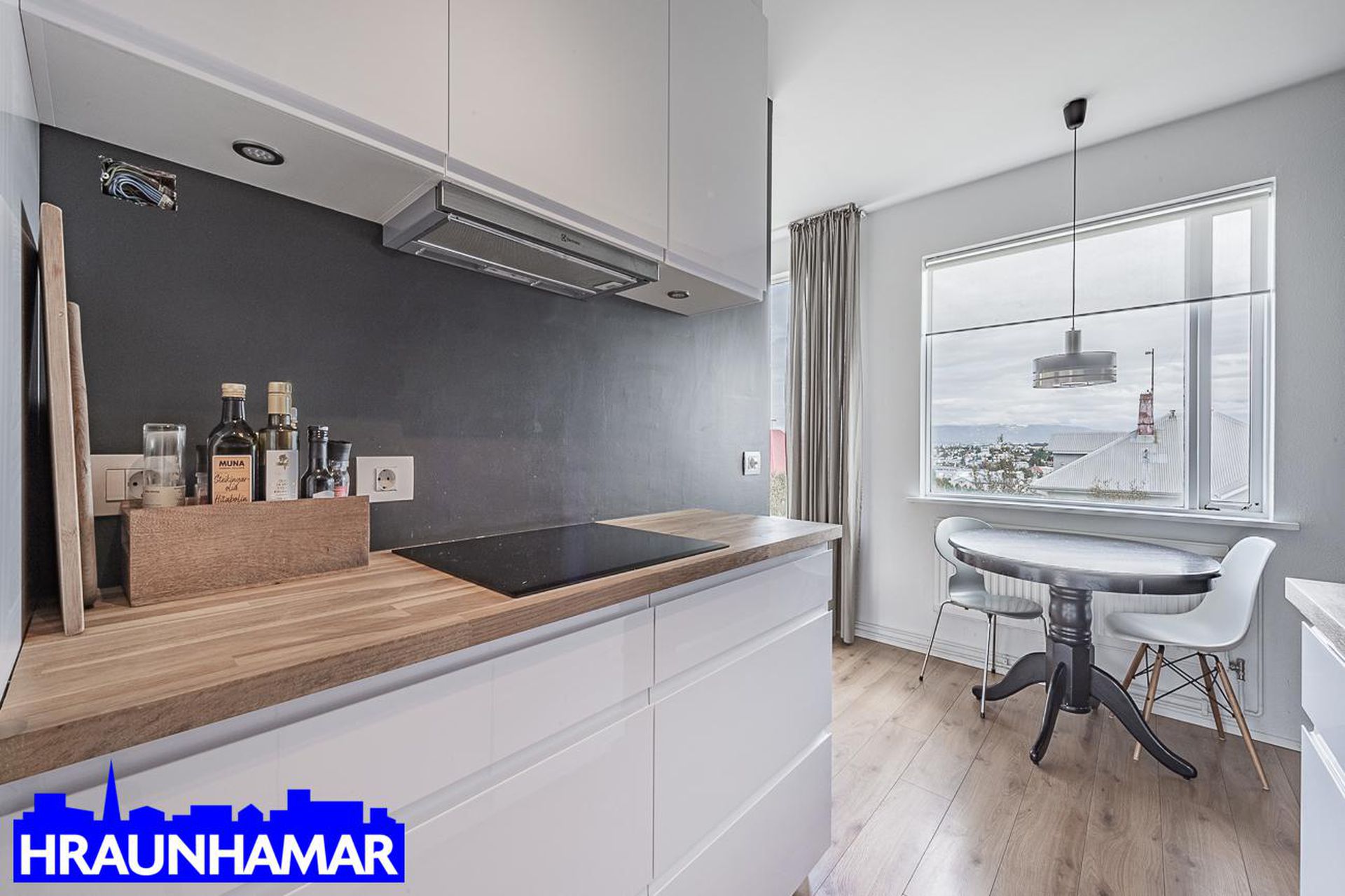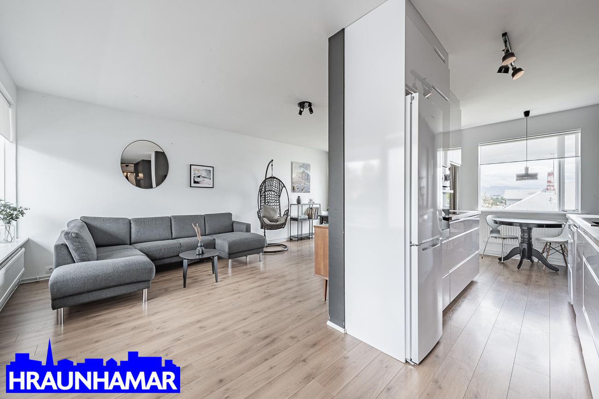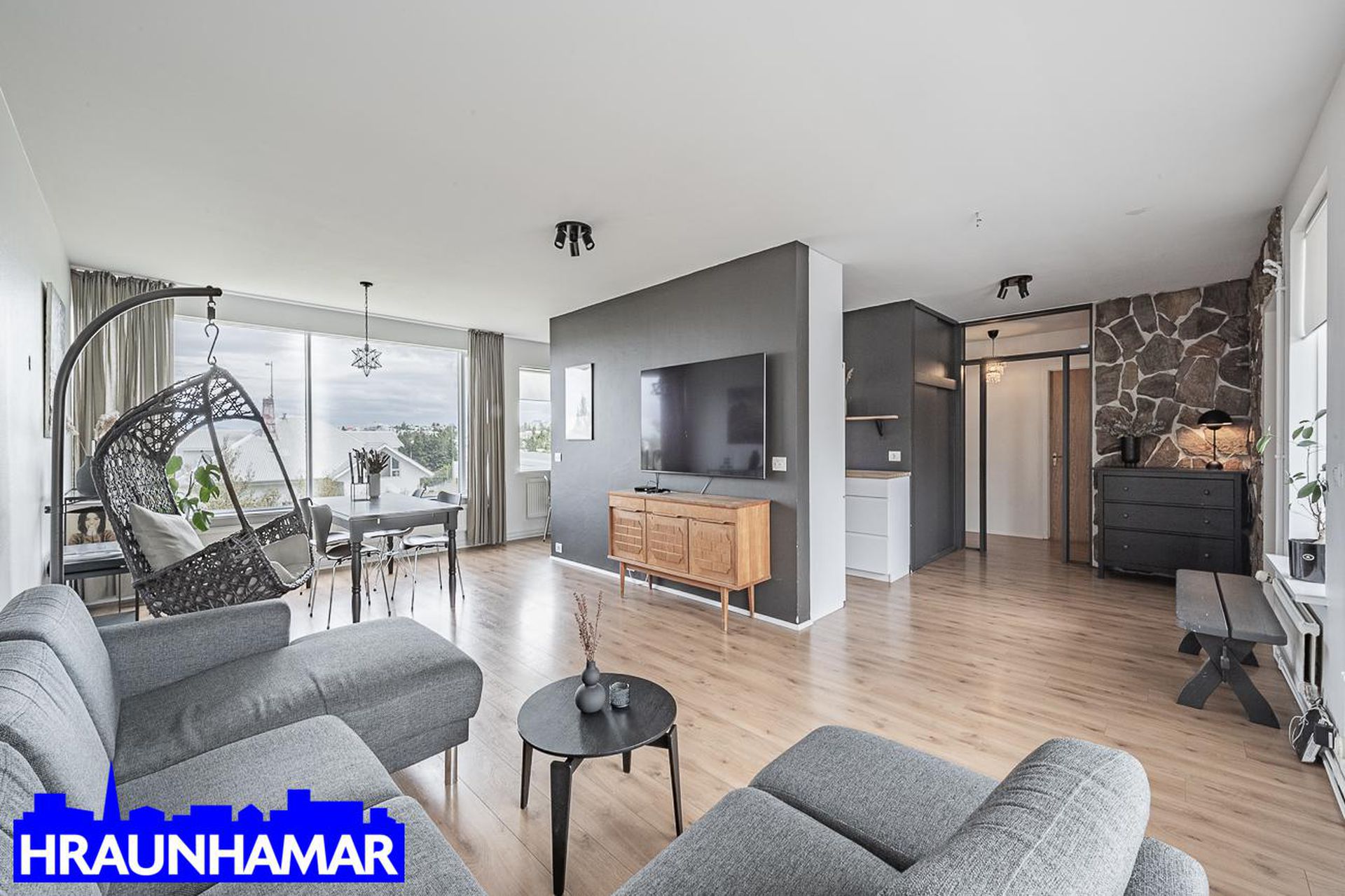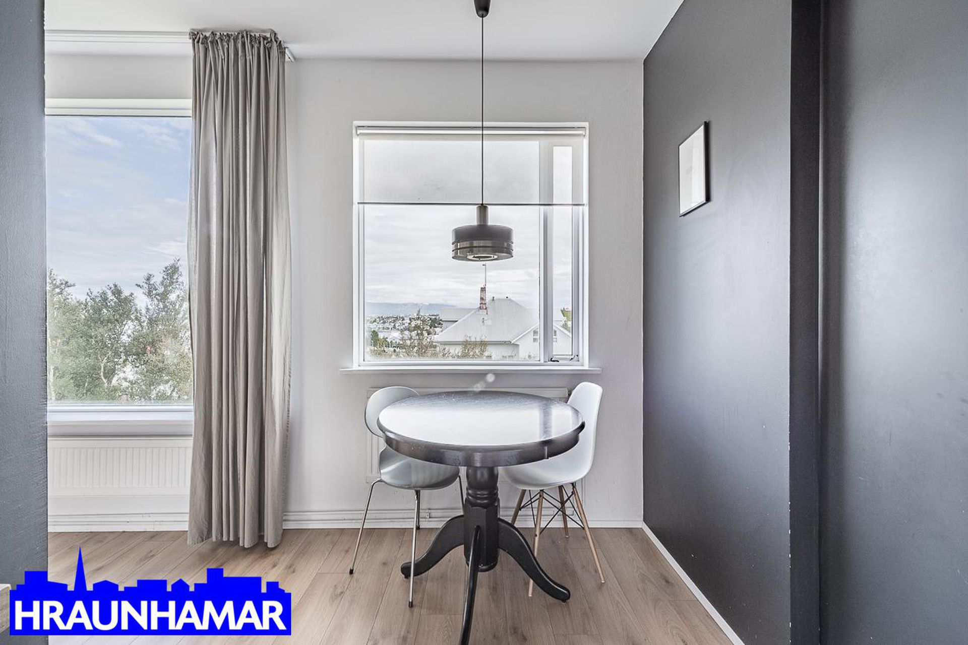 Stofa- og borðstofa: Mikið og fallegt útsýni í átt að gamla bænum í Hafnarfirði og að Esju. Frá stofu er gengið út á svalir sem snúa í suð-vestur. Parket á gólfi.