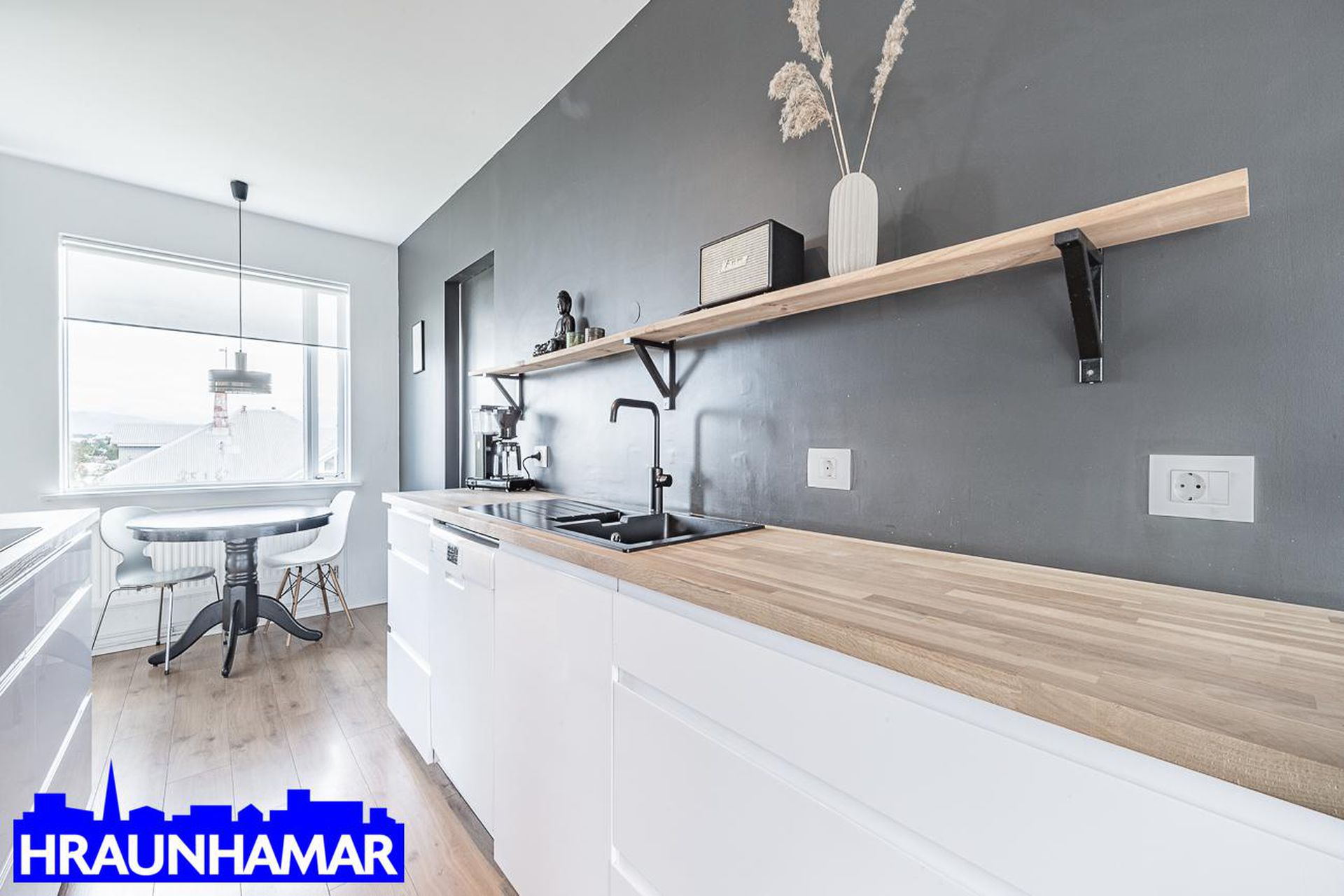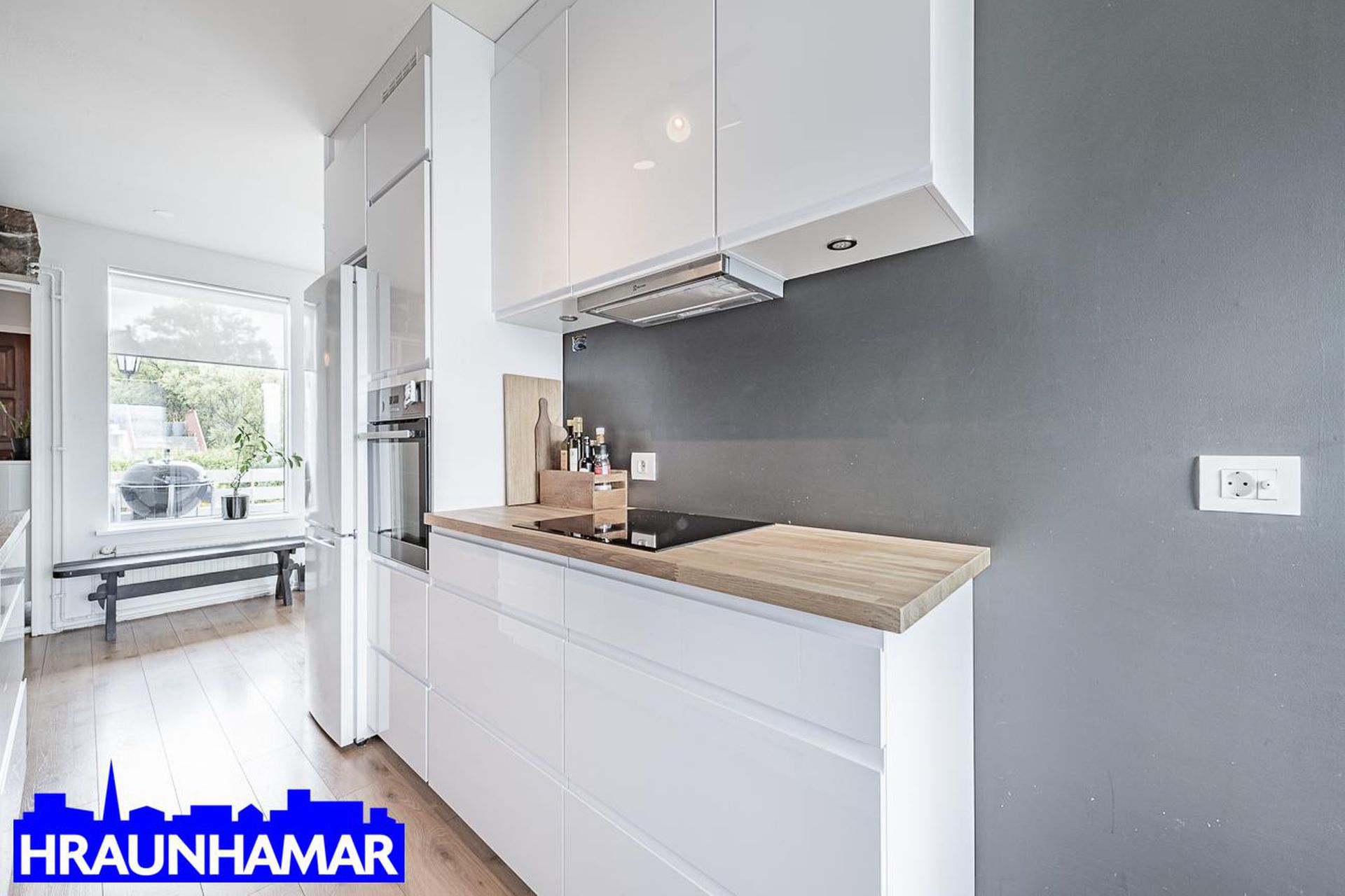 Eldhús: Hvít eldhúsinnrétting með góðu vinnuplássi. Parket á gólfi.