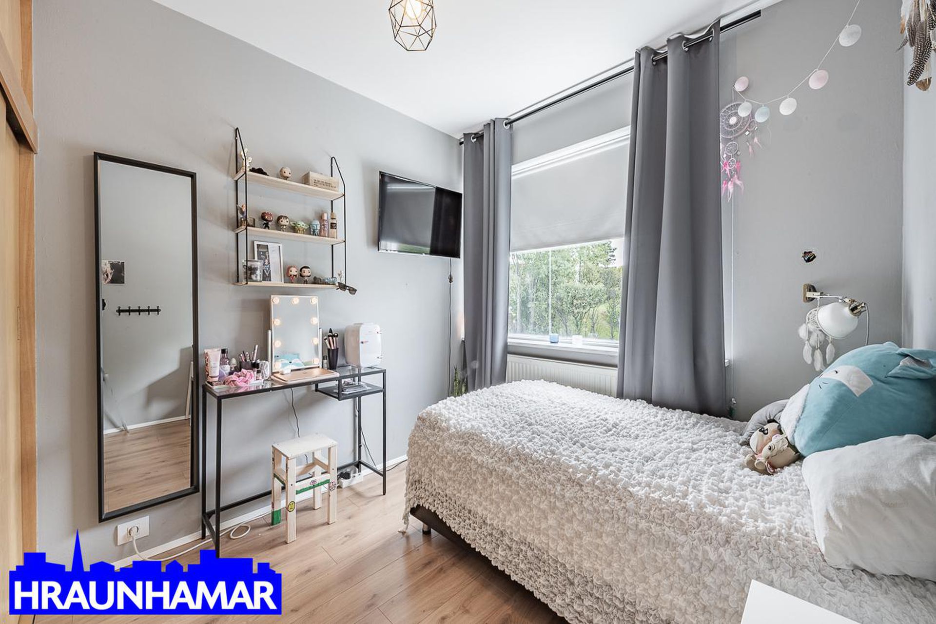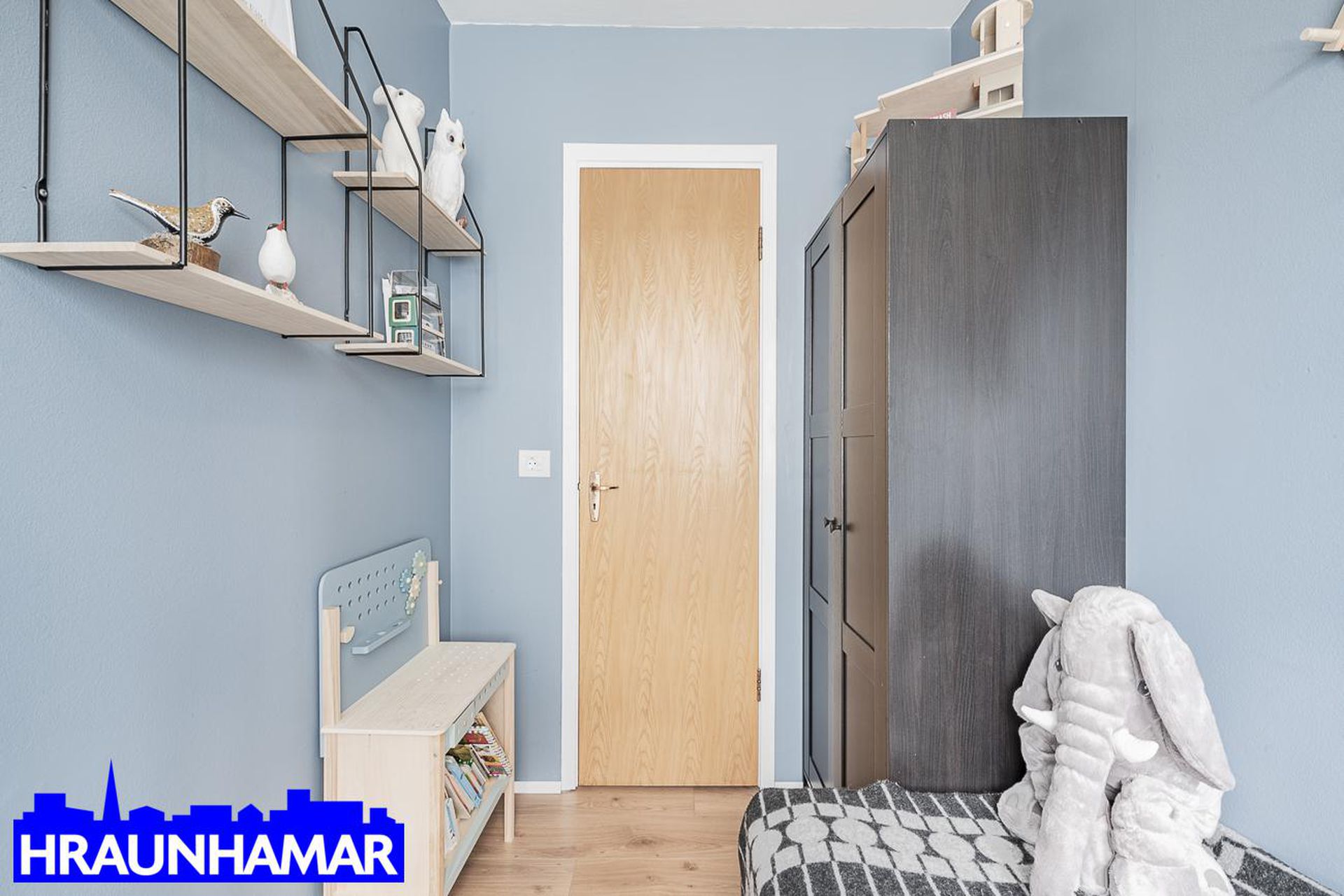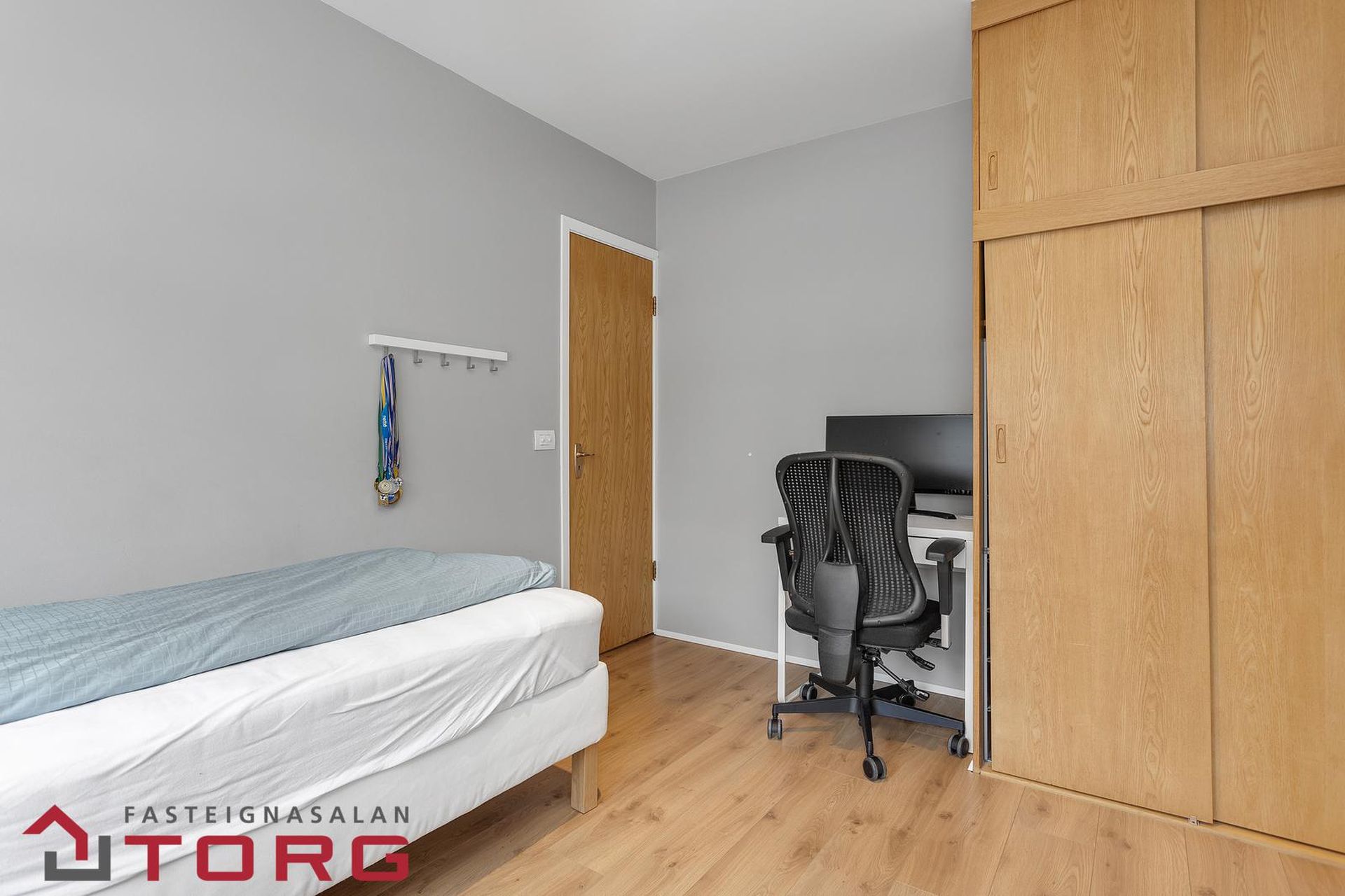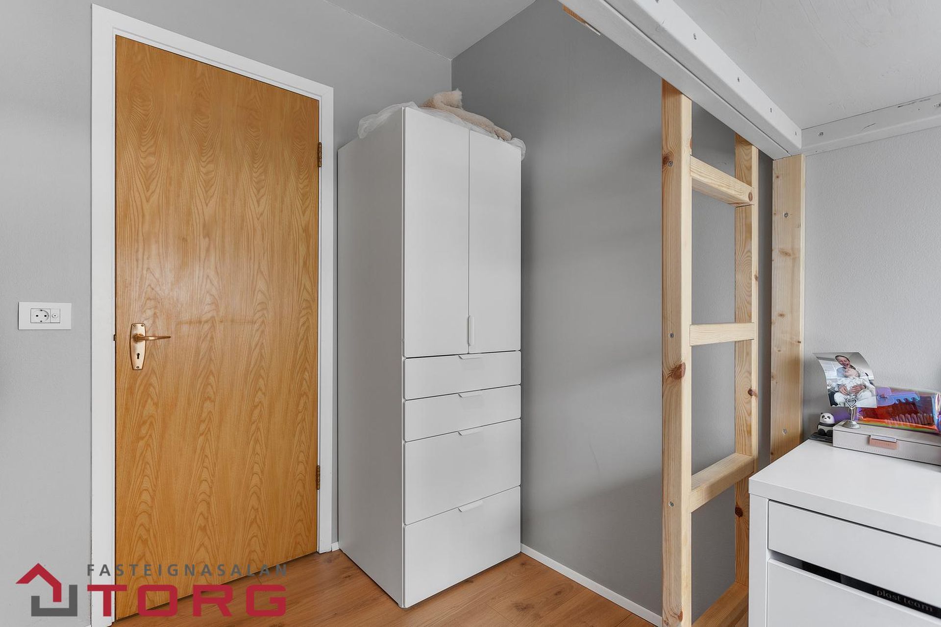 Herbergi III: Parket á gólfi og fataskápur.