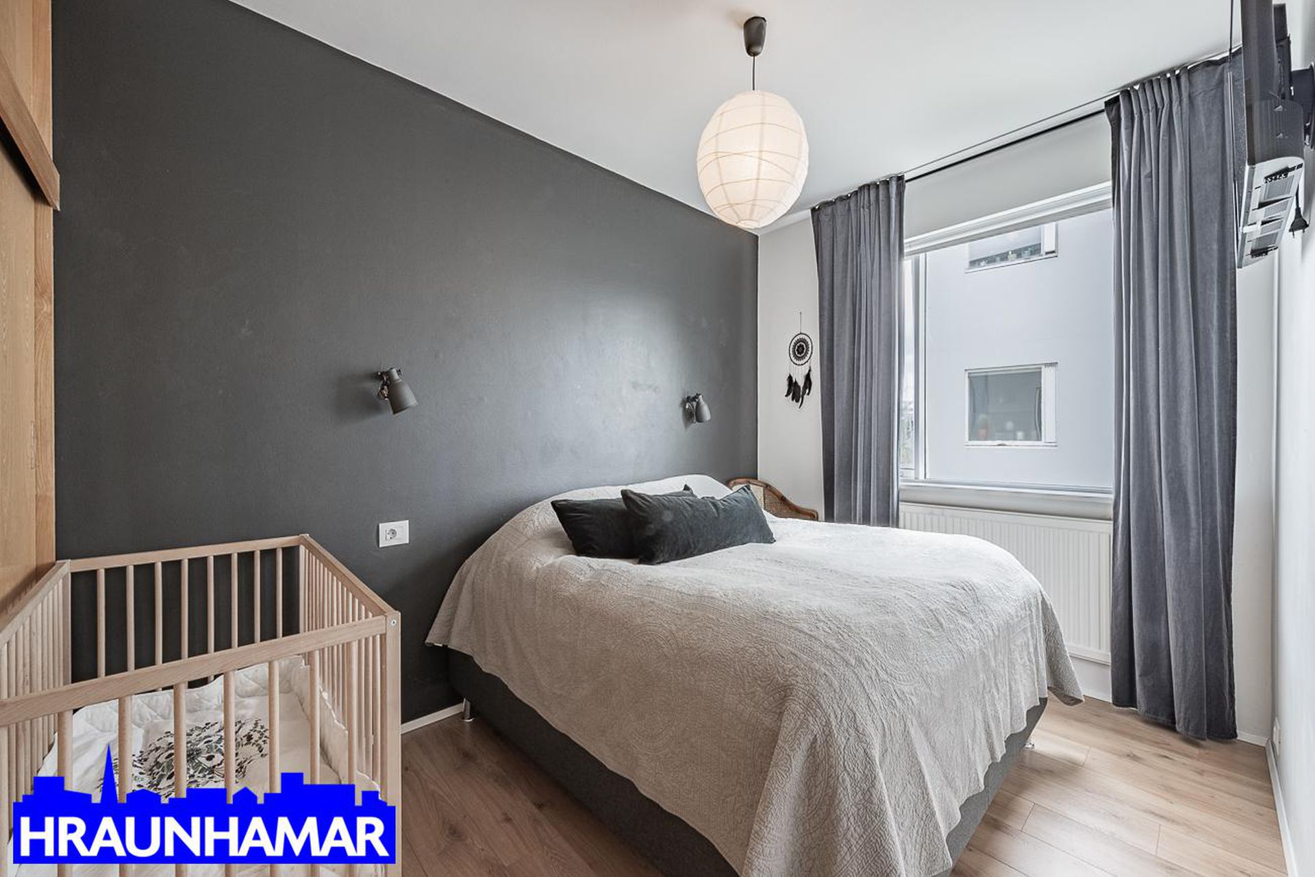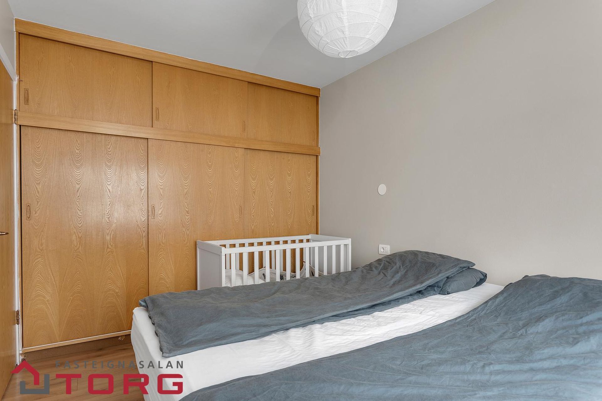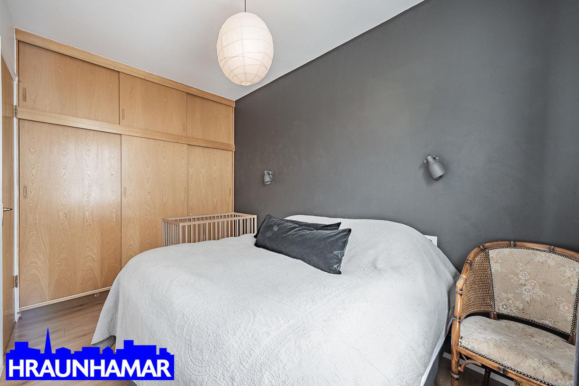 Hjónaherbergi: Parket á gólfi og fataskápar.