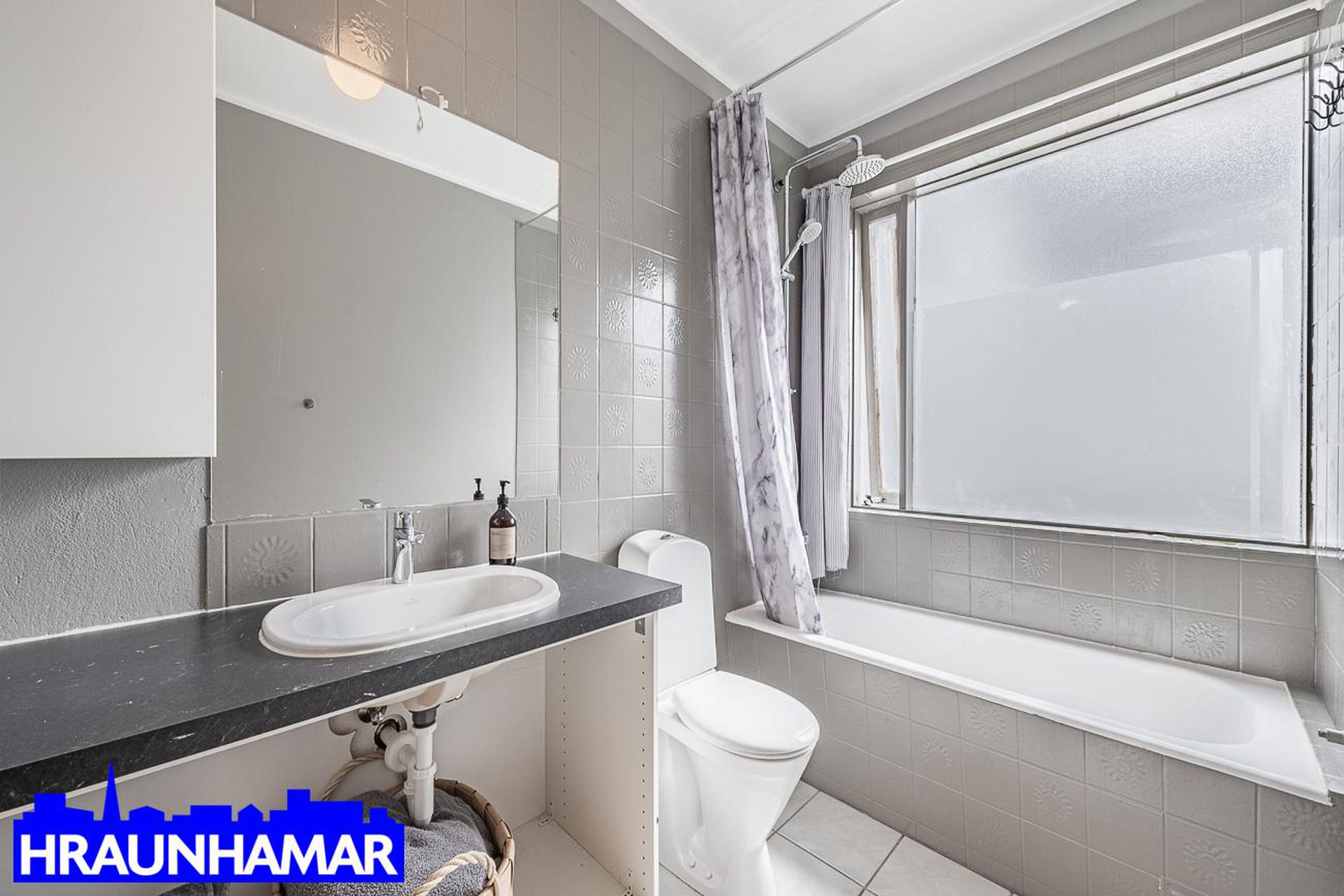 Baðherbergi: Baðkar með sturtuaðstöðu. Flísar á gólfi og veggjum.