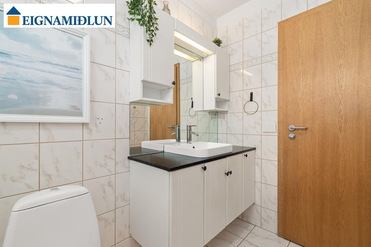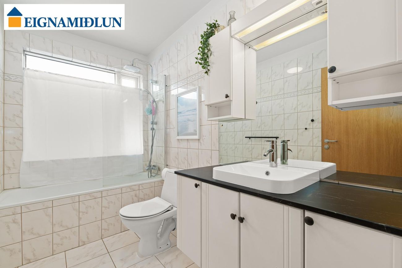 Baðherbergi: Flísalagt í hólf og gólf með salerni, innréttingu og baðkari með sturtuaðstöðu. Góður gluggi.