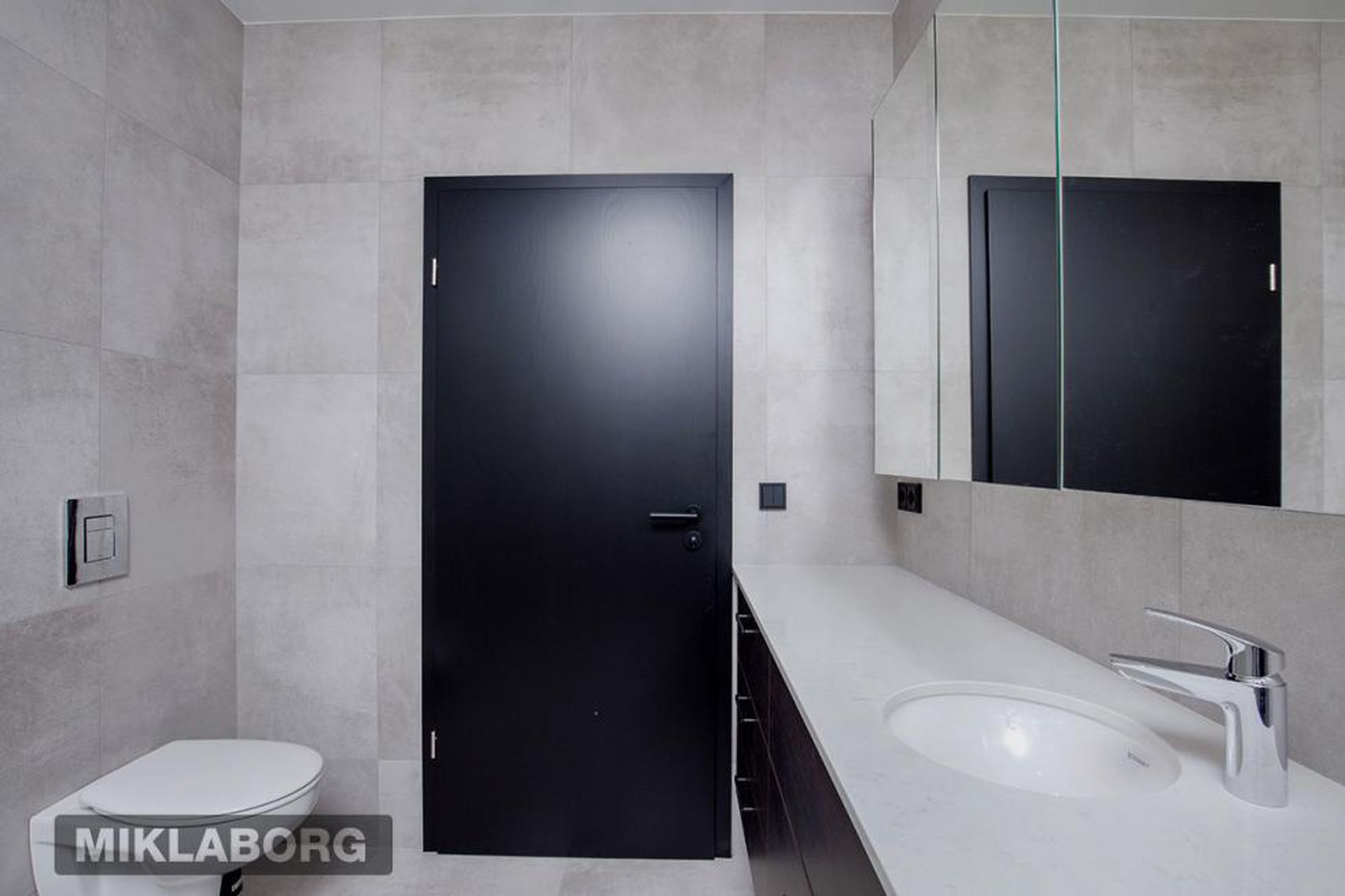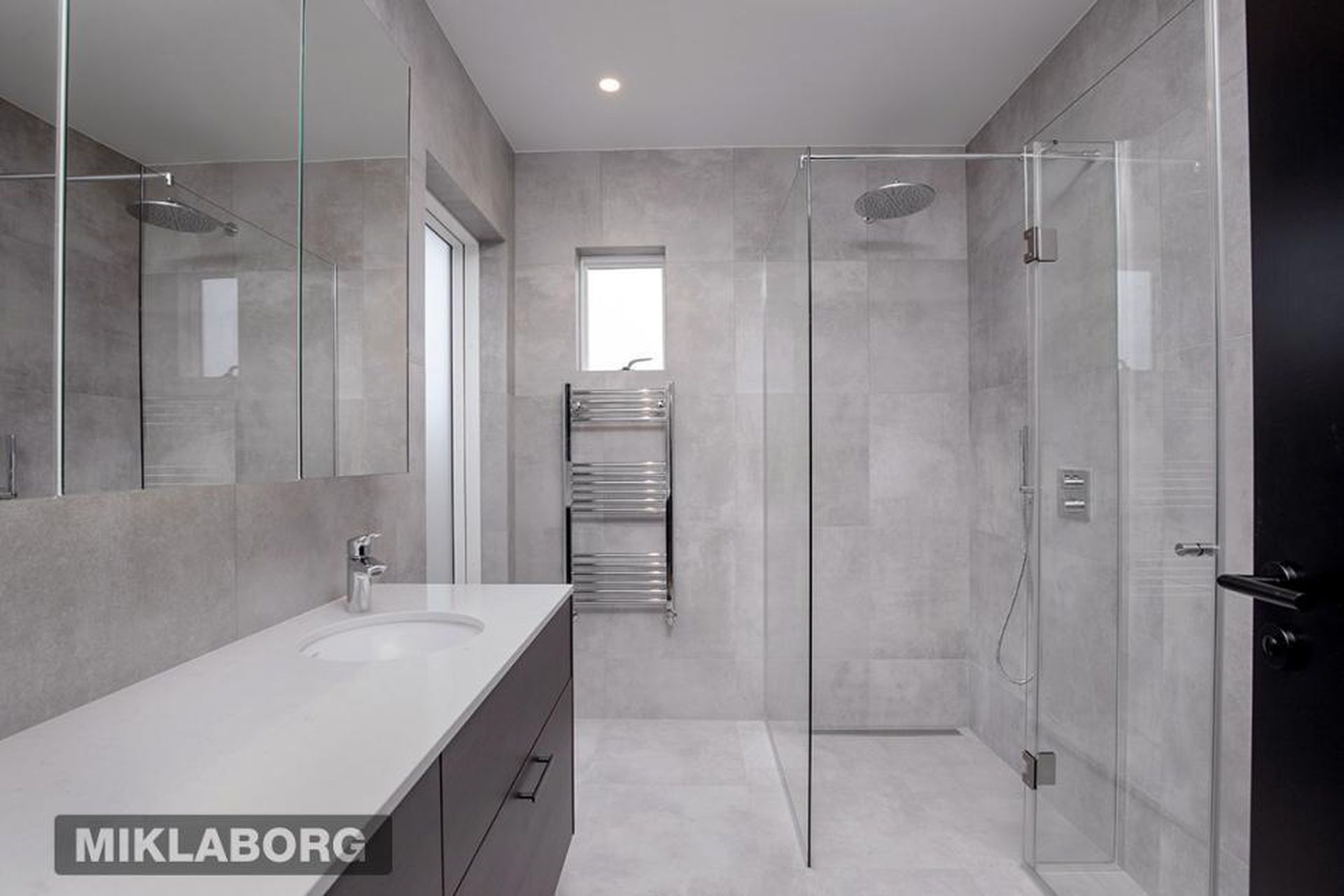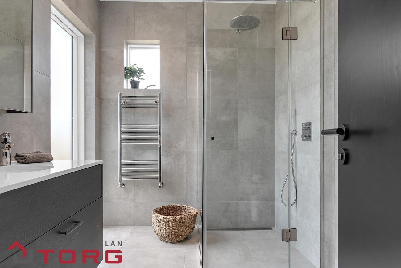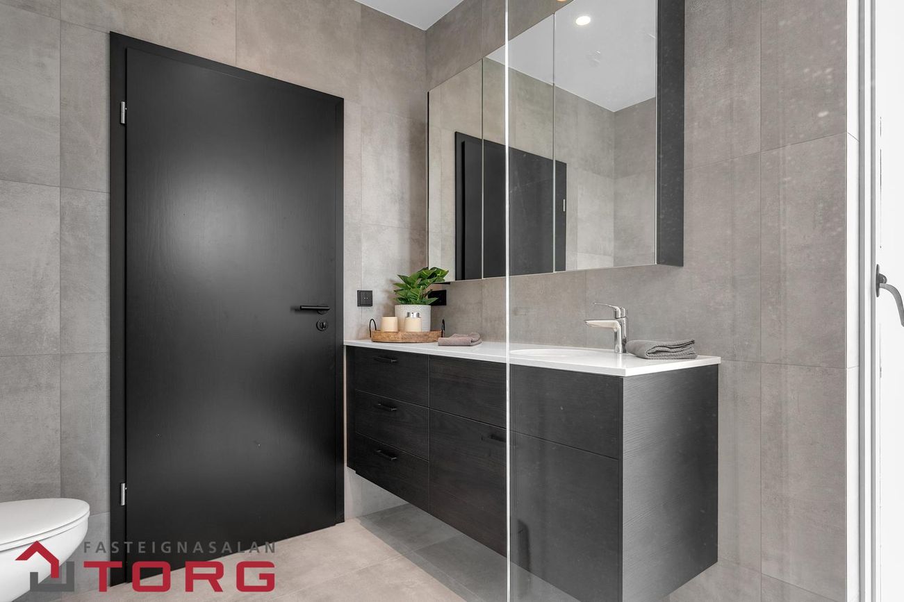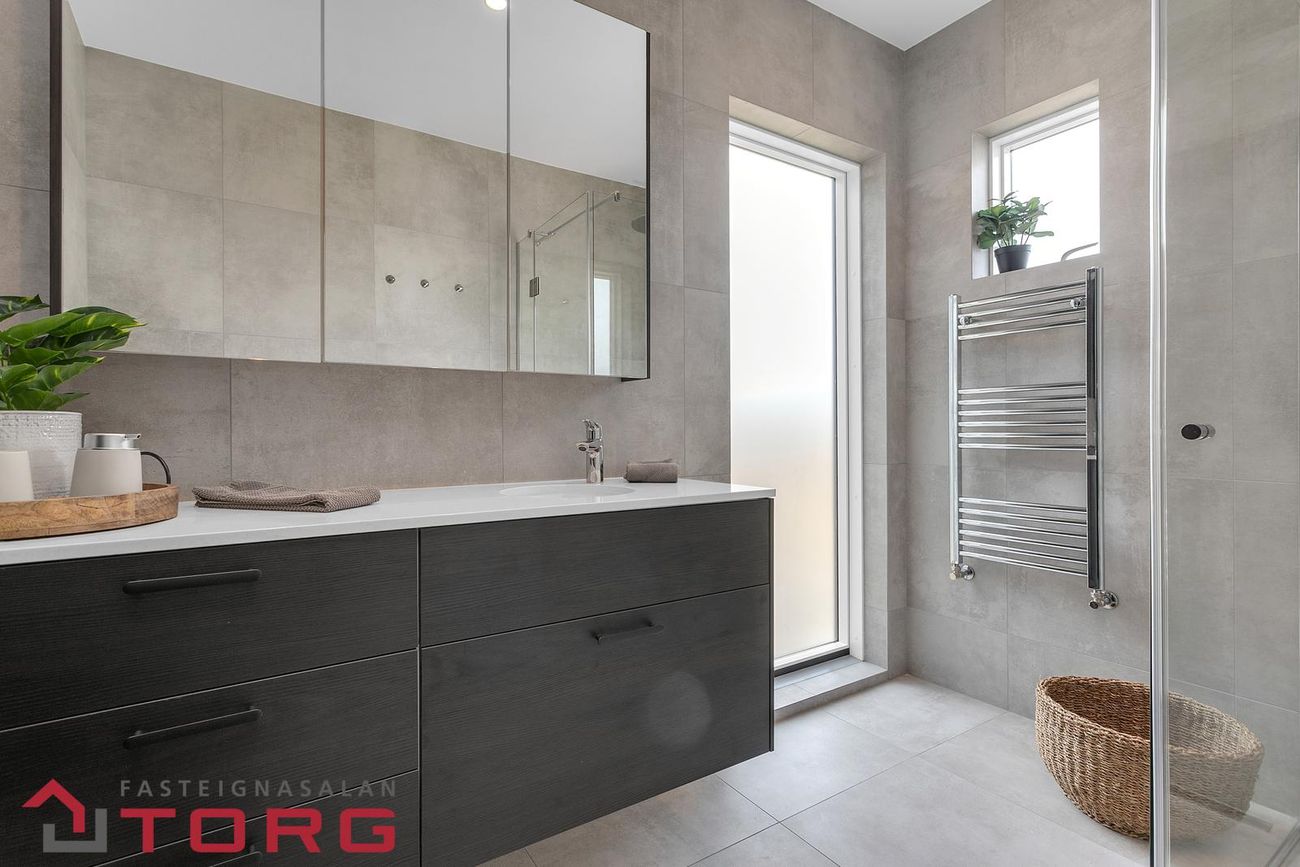 Baðherbergi er flísalagt í hólf og gólf, með dökkri innréttingu, stein á borði með innfelldum vask og sturtu. Upphengt klósett og innbyggður kassi. Útgengt er af baðherbergi á verönd.