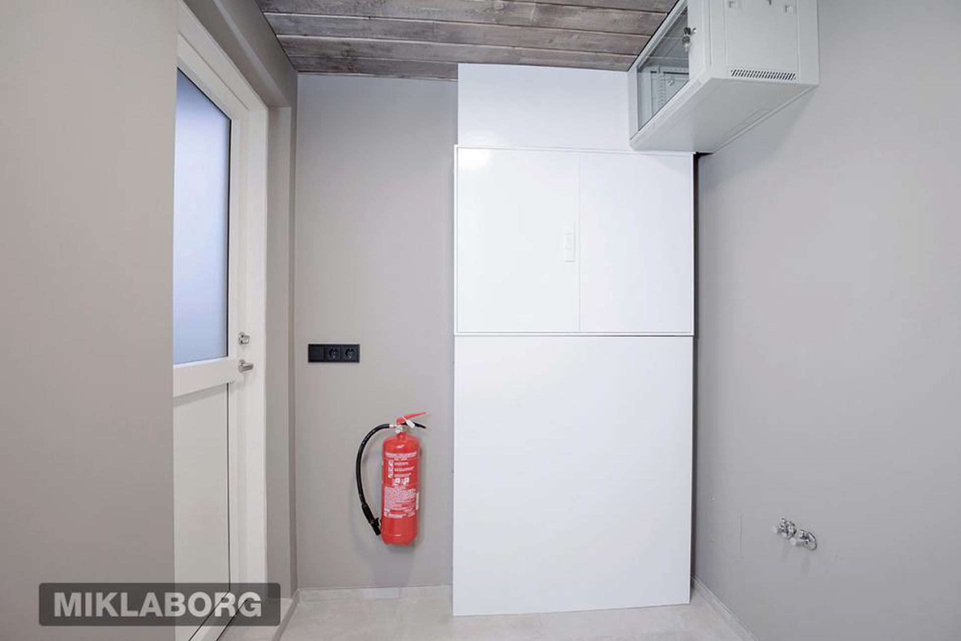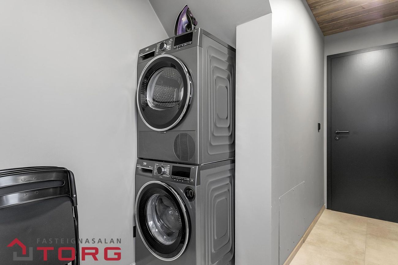 Þvottahús er með flísum á gólfi og engi er fyrir þvottavél og þurrkara.